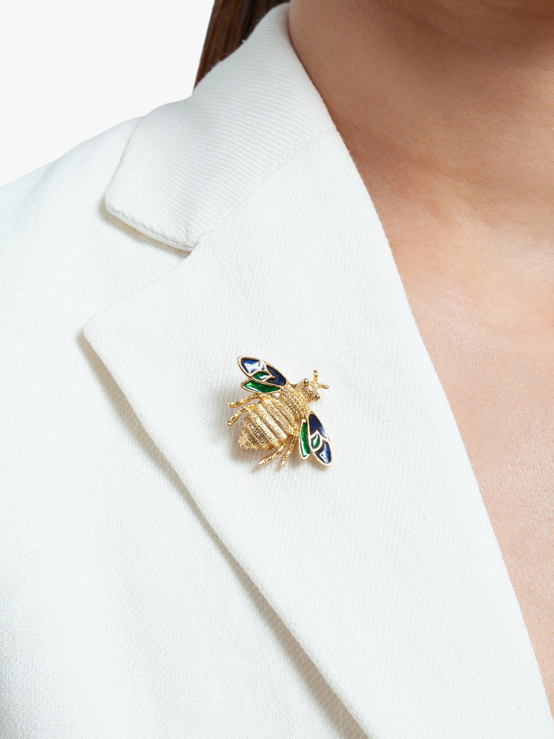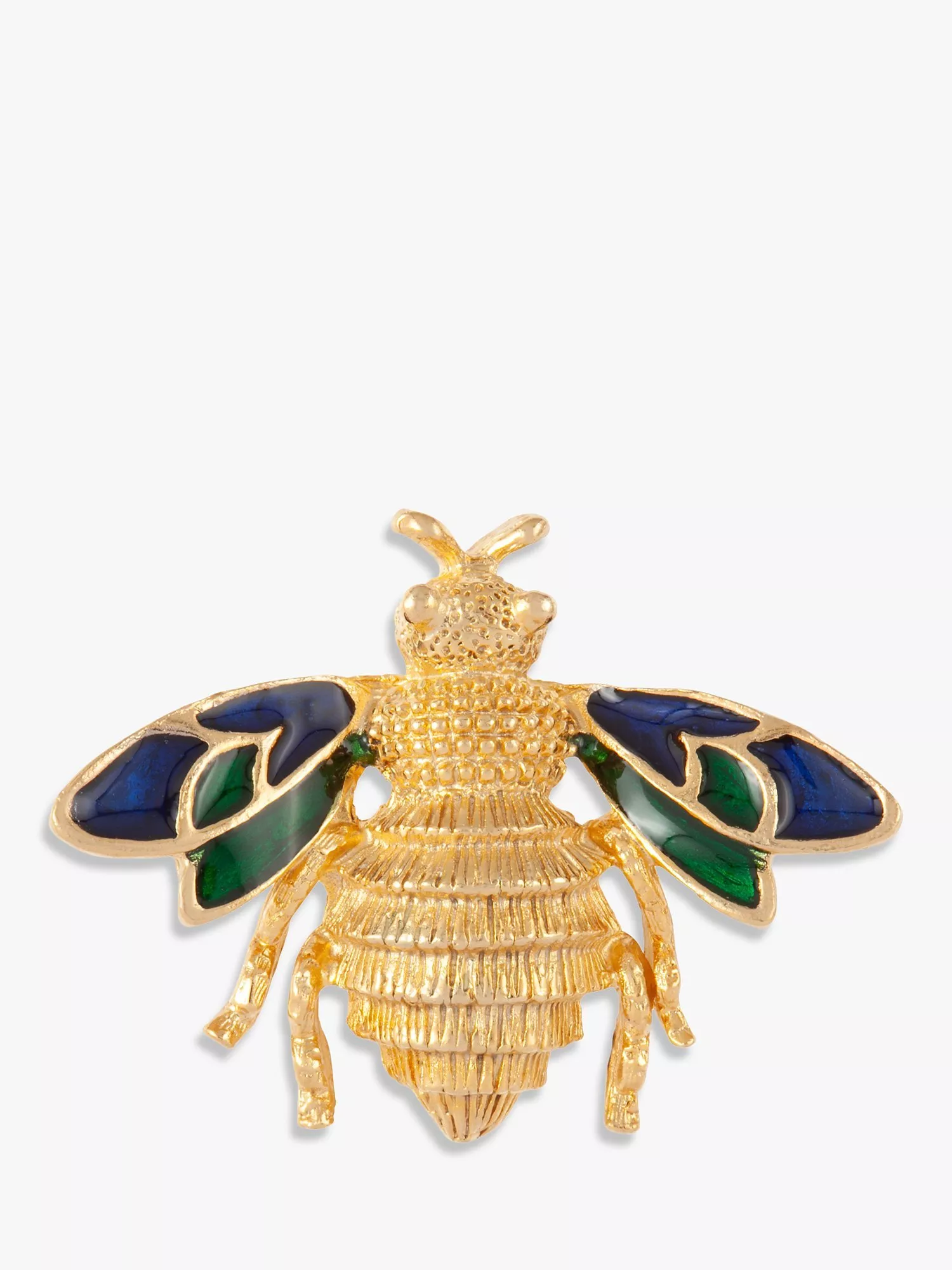 This gold-plated bee brooch features green and blue enamel wings with intricate detailing. It closes with a safety-catch pin.