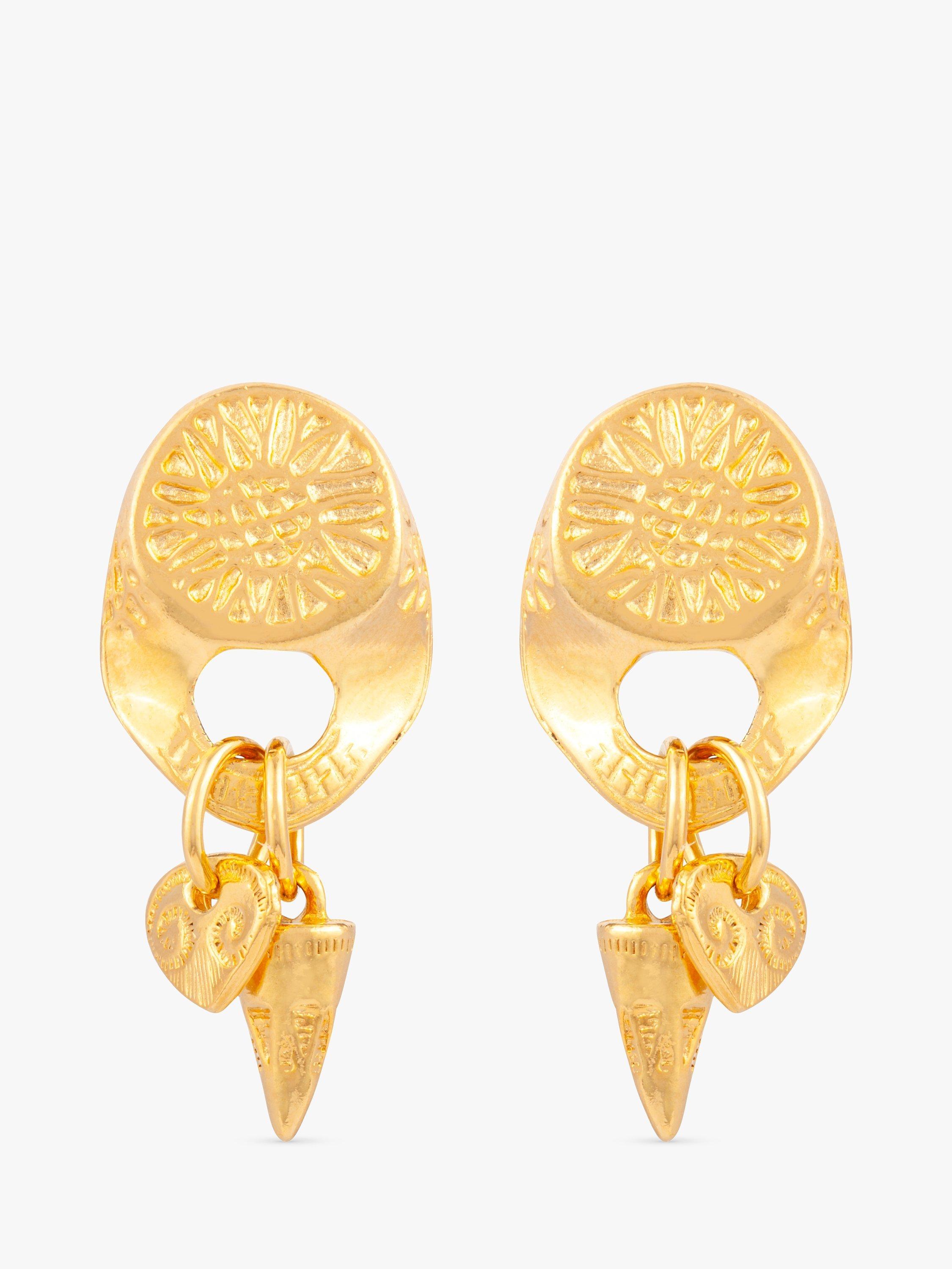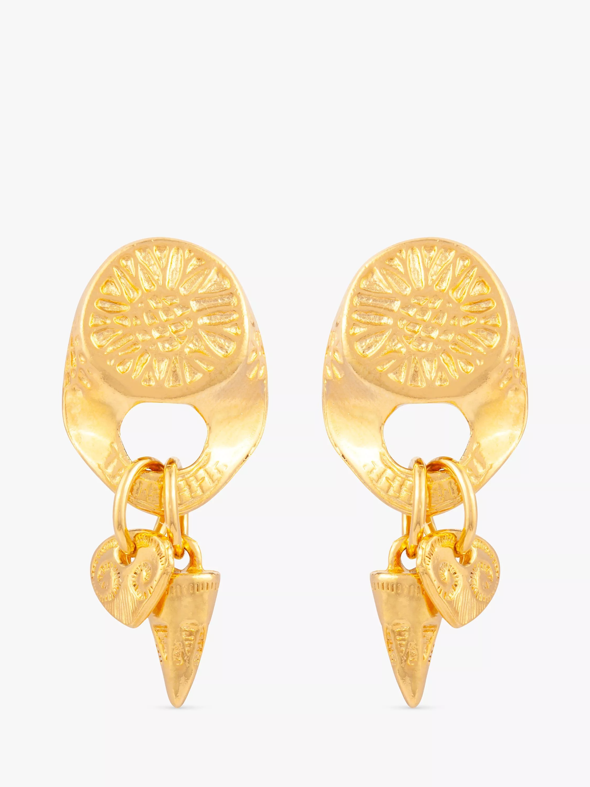 With tribal-inspired engravings and two drop charms, these earrings make an impression. Secured with clip-on fastenings, they can be worn by anyone.