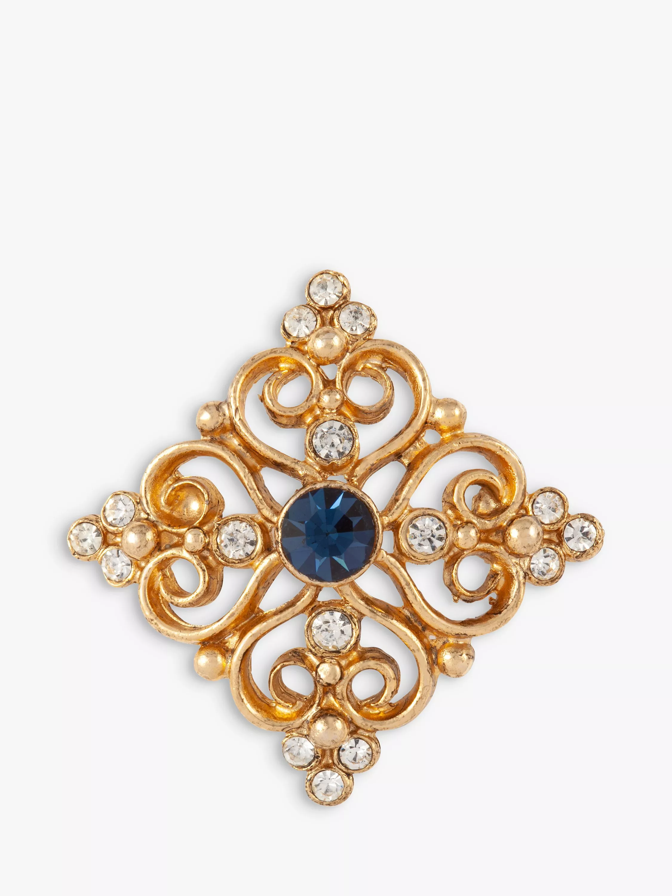Made with intricate scrollwork, this Victorian revival brooch features a central sapphire as well as other sparkling Swarovski crystals scattered throughout. It is secured with a safety-catch pin closure to the back.