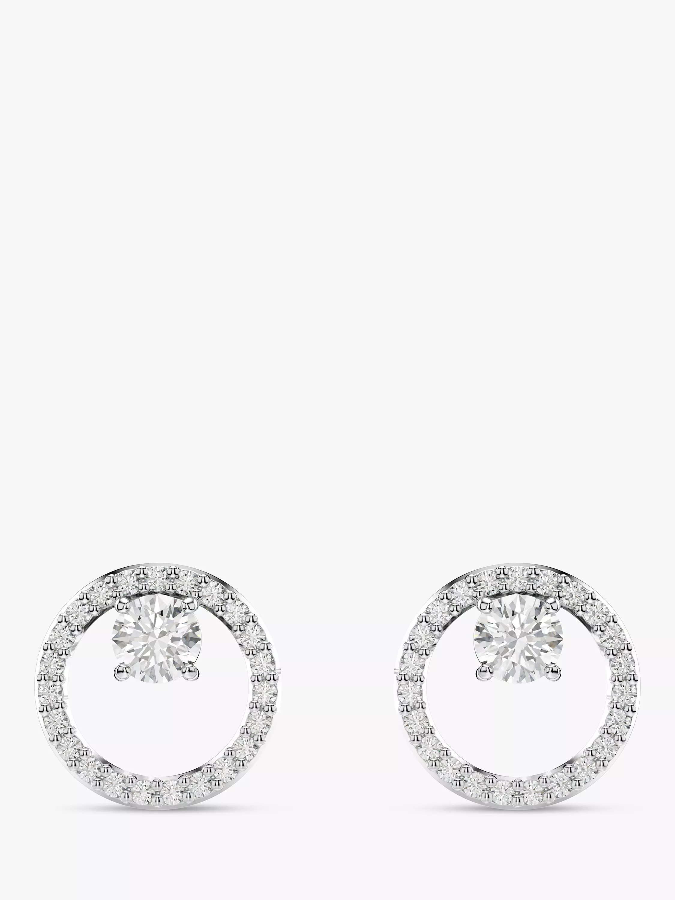 These refined circle studs exude timeless elegance. Each pierced piece is rhodium plated and features a central pavé ring of clear Swarovski Zirconia as well as a single prong-set Swarovski Zirconia placed in the middle.