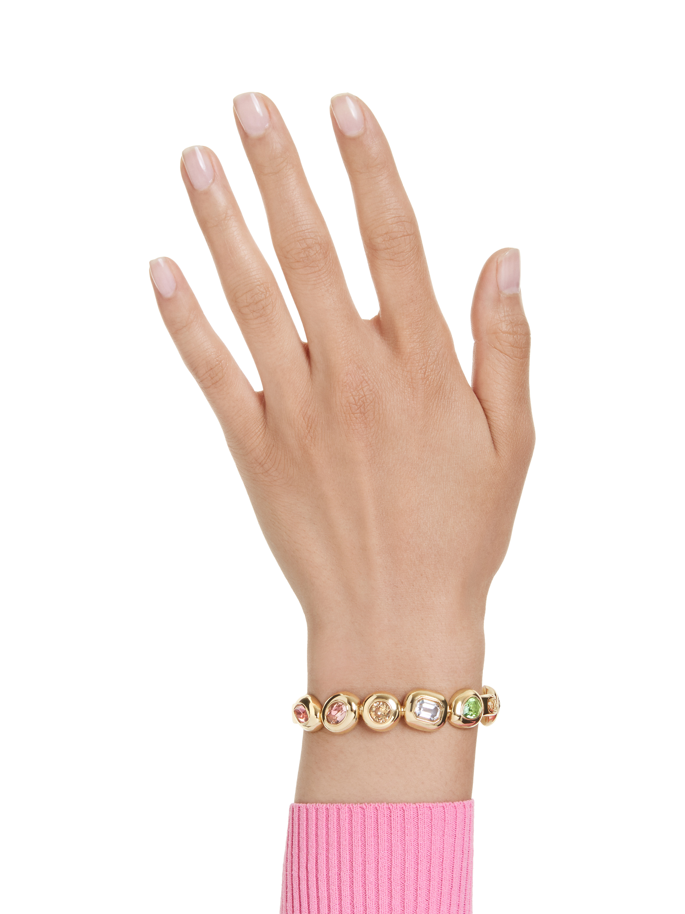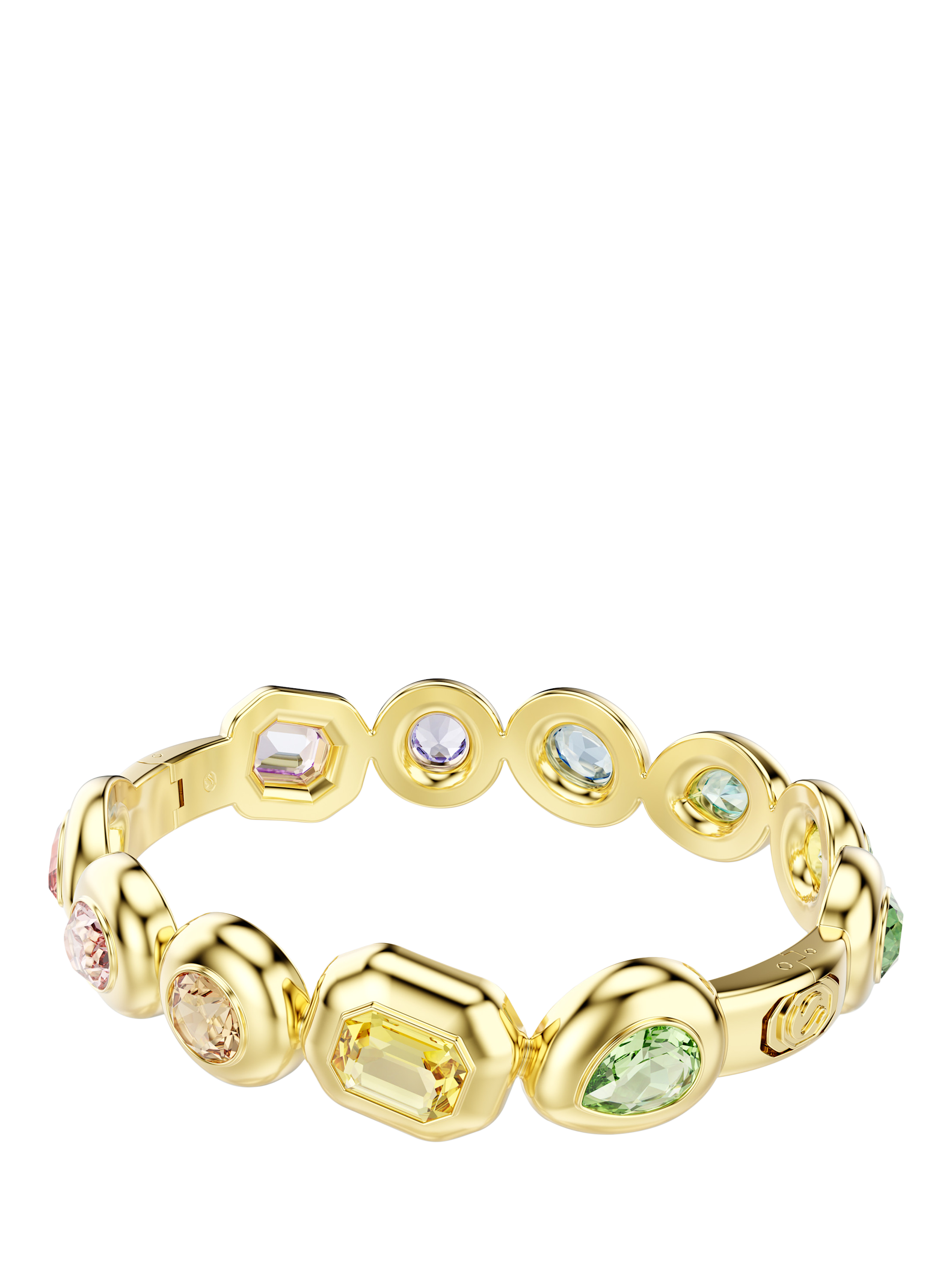 The Gema bangle is a true statement piece, adorned with multicoloured gemstones. Decorated with bold yet sophisticated mixed cuts, the crystals are set within shiny gold plating.