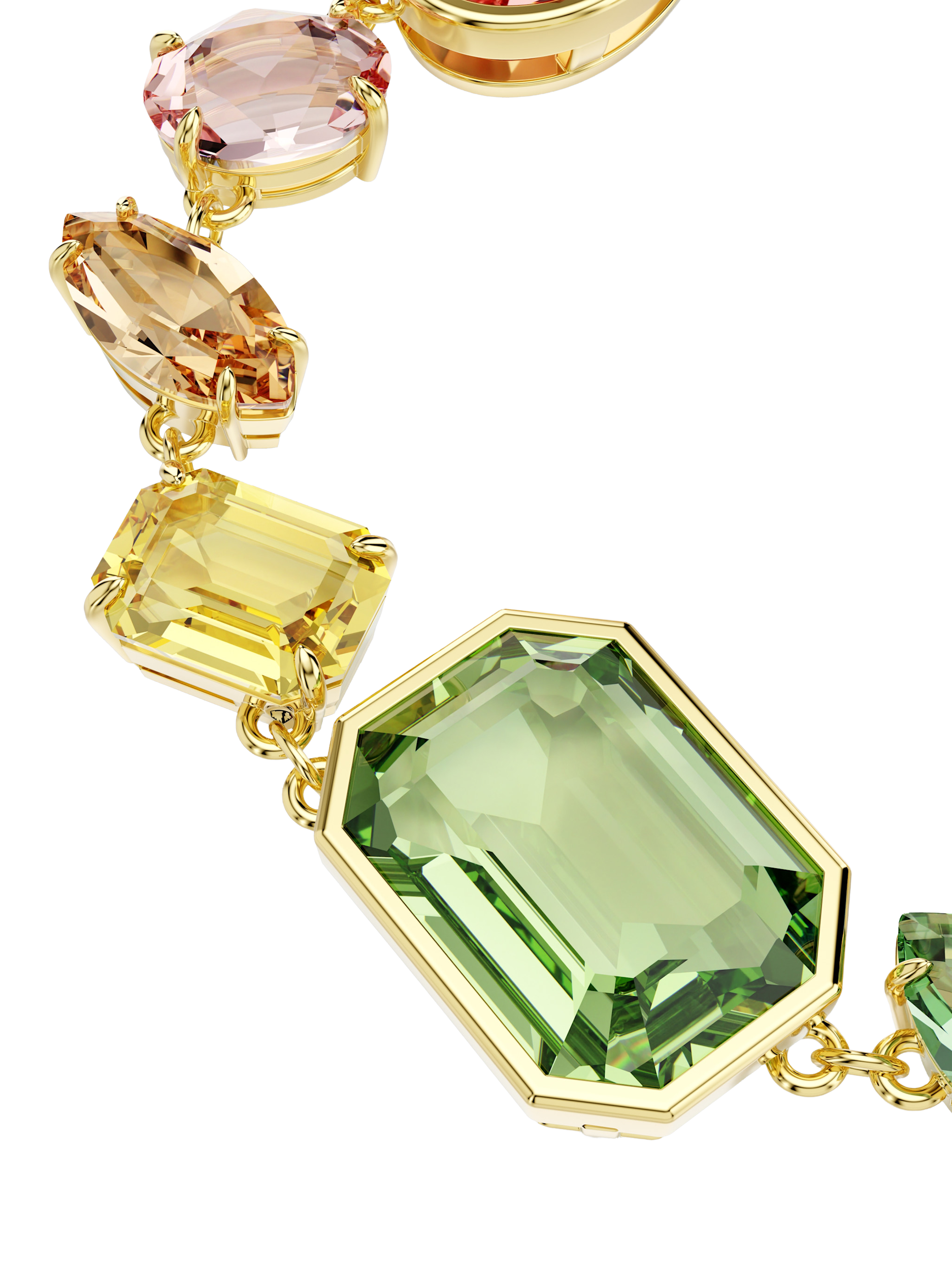 The Gema bracelet is a true statement piece, adorned with multicoloured gemstones. Decorated with bold yet sophisticated mixed cuts, the crystals are set within a gold-plated chain, finished with an adjustable lobster clasp for the perfect fit.