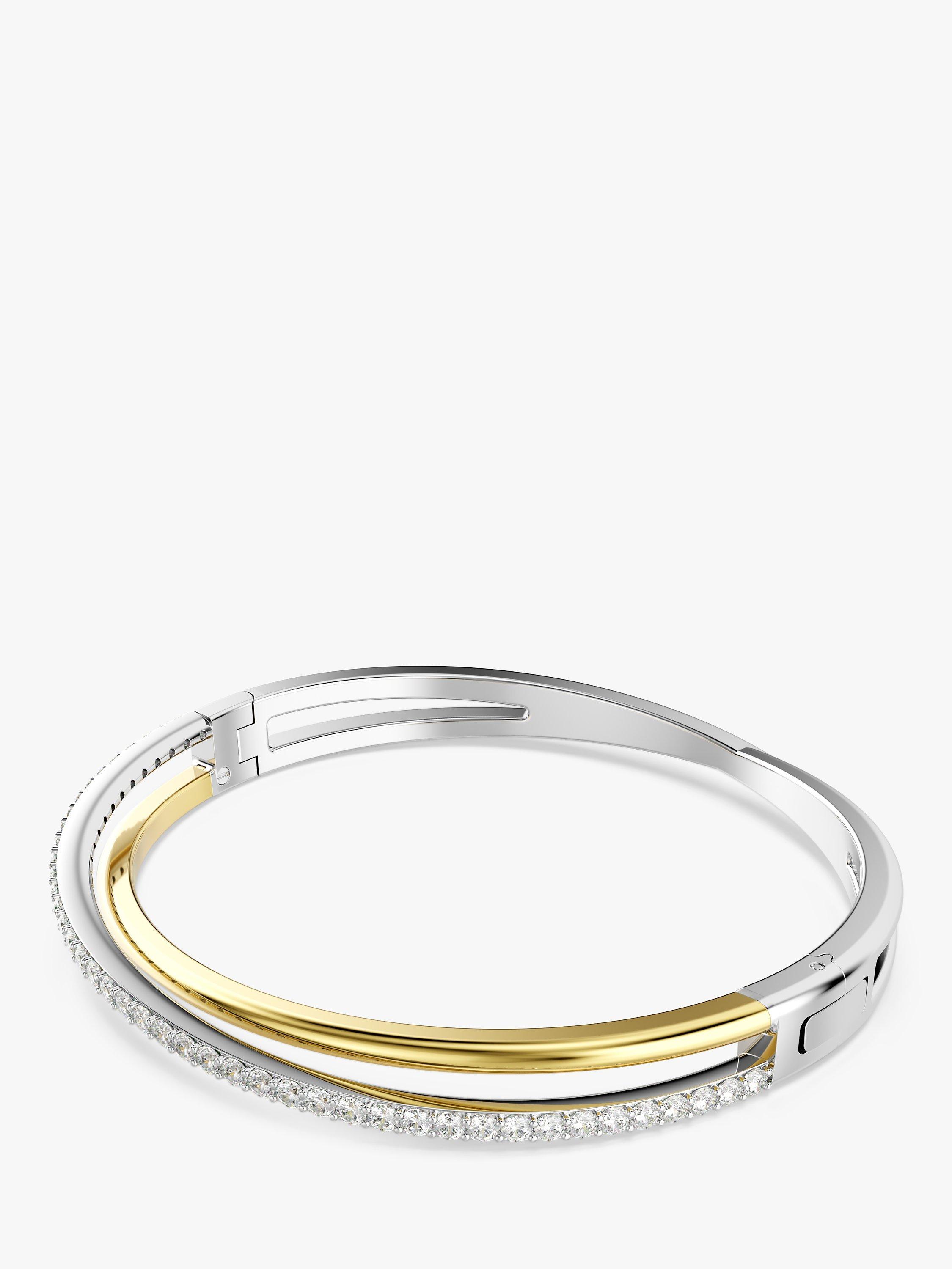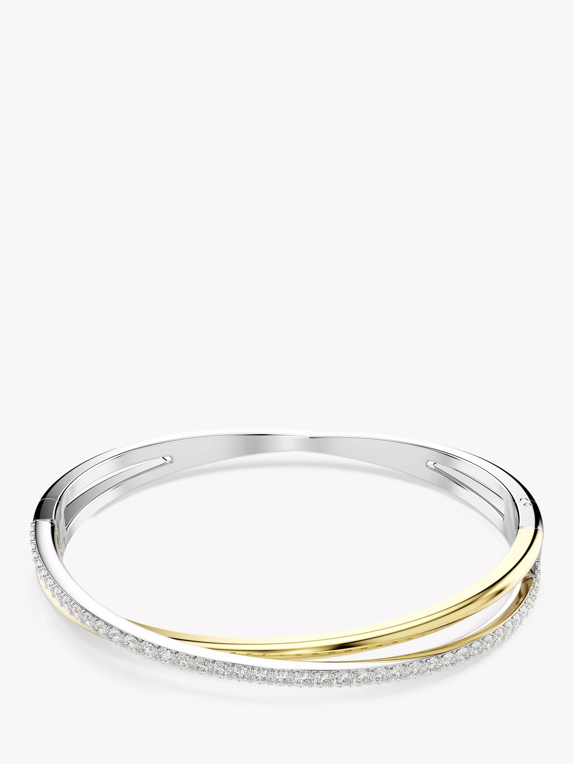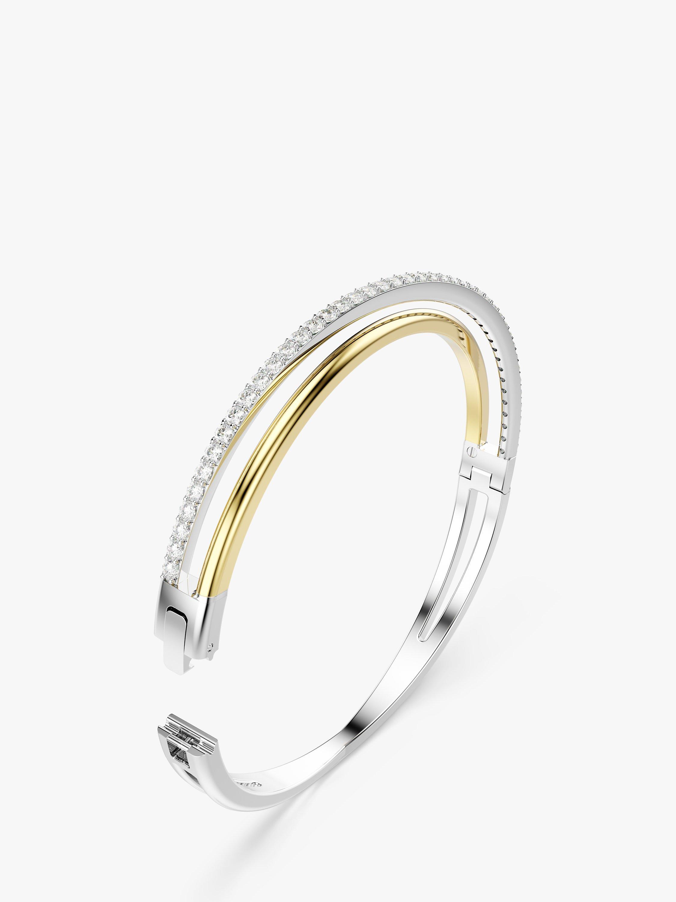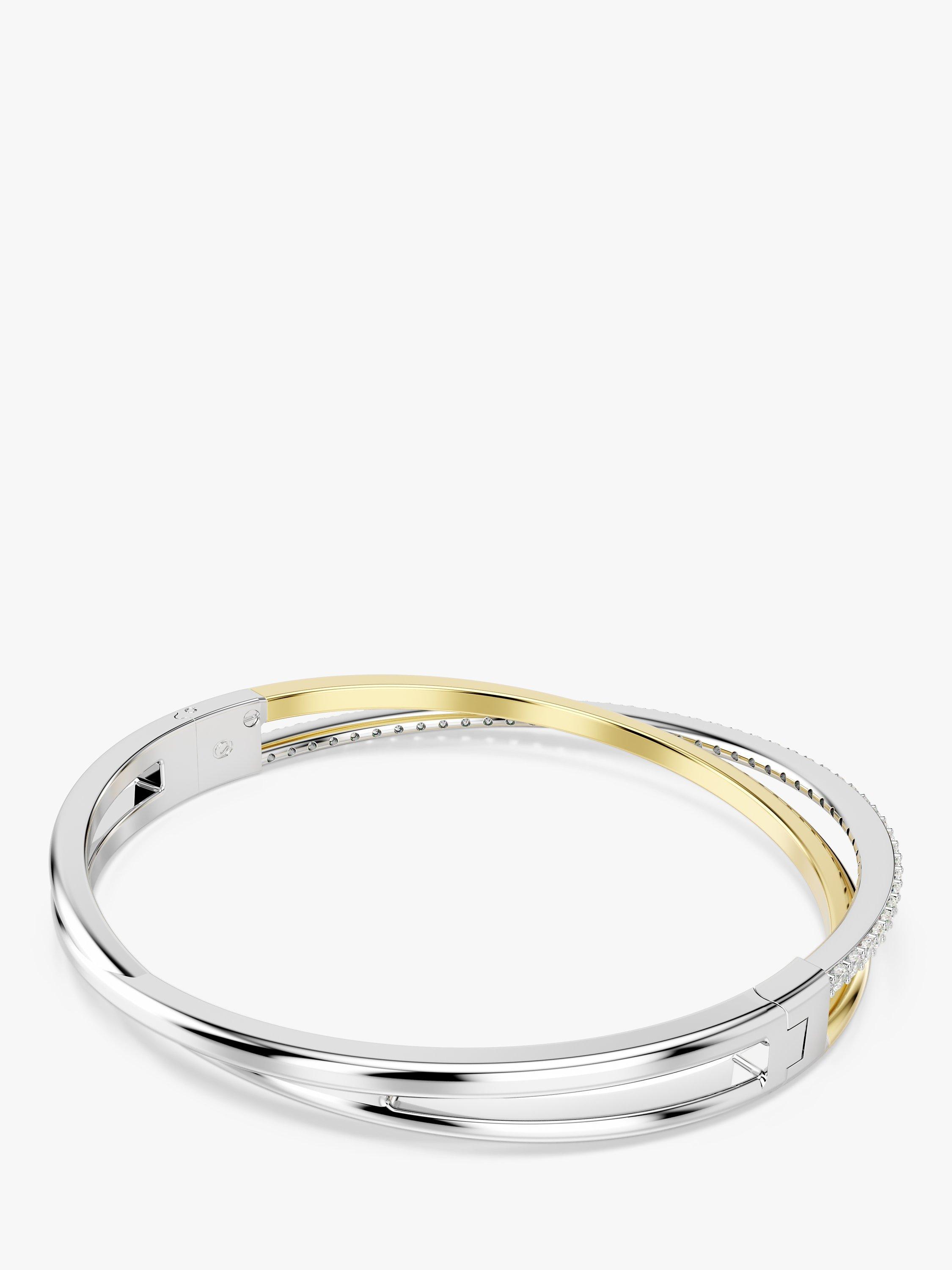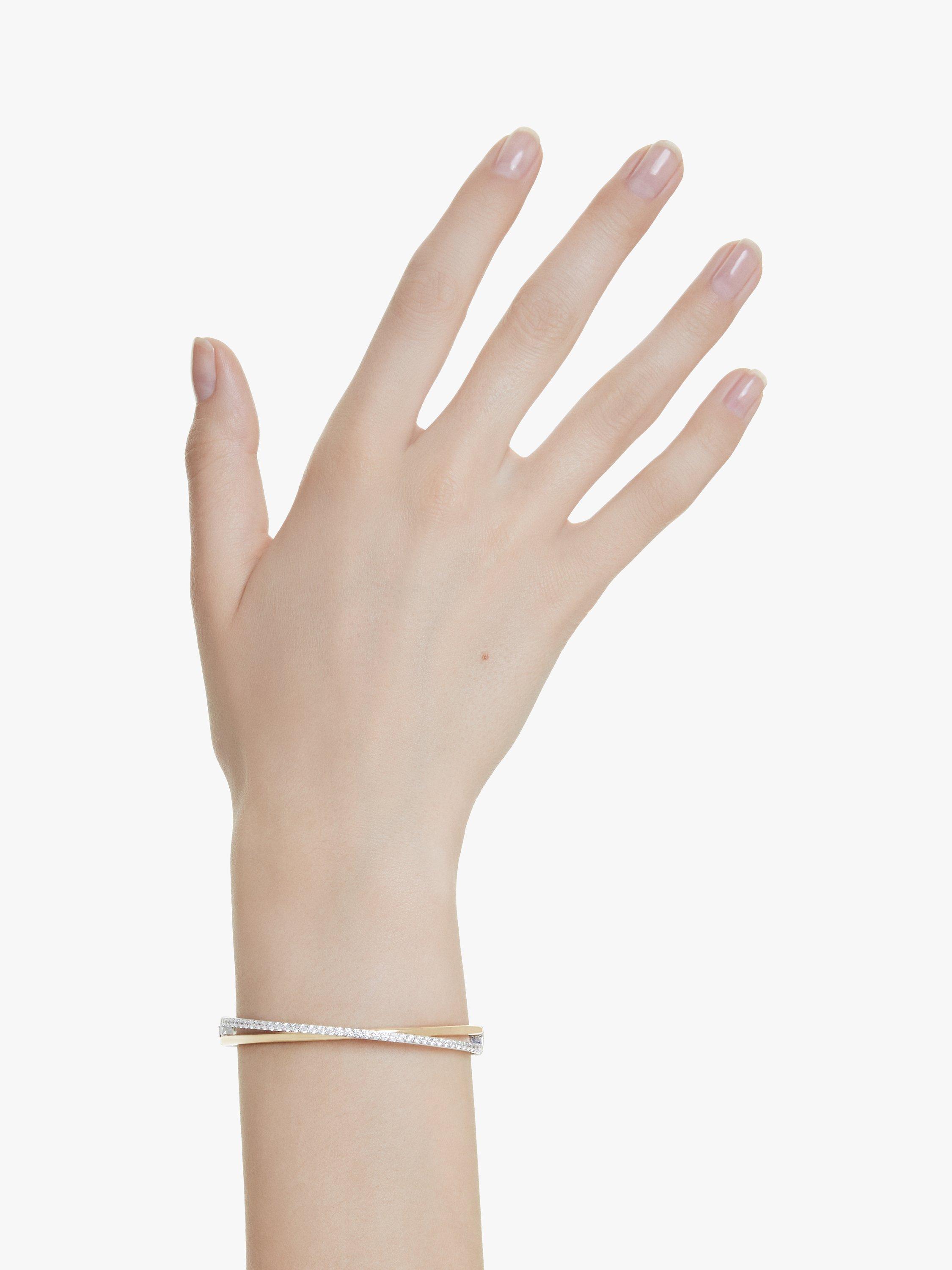 This twisting Hyperbola bangle is crafted with unmistakable Swarovski savoir-faire. The two overlapping bands are presented in a mix of gold-tone and rhodium plating, with round Swarovski Zirconia placed in a prong setting. An elegant way to inject intrigue into any outfit.
