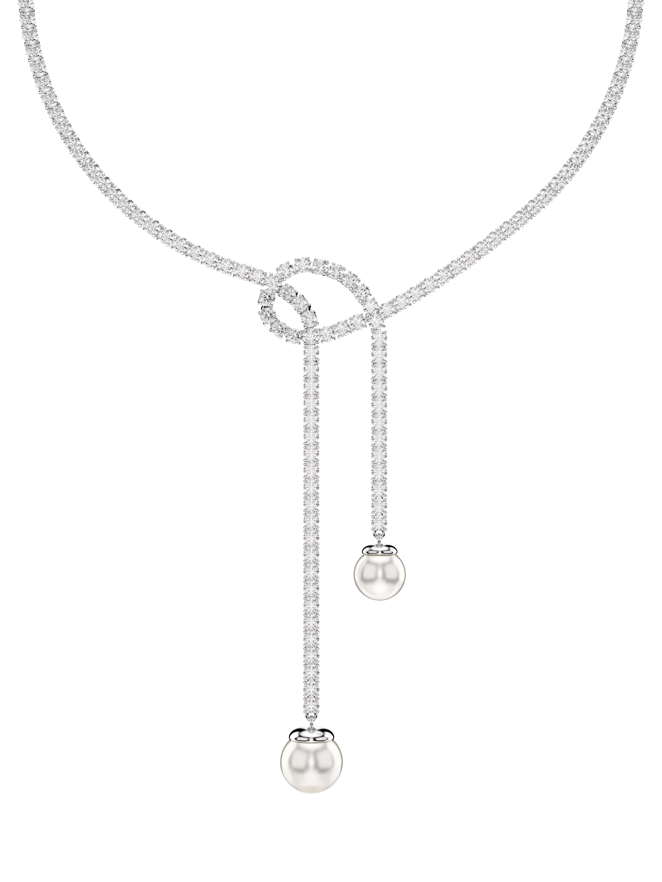 With its unique tied design, this Matrix necklace epitomizes modern chic. Combining both firm and flexible sections, the all-around strand is prong set with clear Swarovski Zirconia and embellished at each end with a white Swarovski Crystal Pearl.