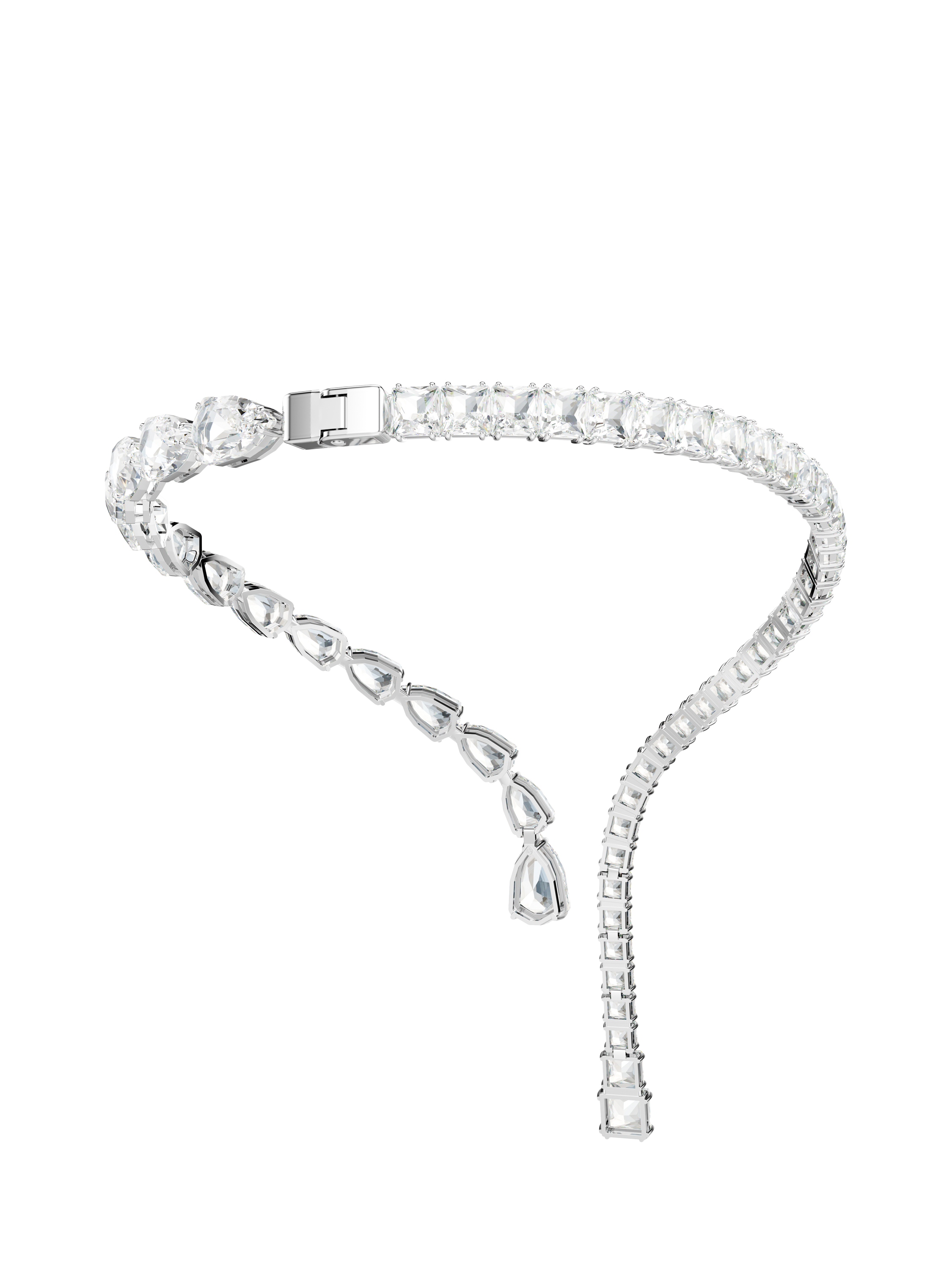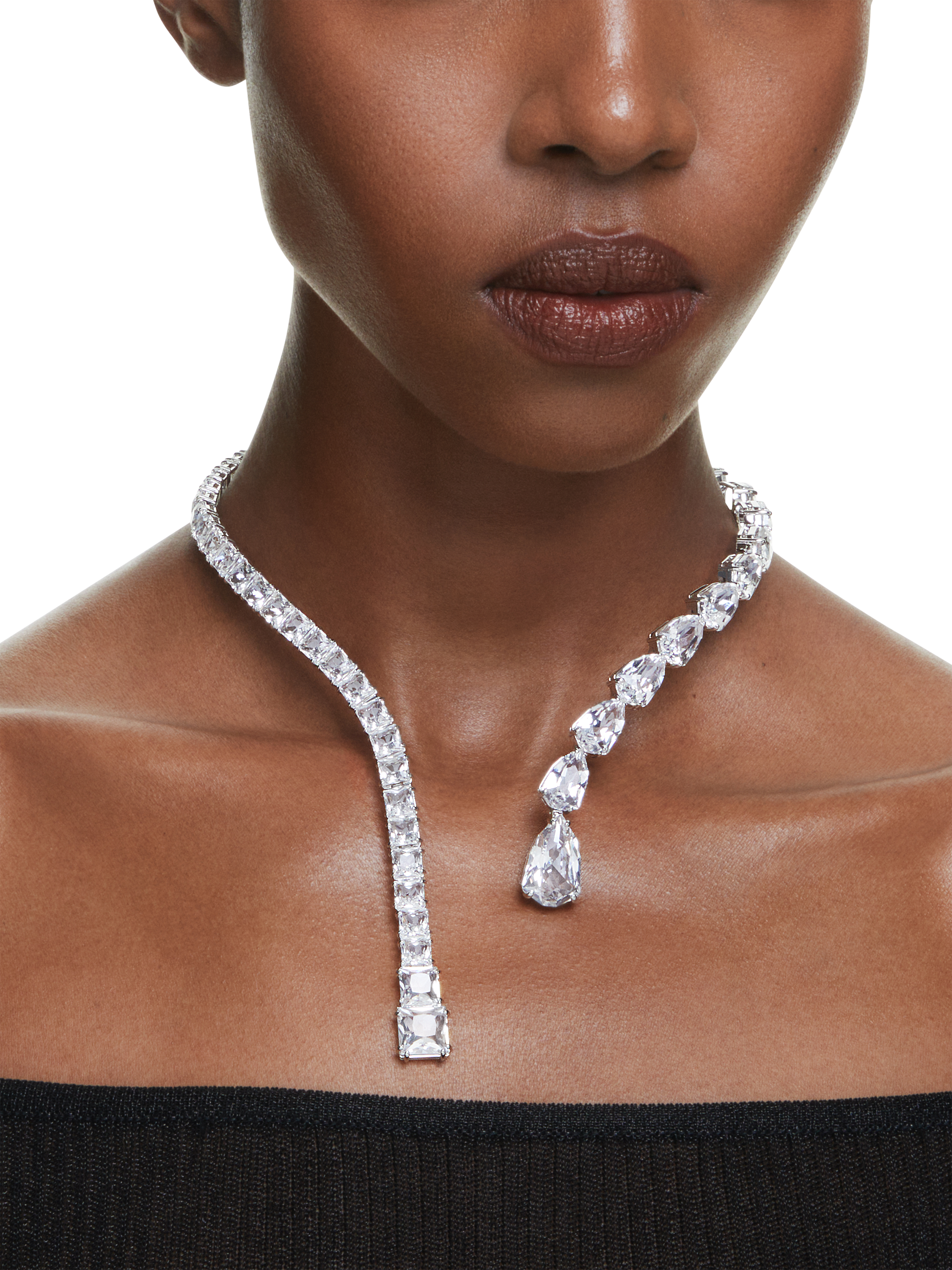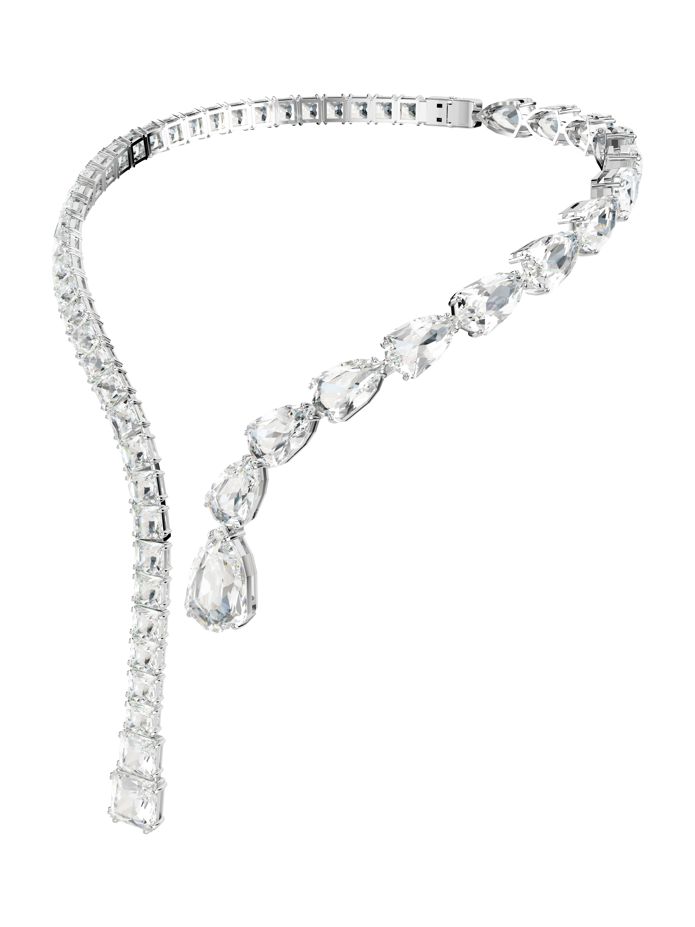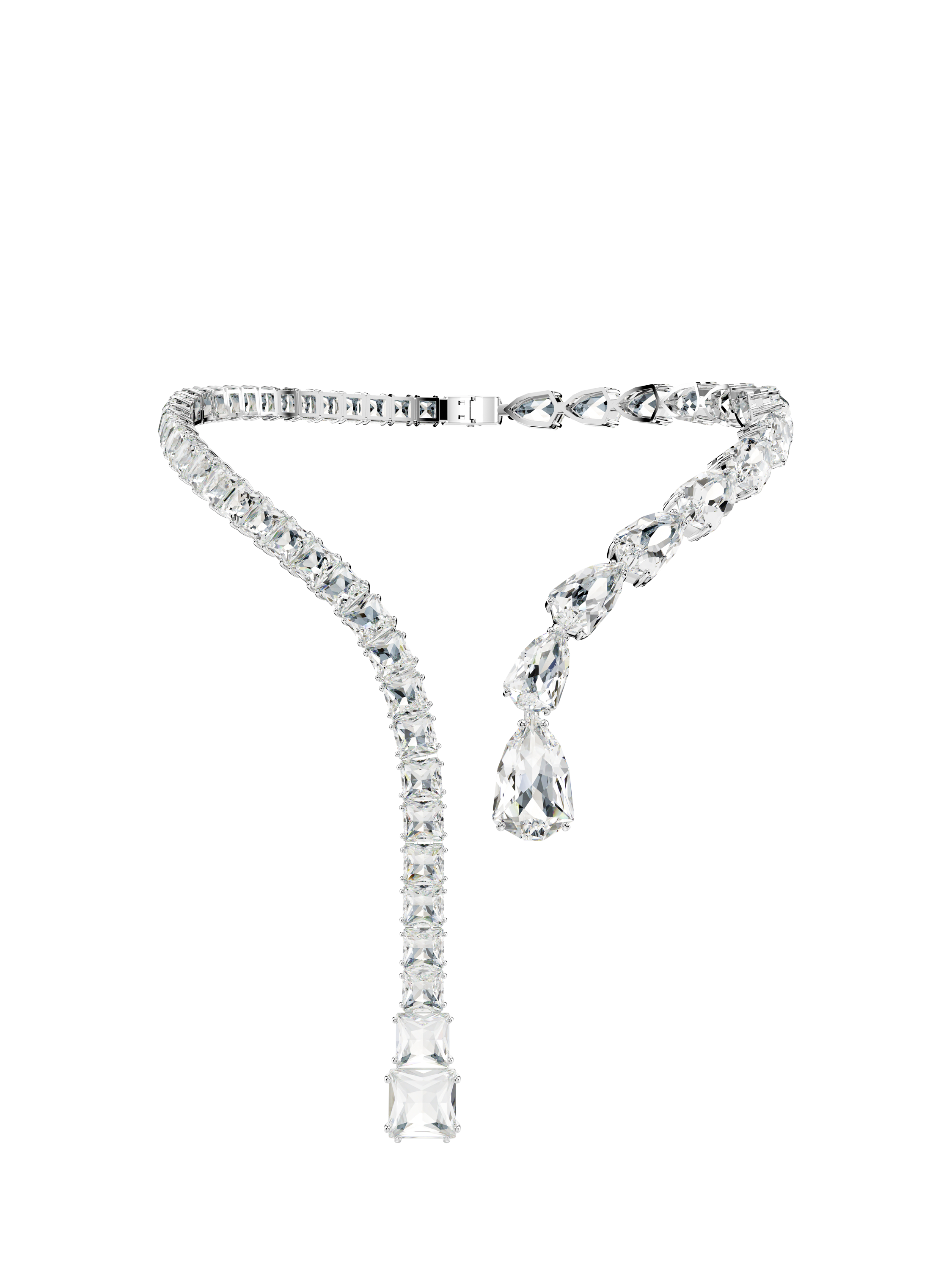 With its elegant curves and all-around radiance, this Matrix necklace is the definition of a statement style. The plated design is adorned with a variety of clear crystals in pear and square cuts, with multiple sizes adding unexpected dimensions to the silhouette. Choose this piece for instant opulence and glamour.