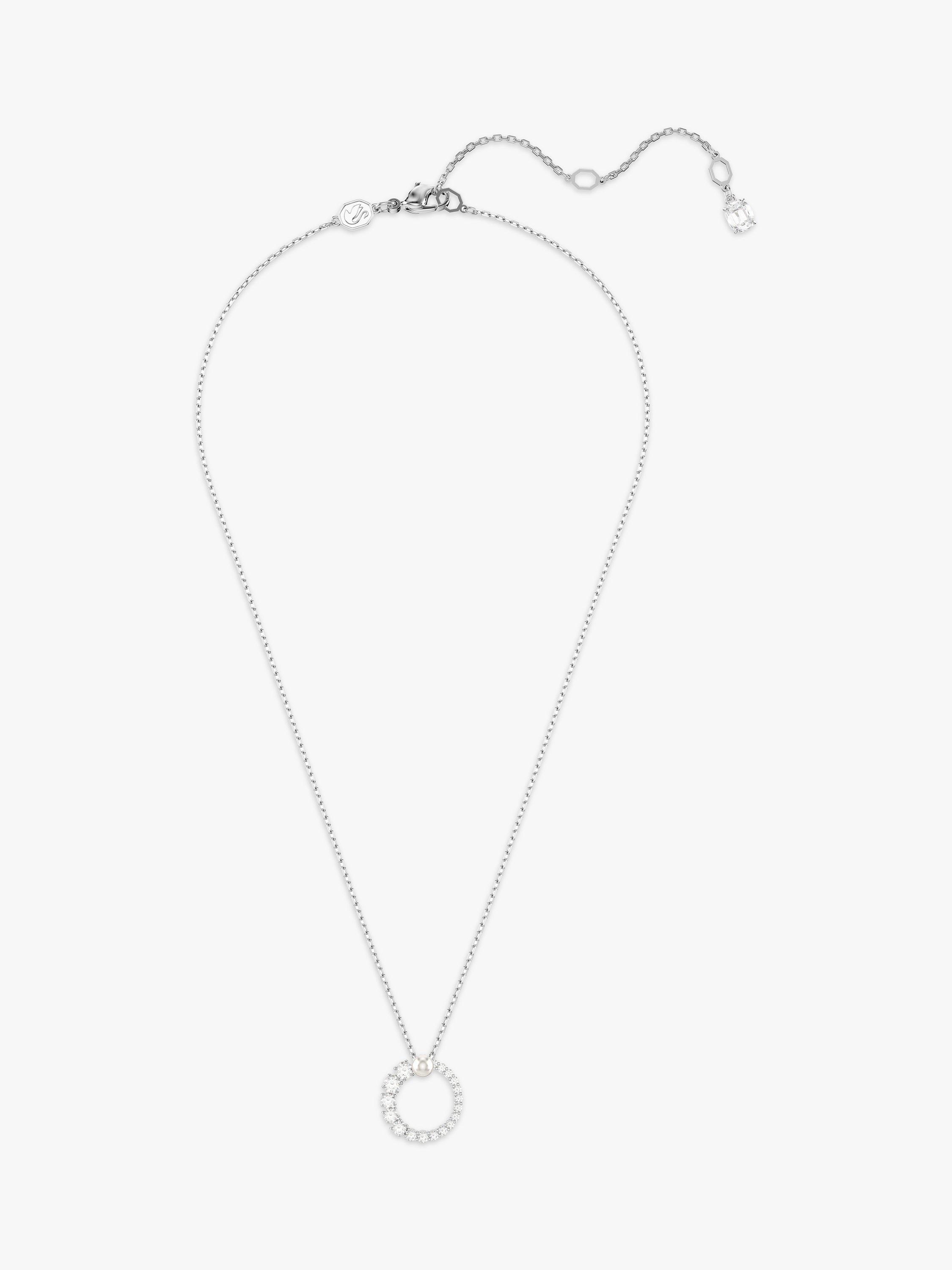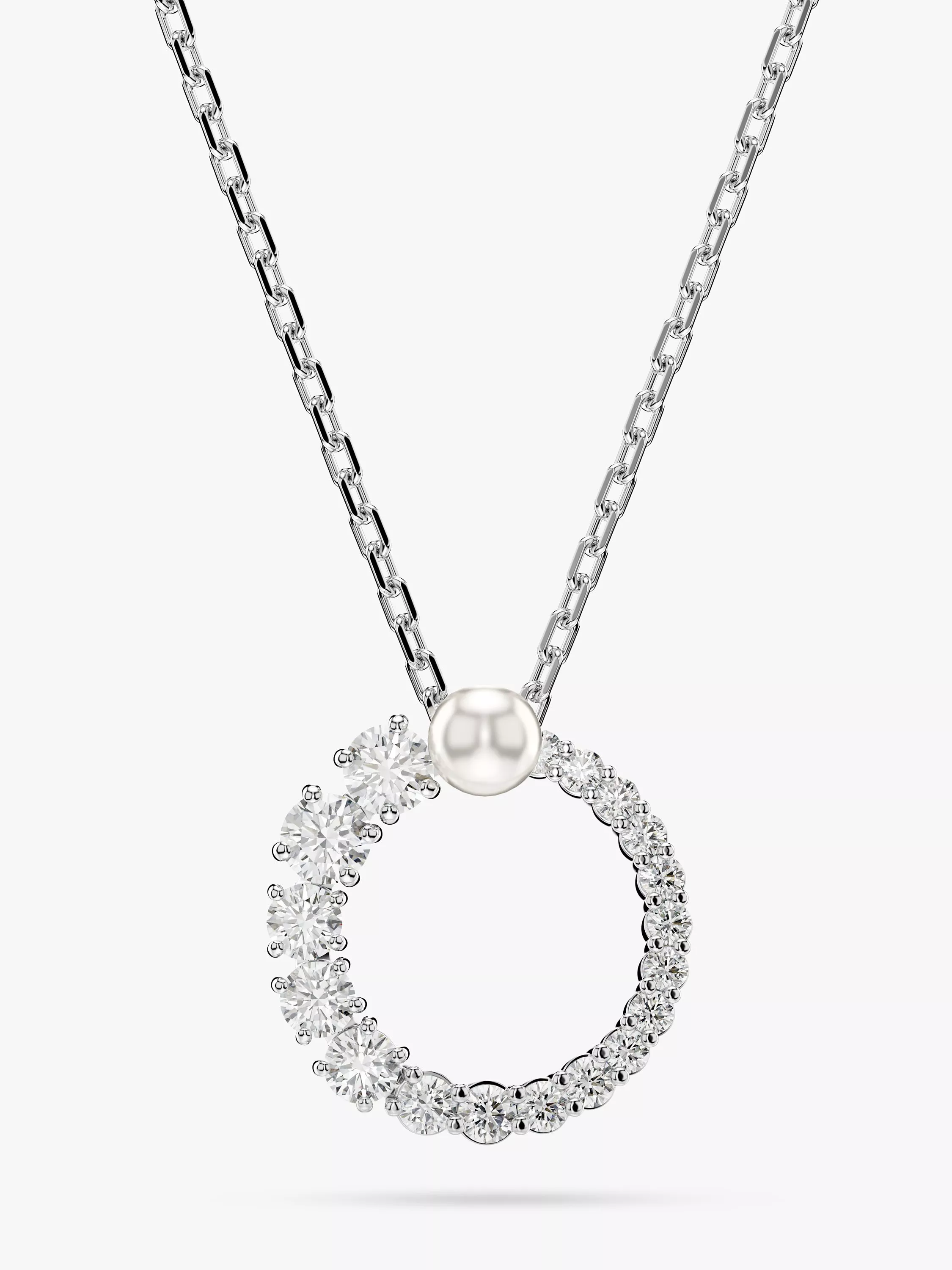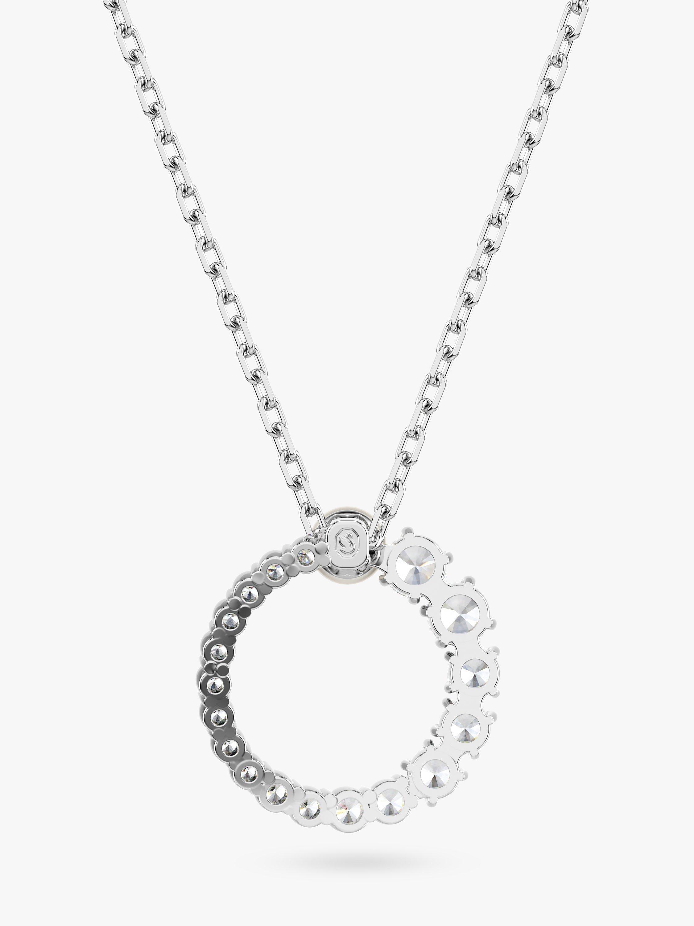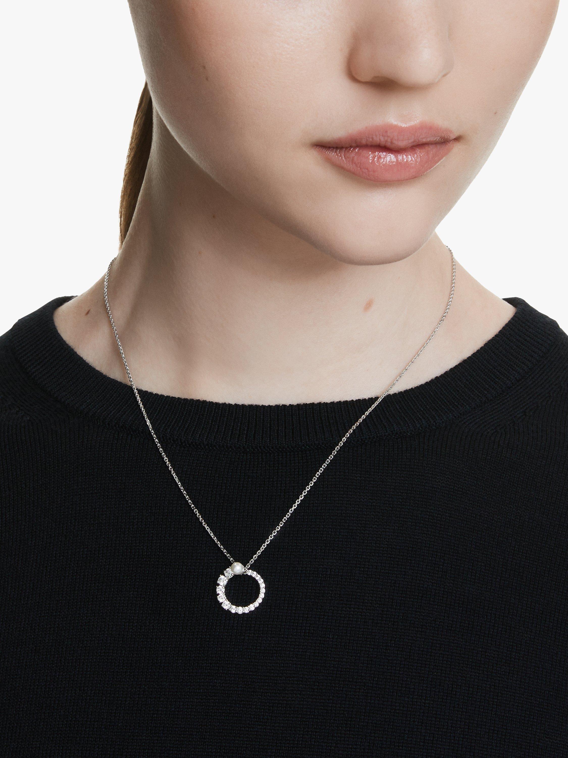 With its classic silhouette and contemporary detailing, this elegant Matrix pendant will attract attention. Suspended from a delicate chain, the rhodium plated piece features a ring of clear Swarovski Zirconia in different sizes, ranging from small to large, bookmarked with a white Swarovski Crystal Pearl at the center. Style solo or stack with matching earrings to dial up the drama.