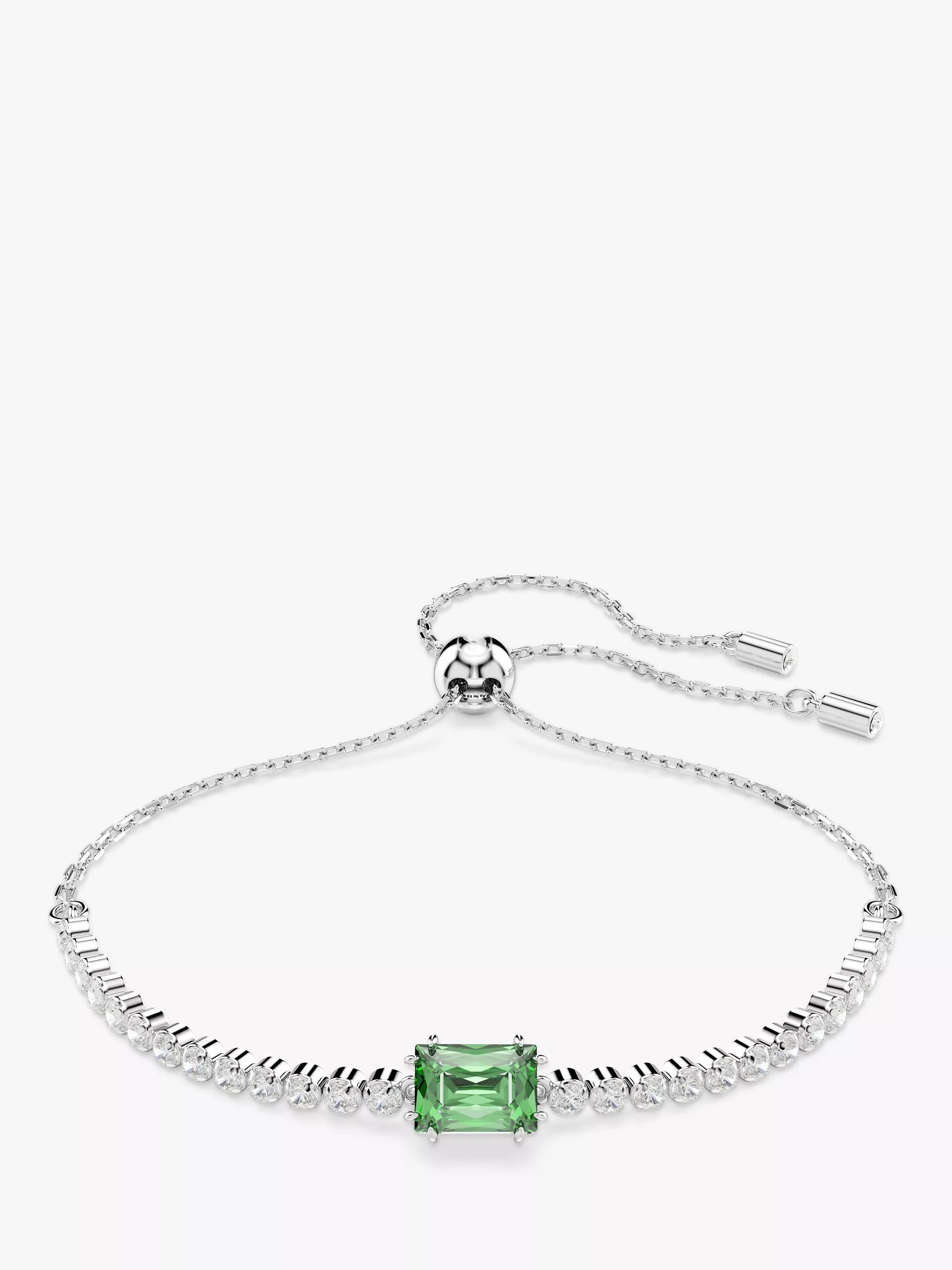Adding a touch of radiance to any look, this classic tennis bracelet combines clear Swarovski Zirconia with a pop of colour. Fastened with a sliding closure, the rhodium-plated jewellery features a uniform row of clear Swarovski Zirconia and is accented with a baguette-cut green Swarovski Zirconia at its centre. A vibrant twist on a timeless style.