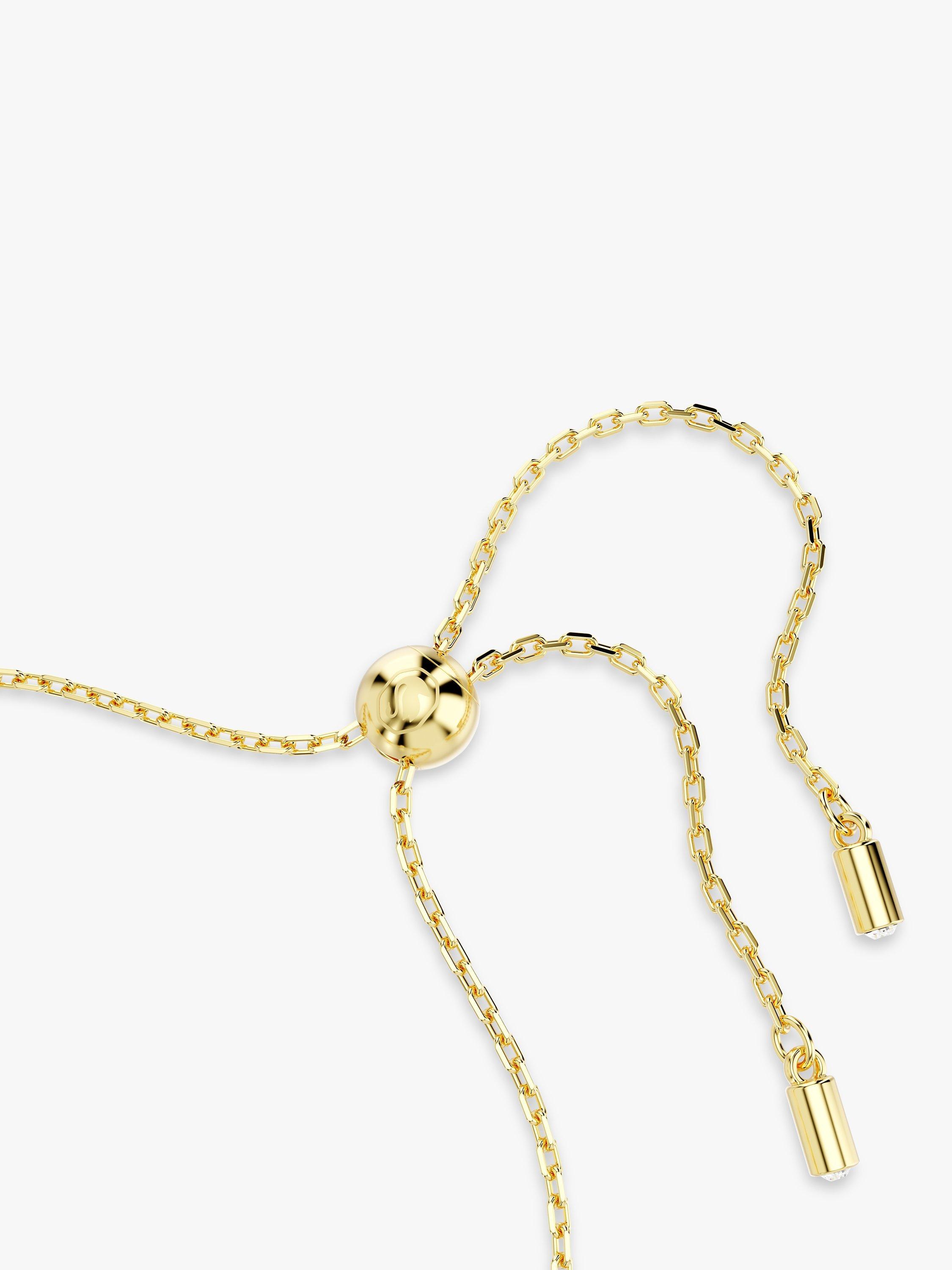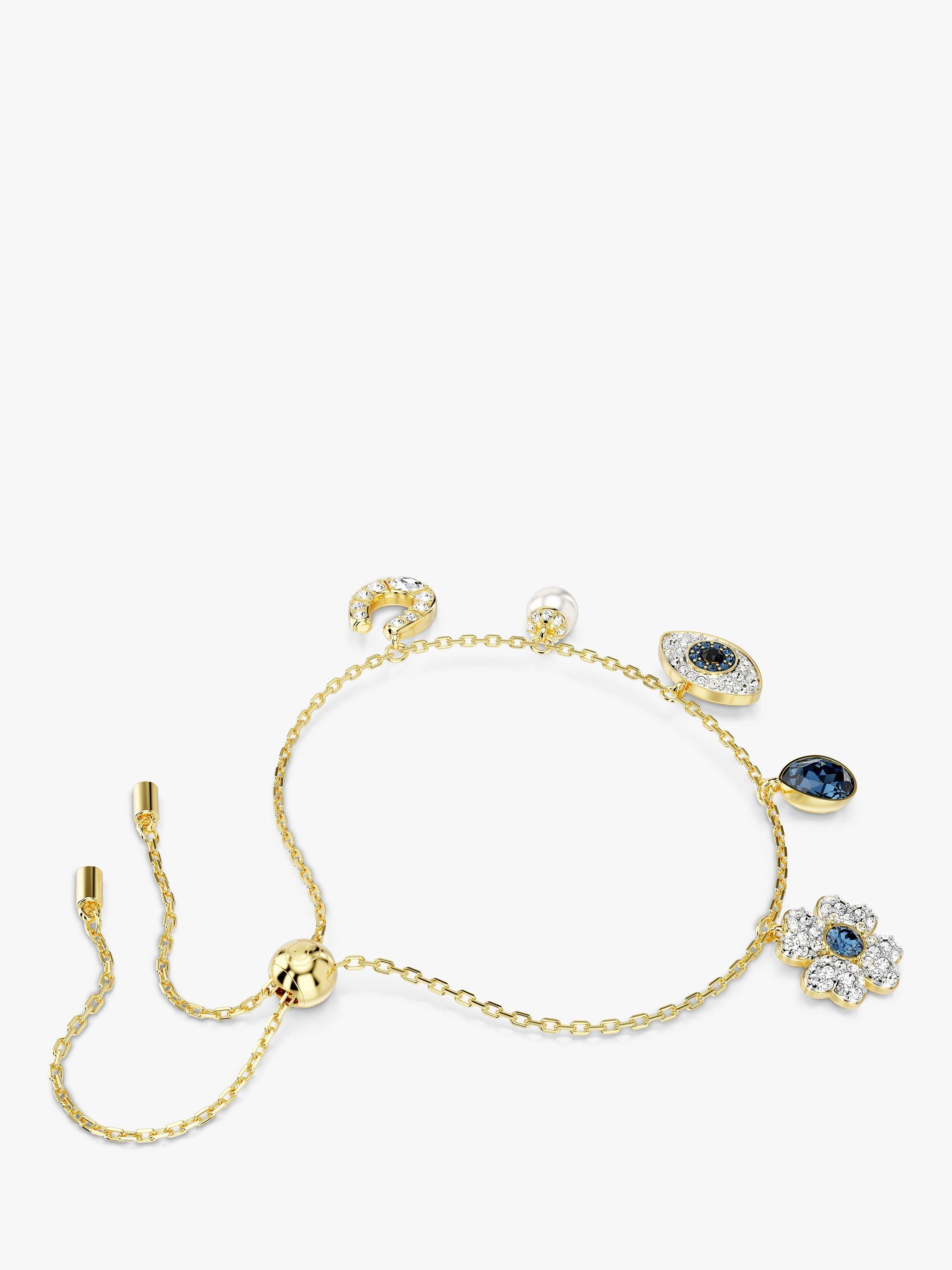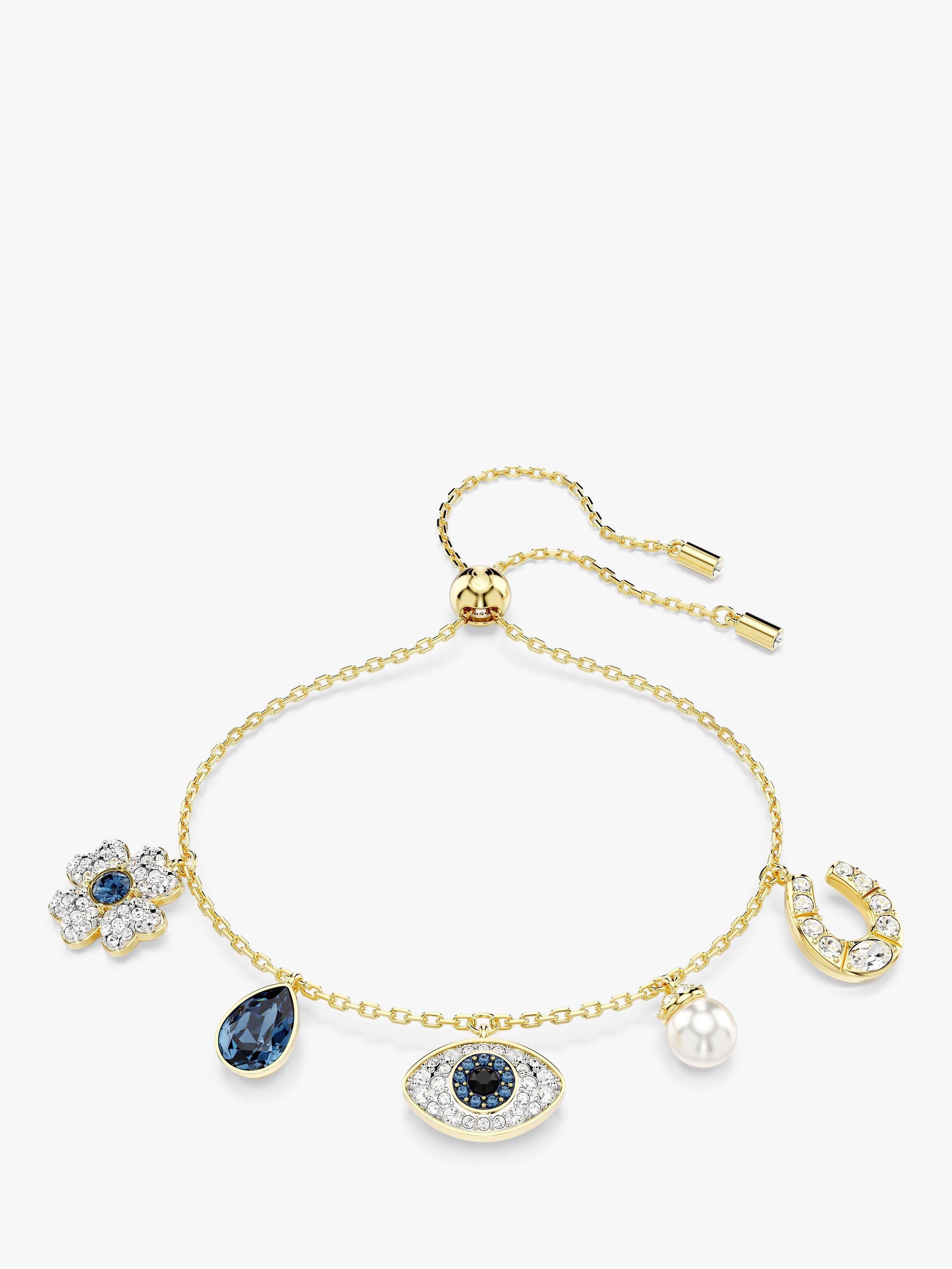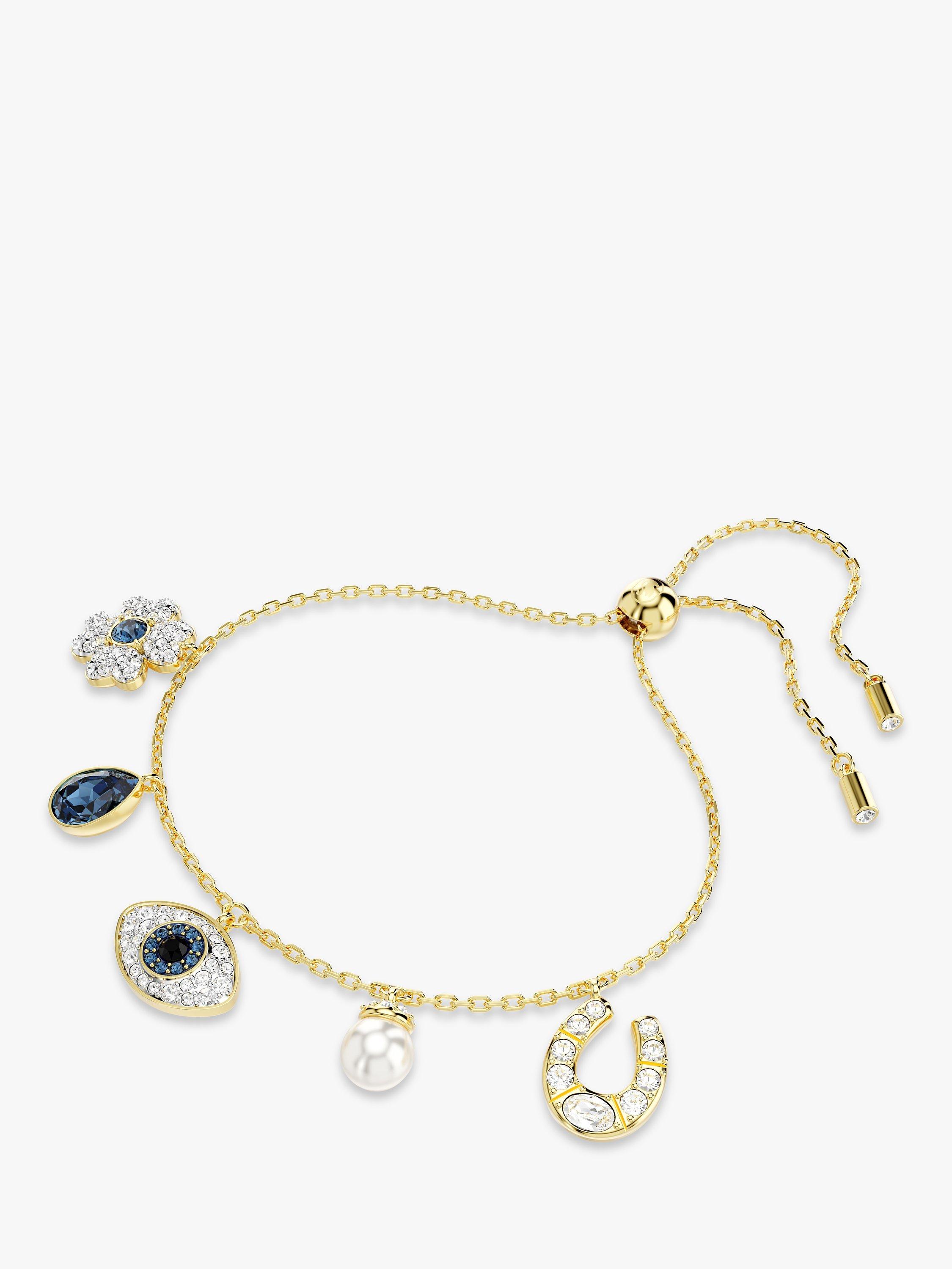 Infuse your style with magic and mysticism with this expressive gold-tone bracelet. The jewellery features a delicate chain set with five symbols, including a four-leaf clover, a blue pear-shaped drop, a Swarovski Crystal Pearl with pavé, a lucky horseshoe, and a domed evil eye at the centre. Each element is adorned with crystals to create a shimmering symbolic piece.