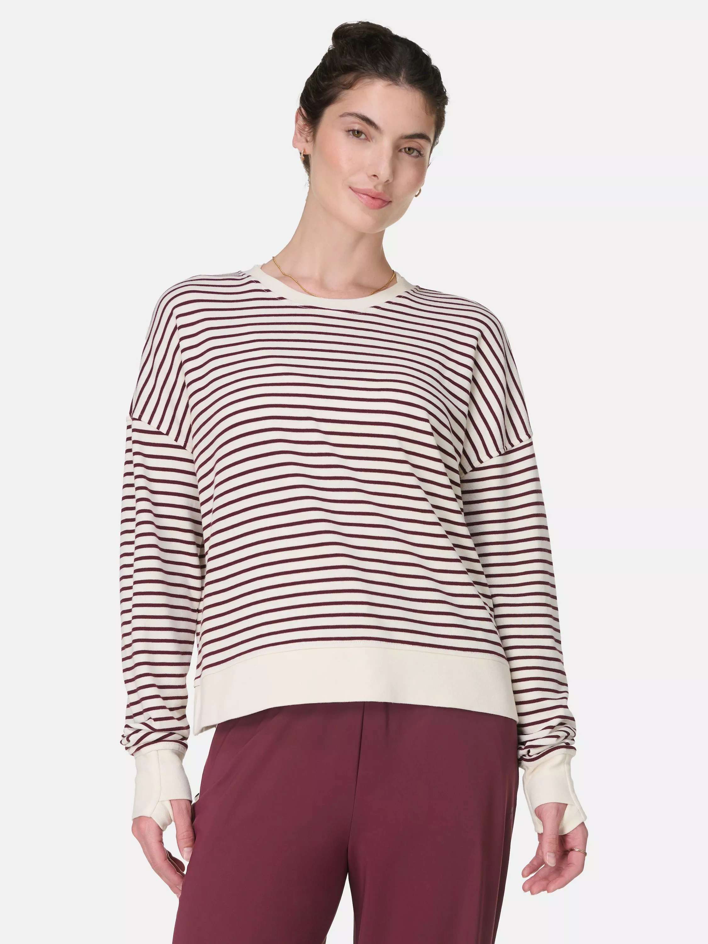 The perfect post-workout sweatshirt. Boxy fit in soft organic cotton. Classic crew neck and cosy thumbholes. Cropped style falls to waist.