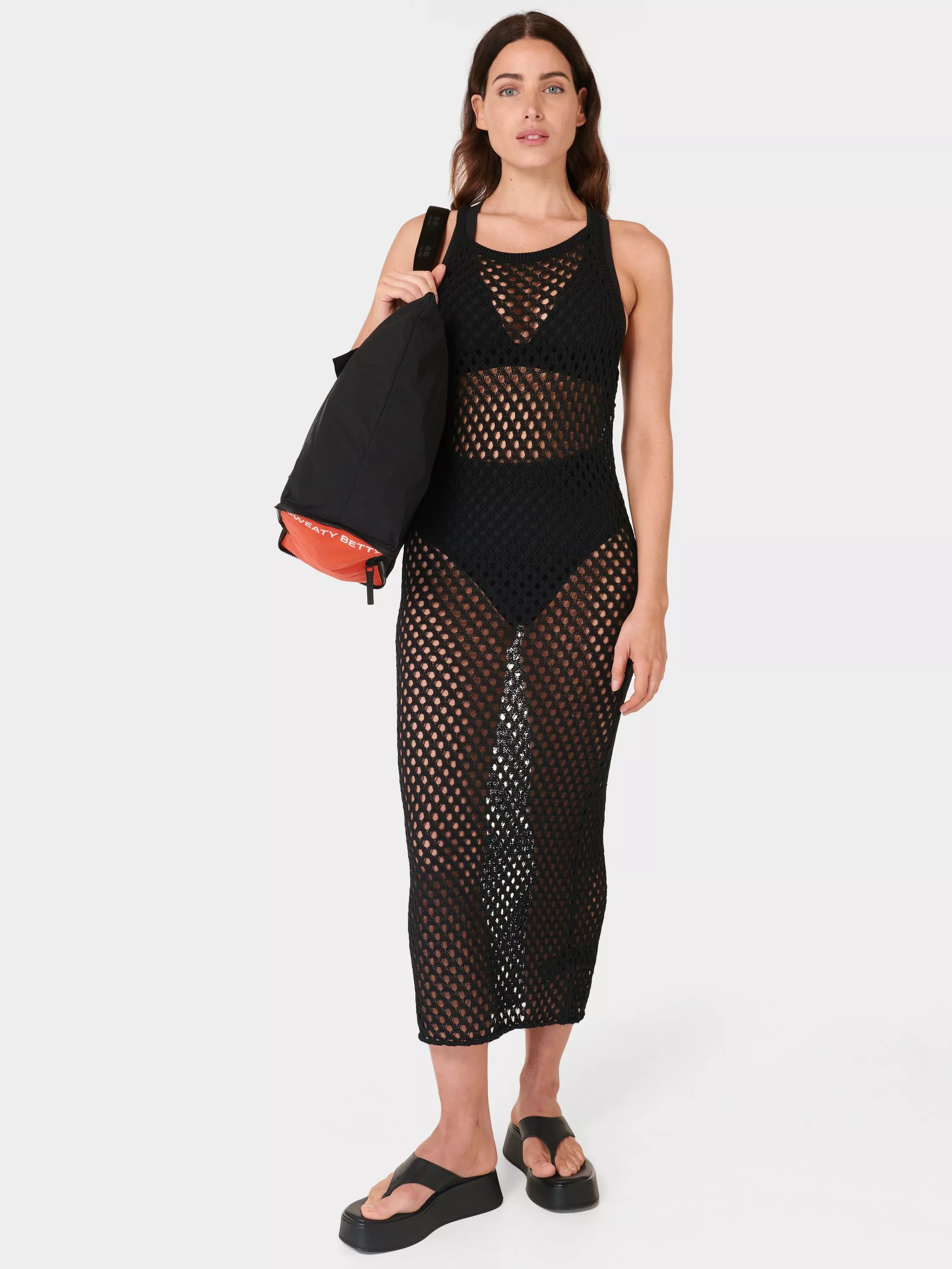 A summer-ready beach dress. Made from a cotton-blend crochet knit. Maxi length in a slim, body-skimming fit. Racer neckline and open back detail.