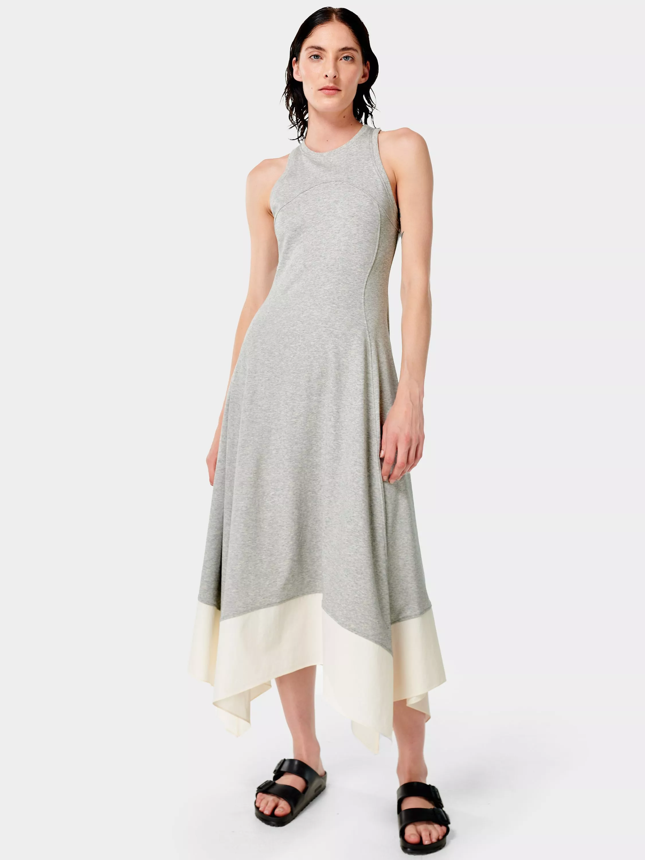 A warm racerback dress for cooler evenings. In soft, weighted cotton fabric with a flattering drape, its easy, feminine fit has structured seams to the sides and bust. The flared skirt features elevated woven stitching details at the hem and it's finished with a peep-through cut-out section to the back.