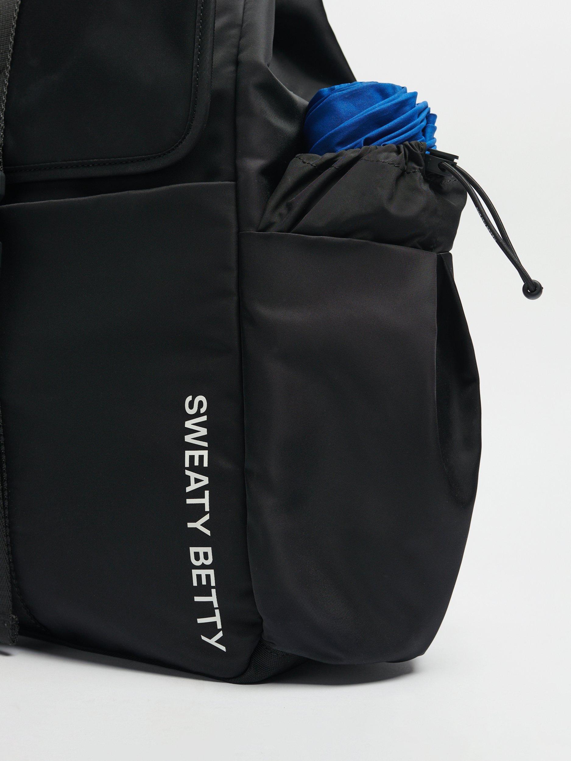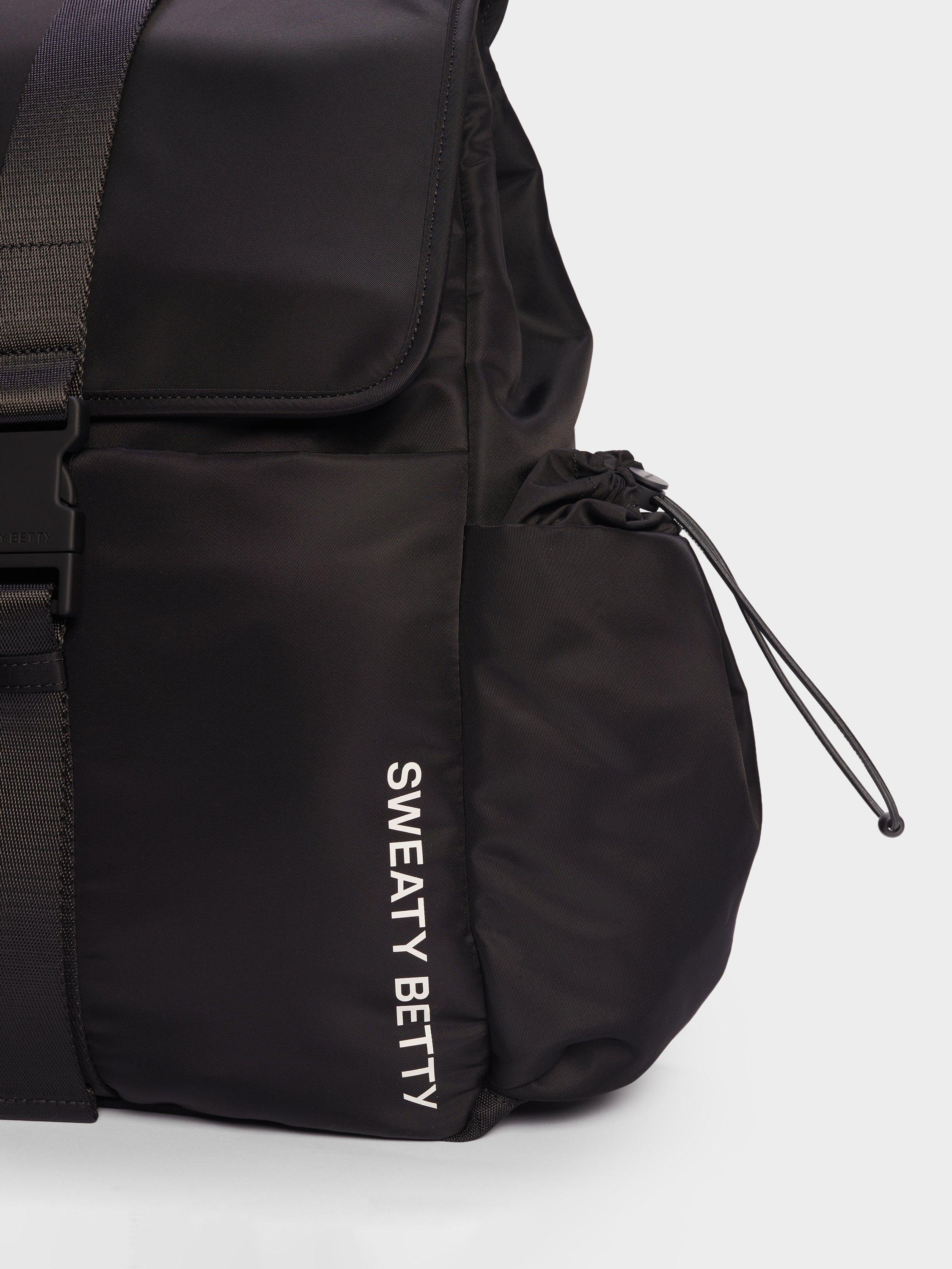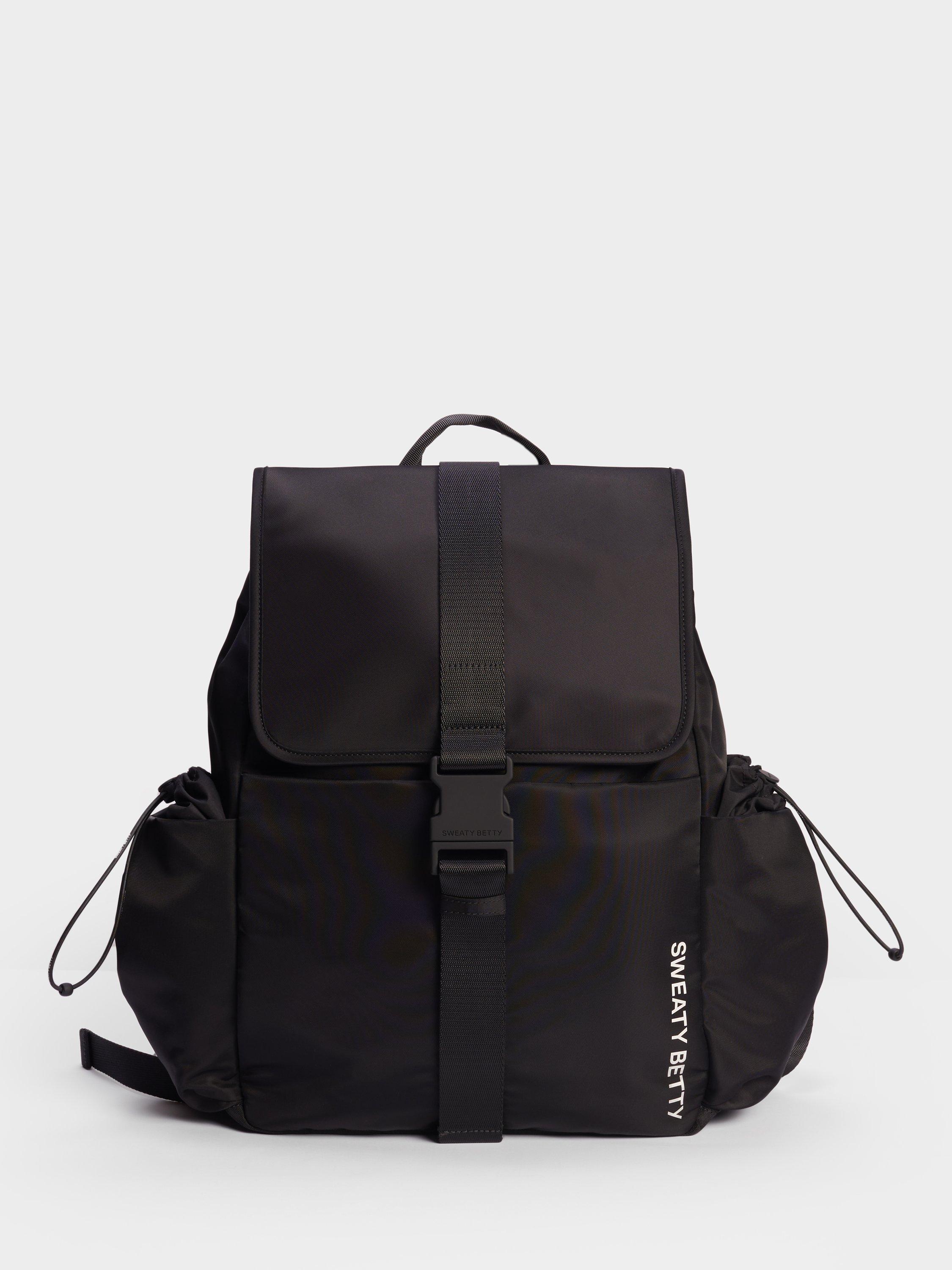 A do-it-all nylon backpack for gym and commuting. Made of 100% nylon with wipe-clean lining. Adjustable padded shoulder straps for comfortable all-day wear. Popper opening with detachable carabiner strap. Front slip pocket and 7 inner slip pockets. Padded 16" laptop pocket and two water bottle holders.