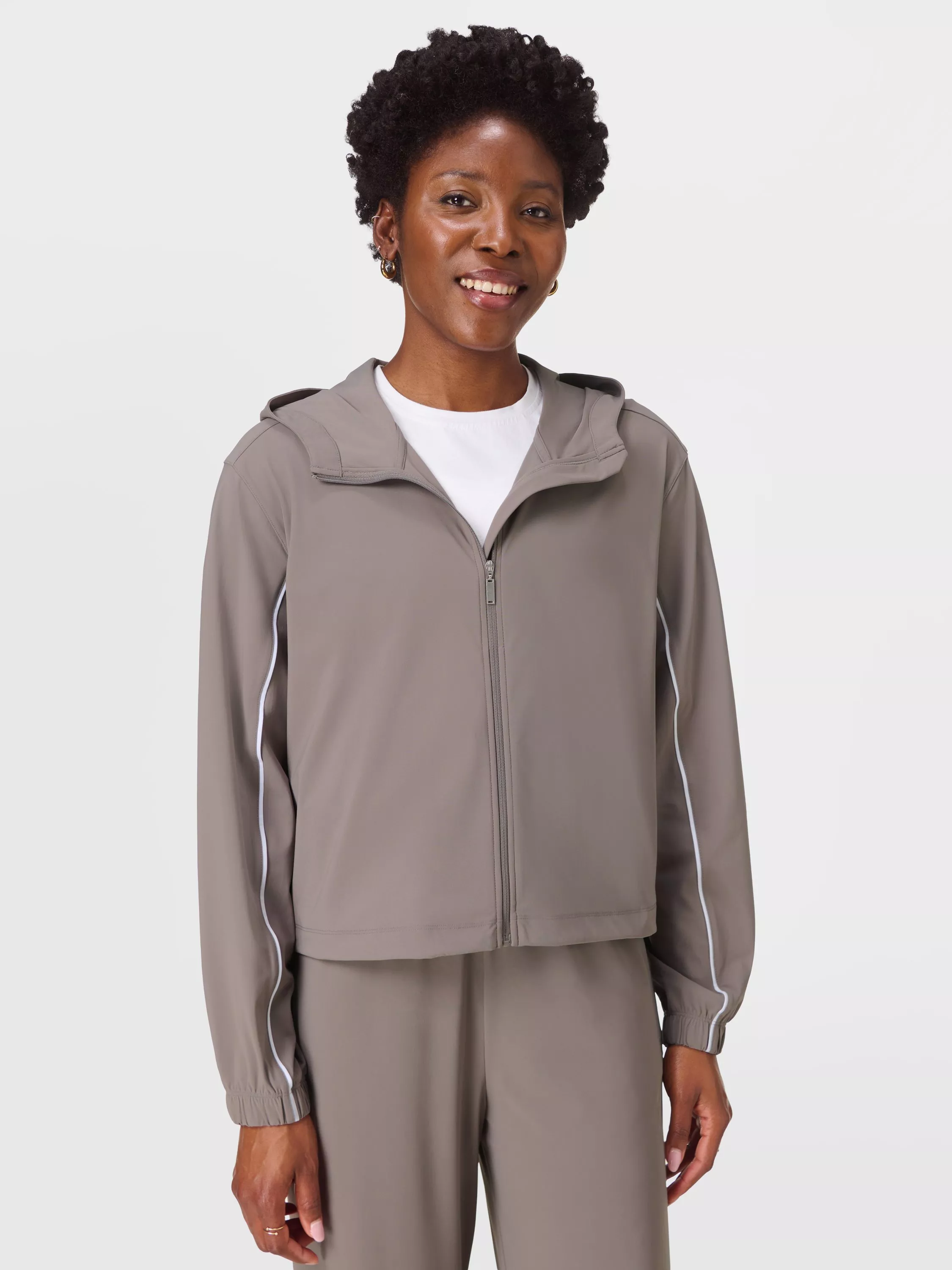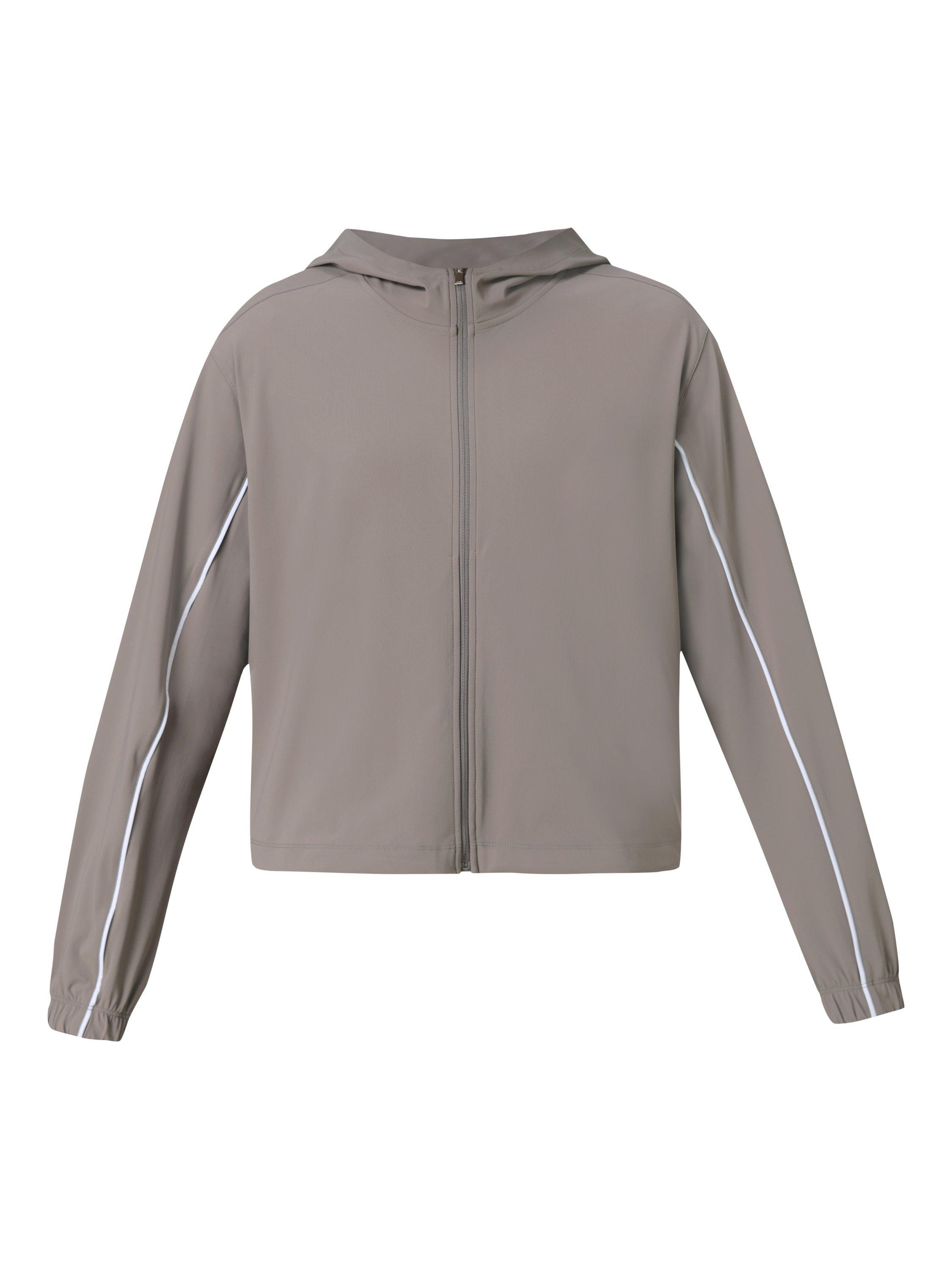 An everyday zip-up made from an ultra-light, crease-resistant Explorer fabric. Relaxed, boxy fit with dropped shoulders and elasticated cuffs. Adjustable toggles at the hem. Two side pockets and fixed hood.