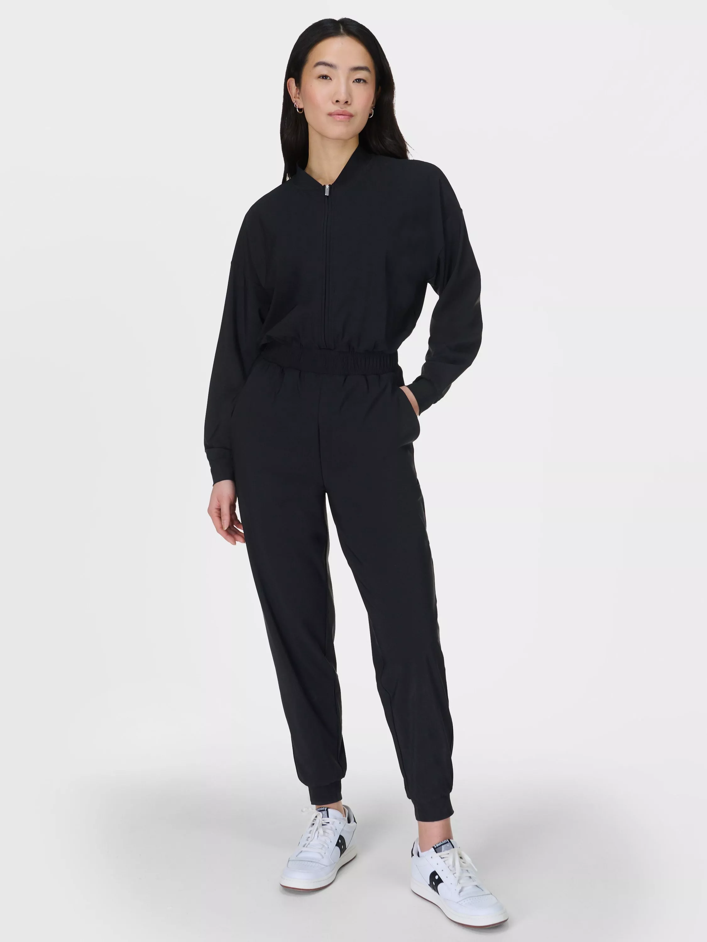 A new, all-in-one addition to our bestselling Explorer collection. Made from our quick-drying, crease-resistant Explorer fabric that's now partially recycled. Relaxed fit with dropped shoulders, elasticated waist and cuffs at ankle and wrist. Modern bomber collar with concealed centre front zip. Slip pockets at the hip and patch pocket on the back.