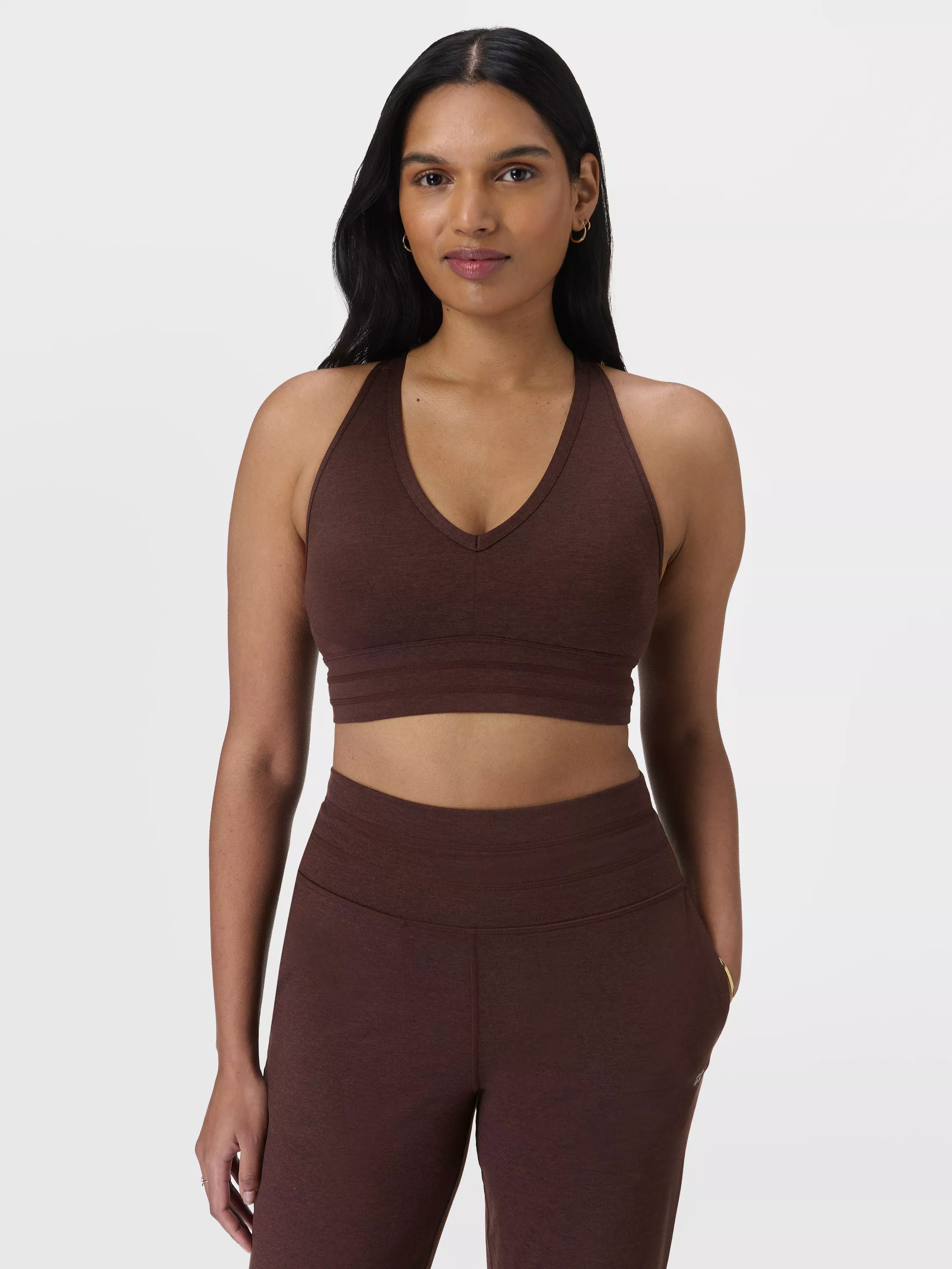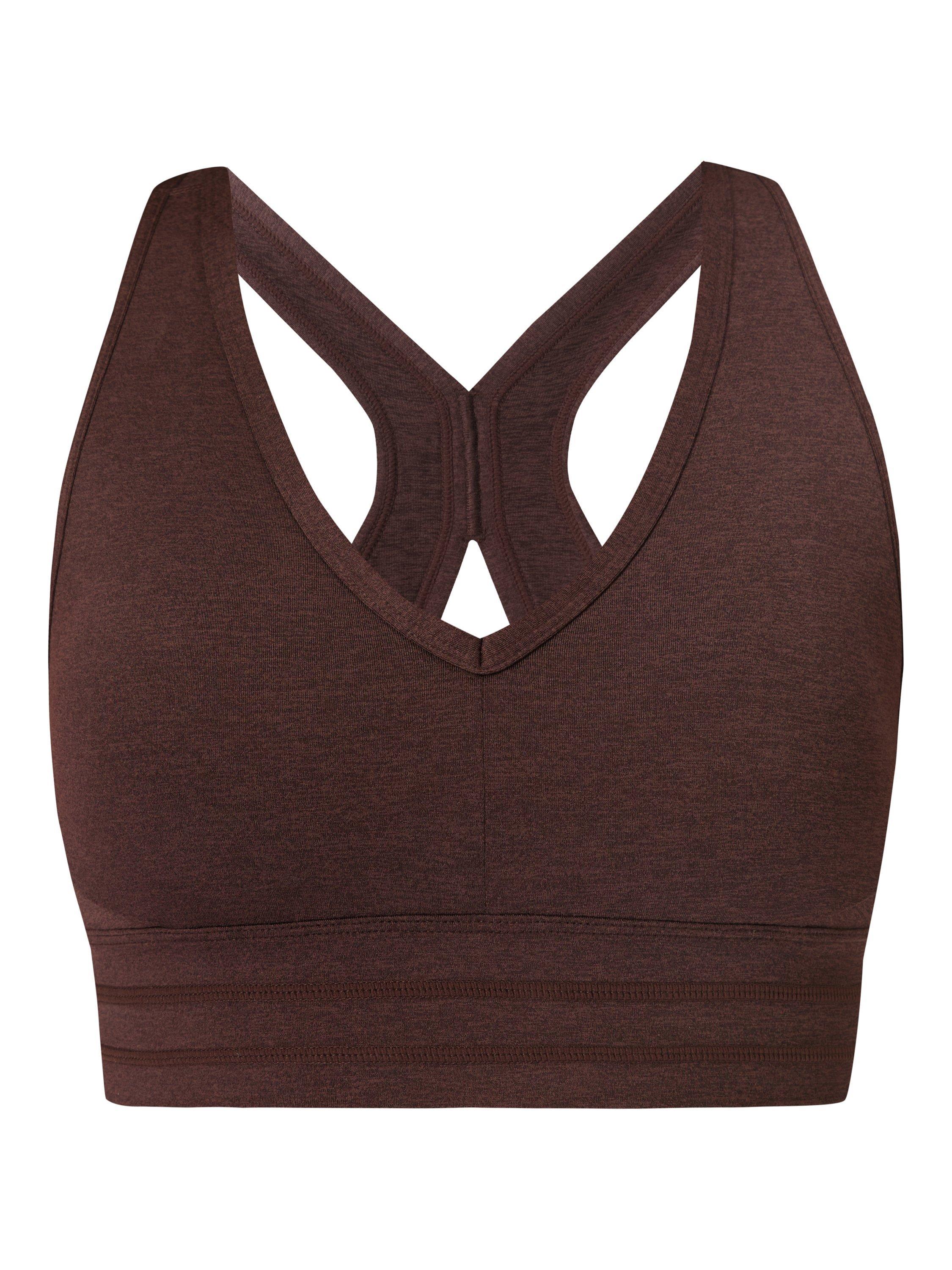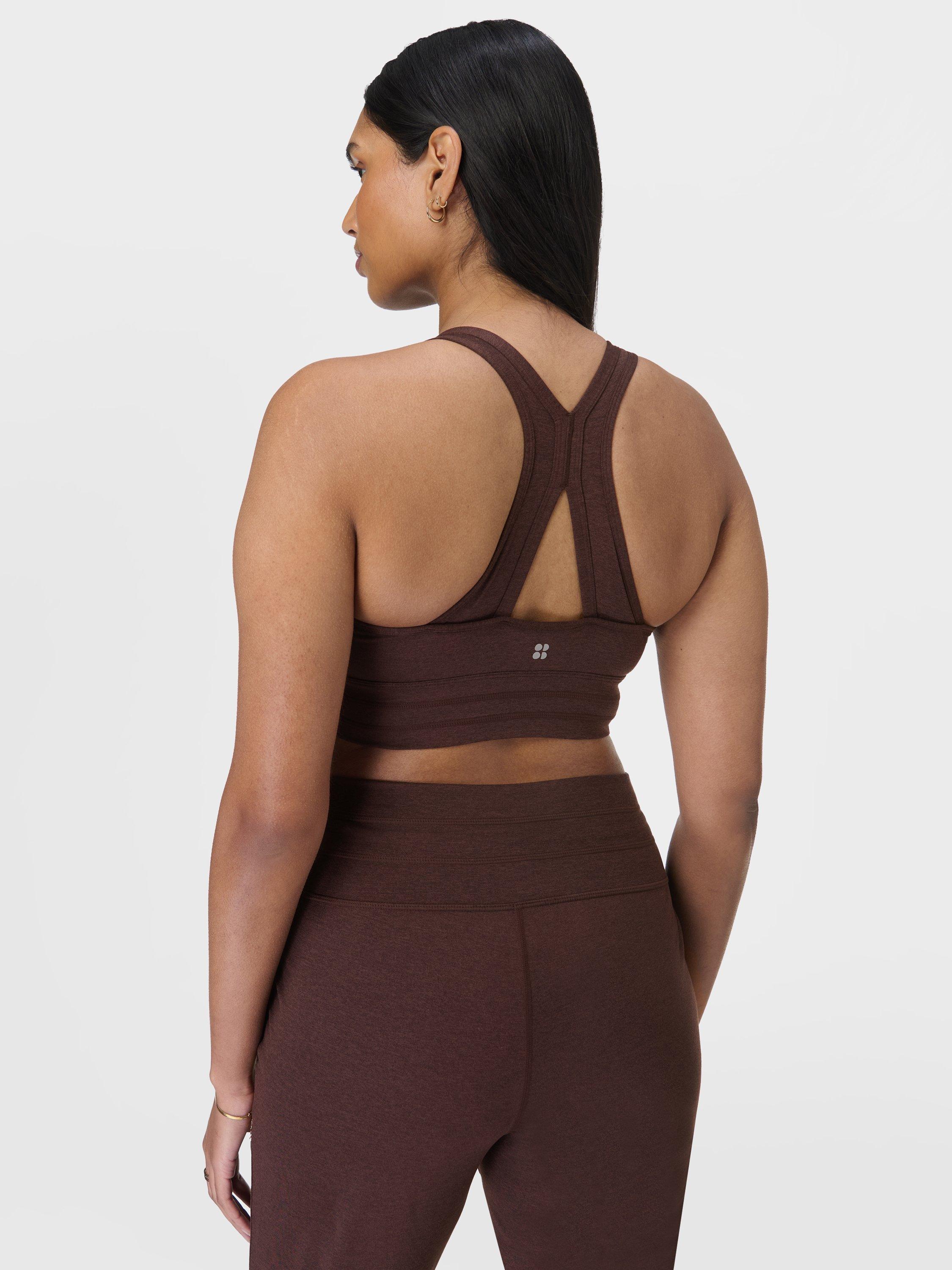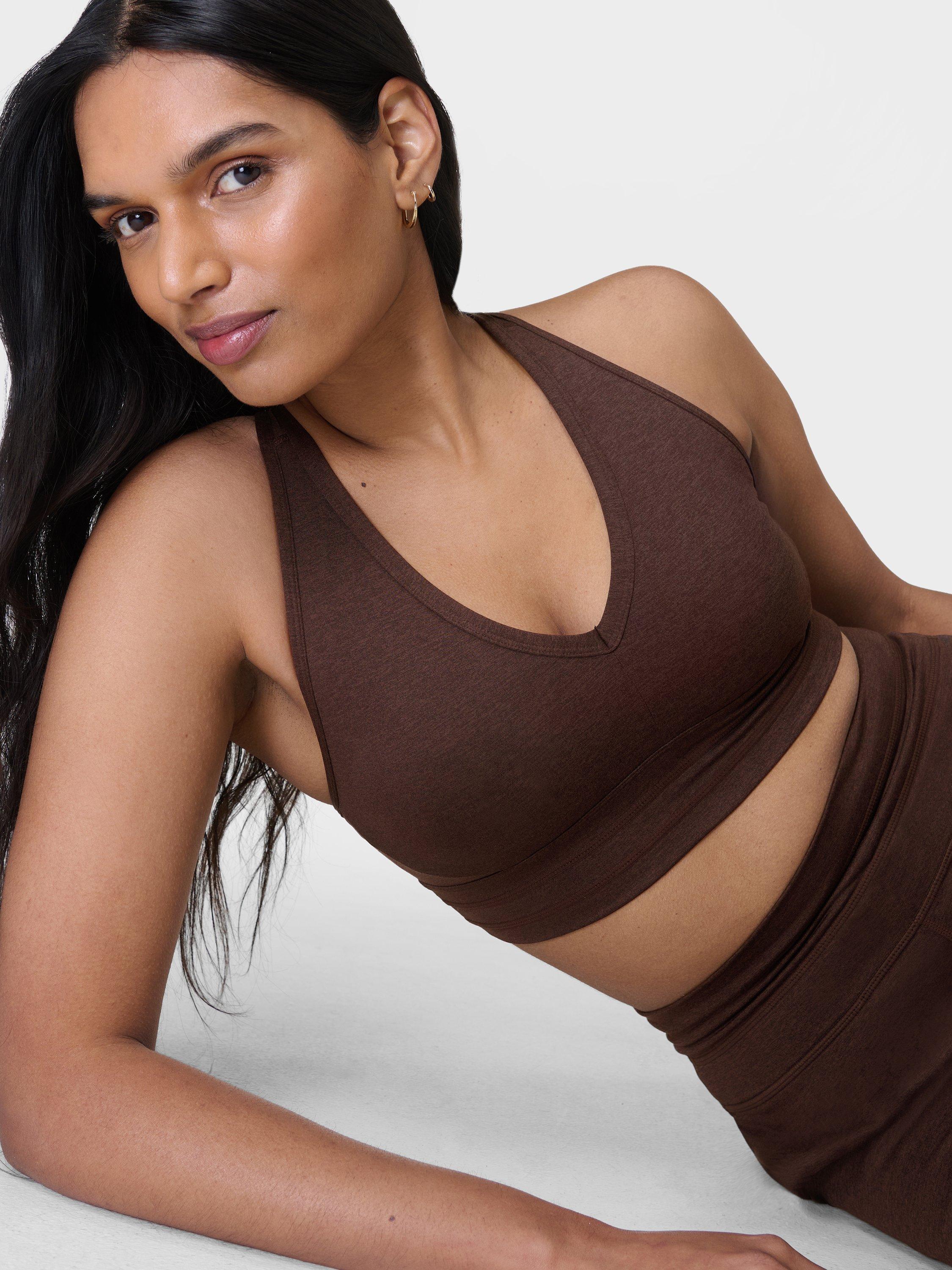 The new, light support bra for yoga flows and more from Sweaty Betty. Soft, sweat-wicking fabric that's 85% recycled with a flattering V-neck with racerback and keyhole detail. Deep underband and contouring seamlines for comfort as well as removable pads.
