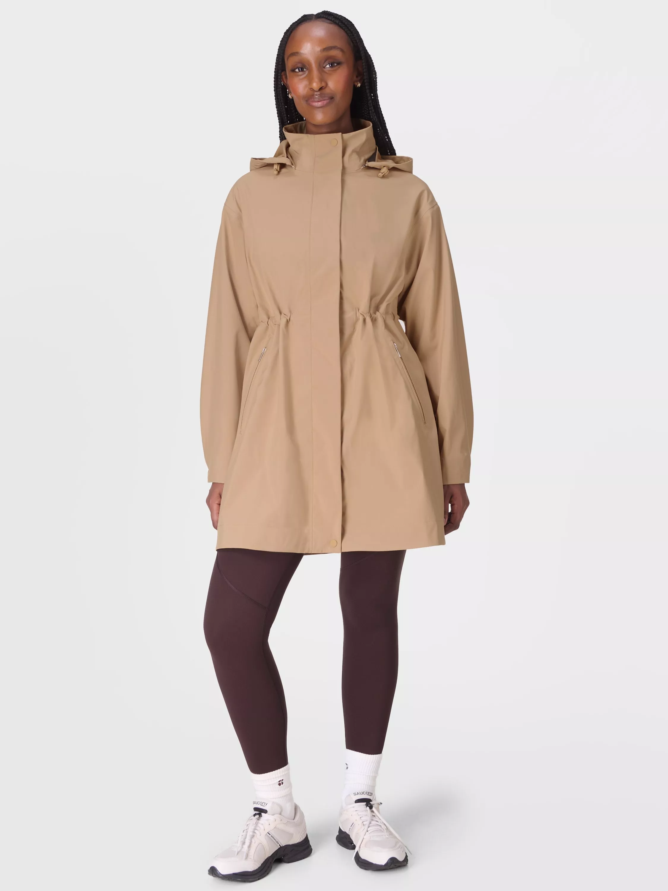 Waterproof parka jacket made for outdoor activities. 100% recycled breathable fabric with fully sealed taped seams. Adjustable elasticated hood, dropped shoulders and armholes. Chest flap pockets, side pockets with a taped zip closure, internal drawcord at waist. Falls to a dropped hem detail.