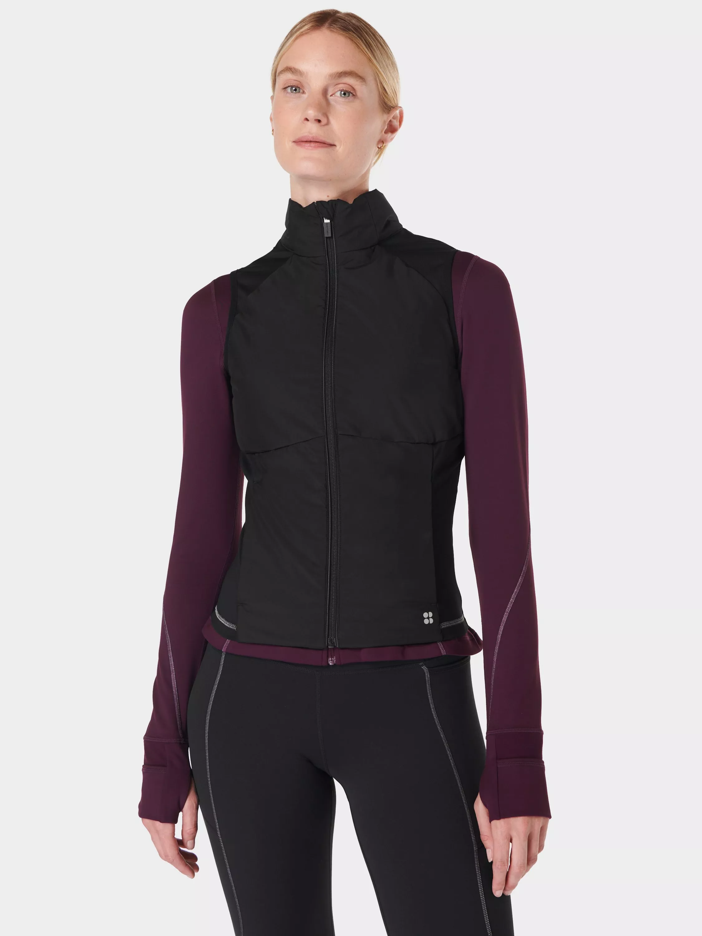 A lightweight gilet designed for speed and agility. Made from our 100% recycled breathable and water-resistant fabric. Padded with PrimaLoft insulation on the front and back, pro-run fabric at the sides. High neck, reflective piping at the front, tonal branding to the back hem. Centre front zip and two side zip pockets.