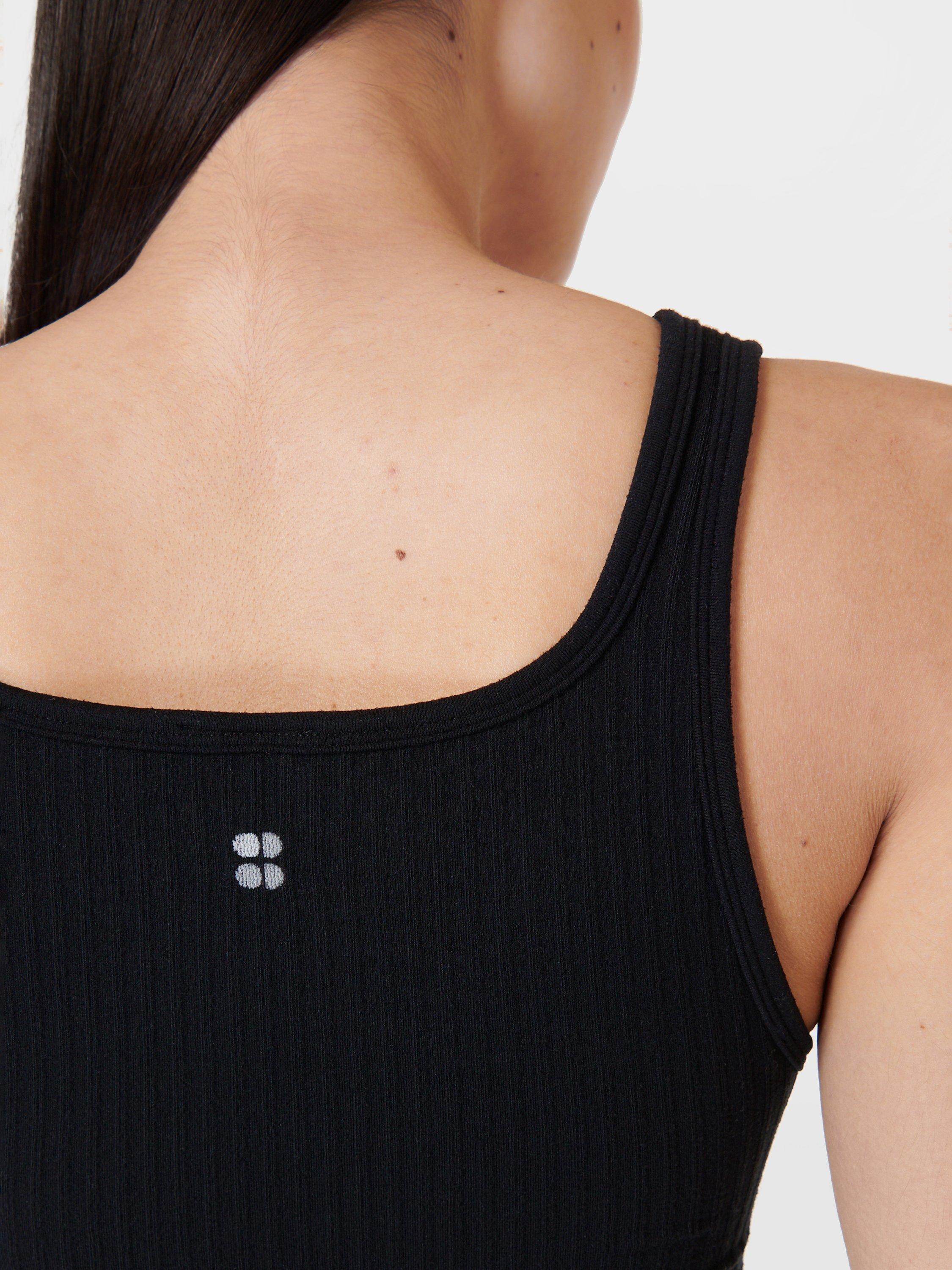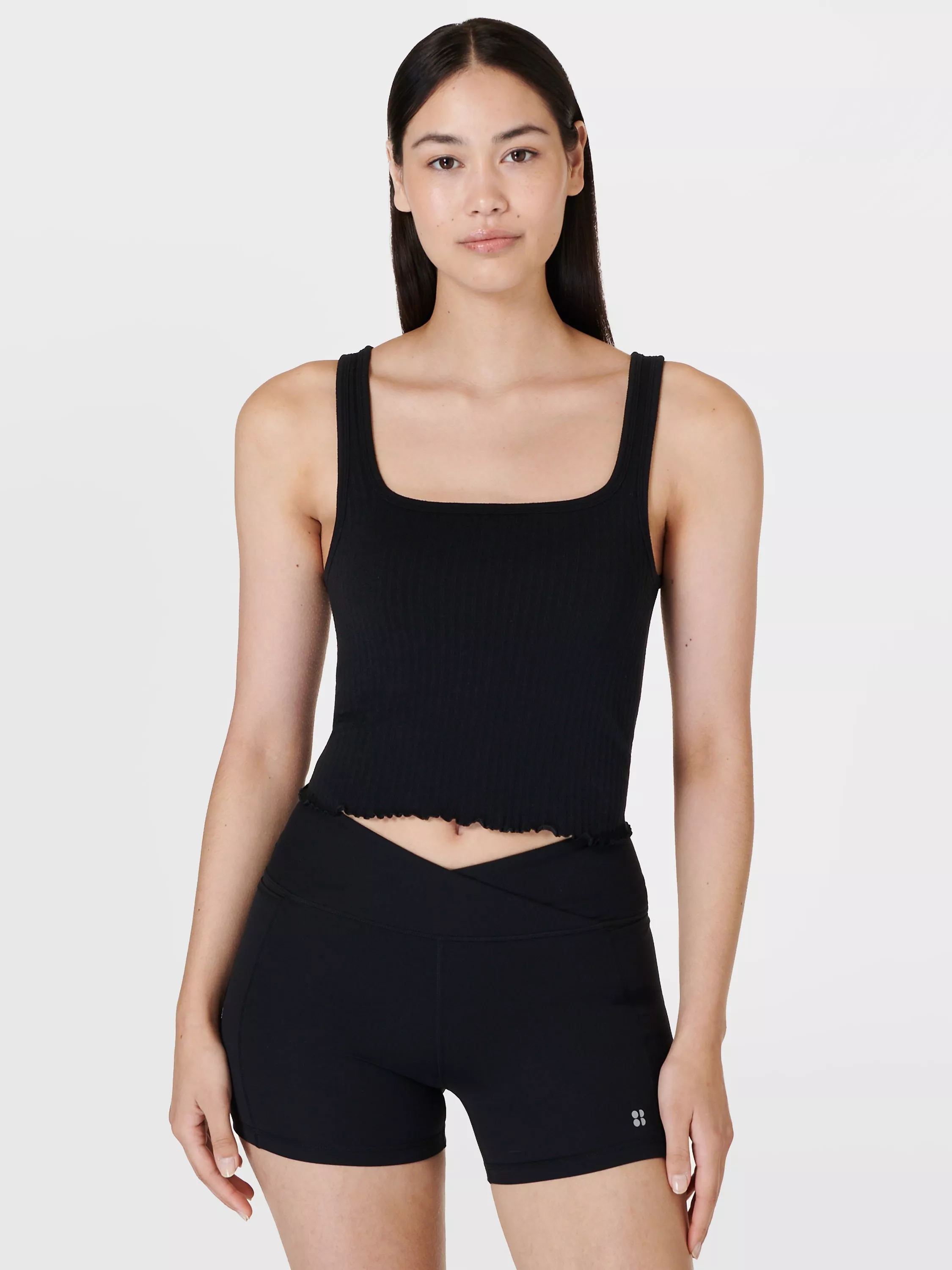 A seamless top for low impact workouts. In a super soft fabric, it has a flattering square neckline and lettuce hem. Built-in bra with removable pads.