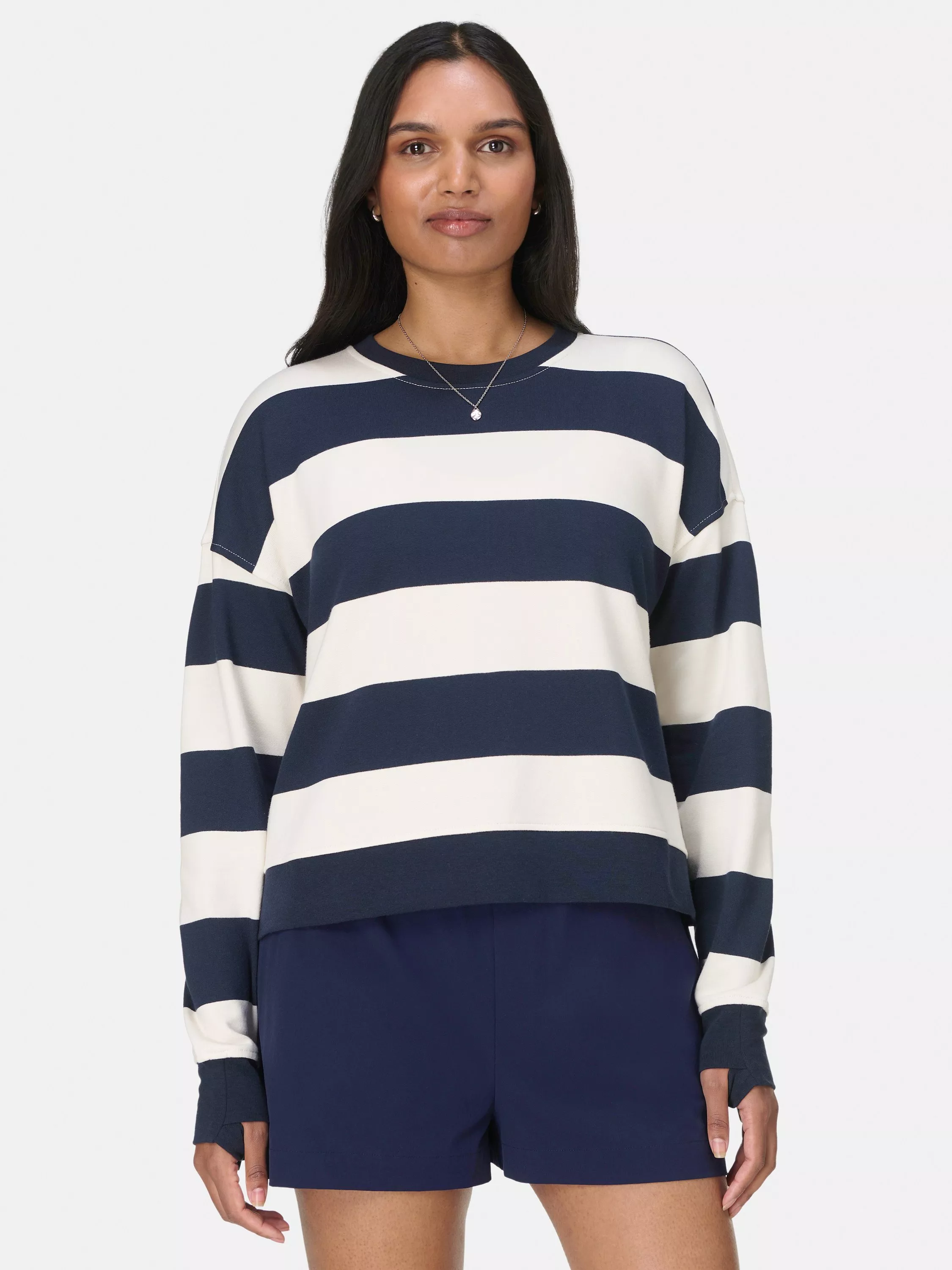 The perfect post-workout sweatshirt. Boxy fit in soft organic cotton. Classic crew neck and cosy thumbholes. Cropped style falls to waist.