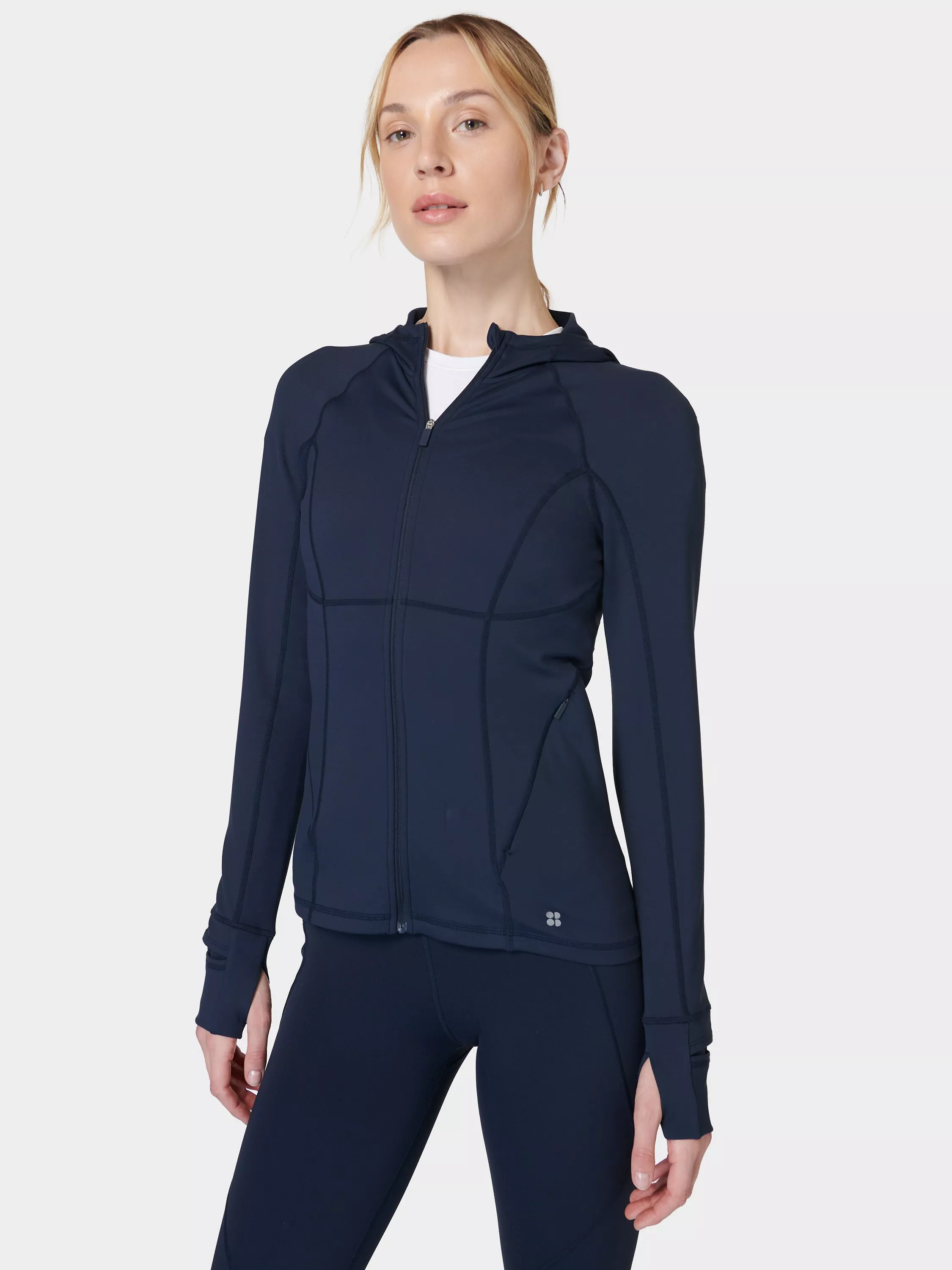 A technical zip-up for run lovers. The ultra-soft fabric is breathable and perfect for layering. Cut to a slim fit with contouring seamlines, it has long sleeves with a watch hole and thumbhole mittens. Features a hood and two front zip pockets.
