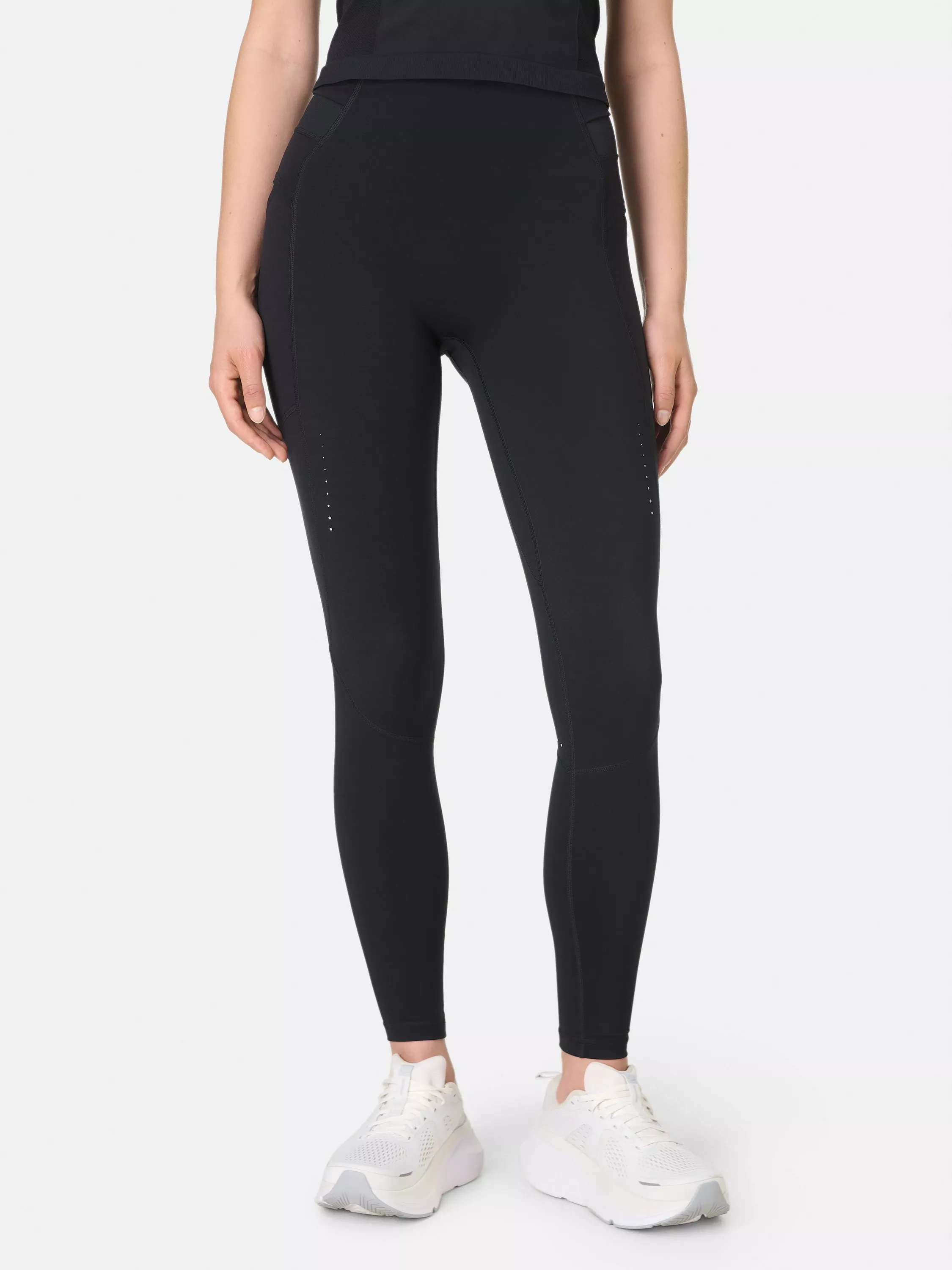 A pair of compressive running leggings with five pockets. Sweat-wicking, quick-drying fabric with 4-way stretch and high compression for ultimate support and recovery. High-waisted with a smooth, supportive waistband that stays put as you run. Two side slip pockets with overlap for extra security, plus two back pockets and a zipper pocket designed in breathable mesh. Sleek, streamlined design without front seams for extra freedom of movement.
