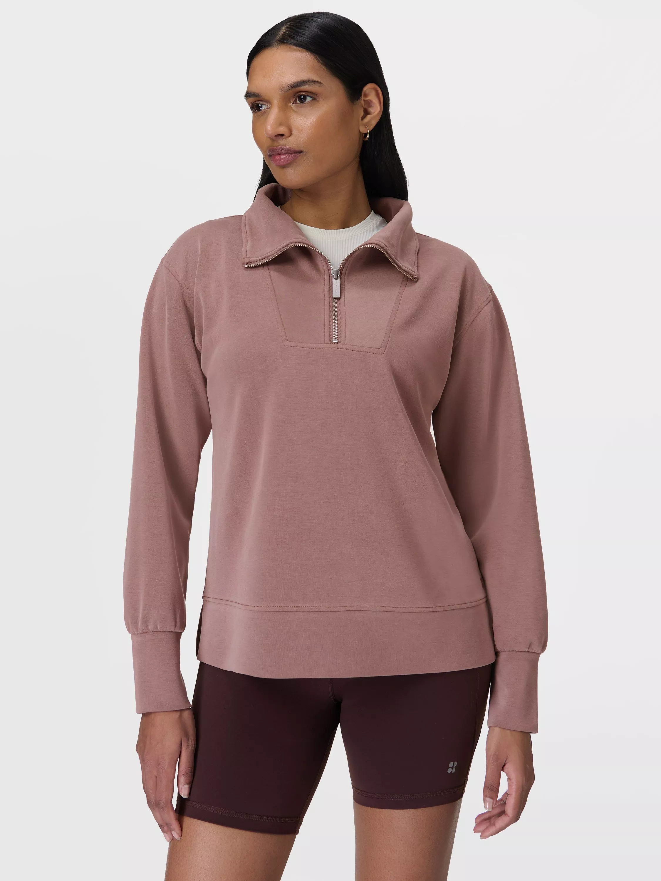 Sweaty Betty's bestselling Sand Wash Sweatshirt in a new cut, with dropped shoulders, full-fashioned sleeves and a longline fit combining for a relaxed aesthetic. Made with peachy soft 54% recycled fabric for the ultimate comfort and lightweight feel. Finished off with a half zip closure for extra styling.