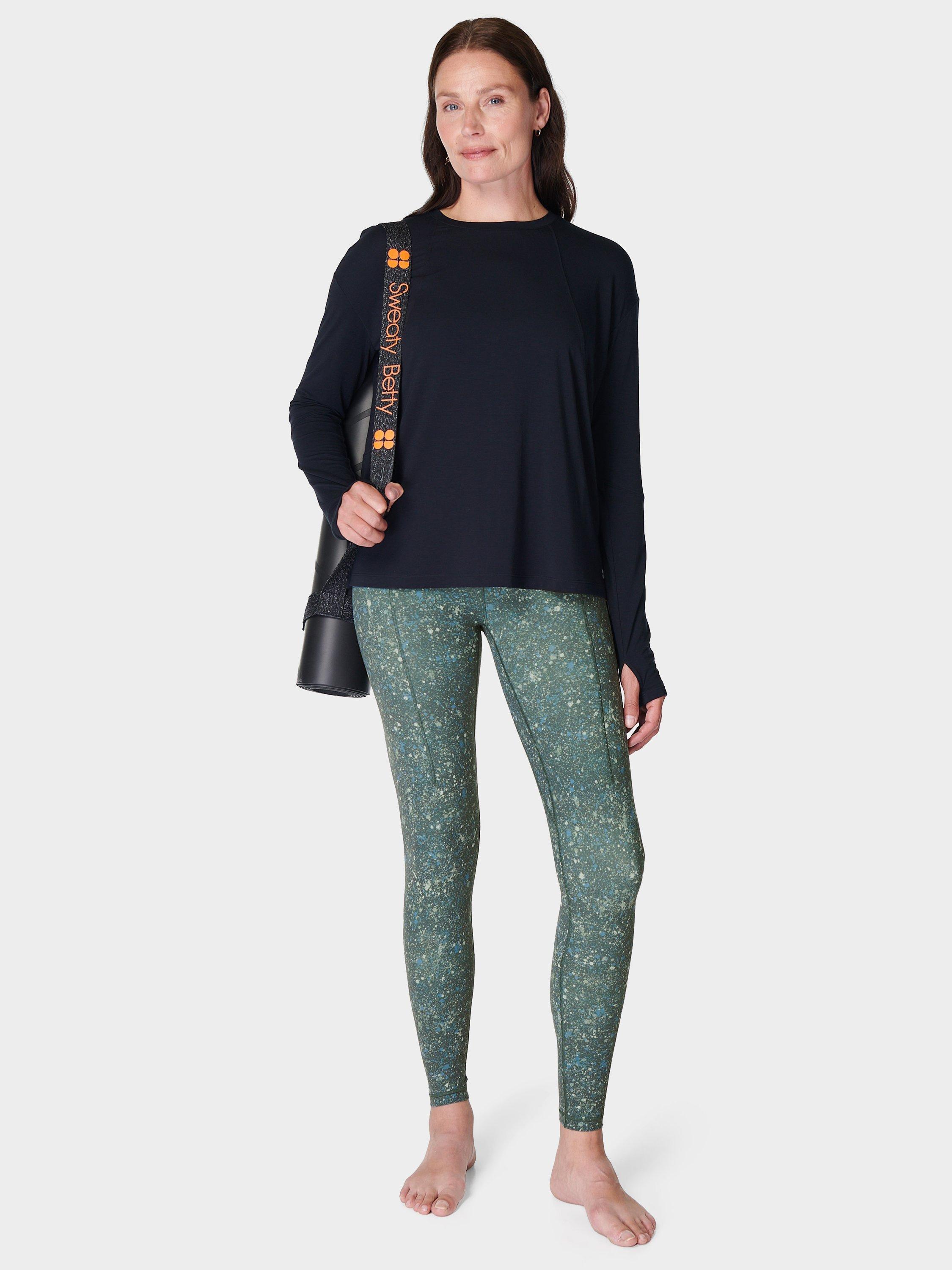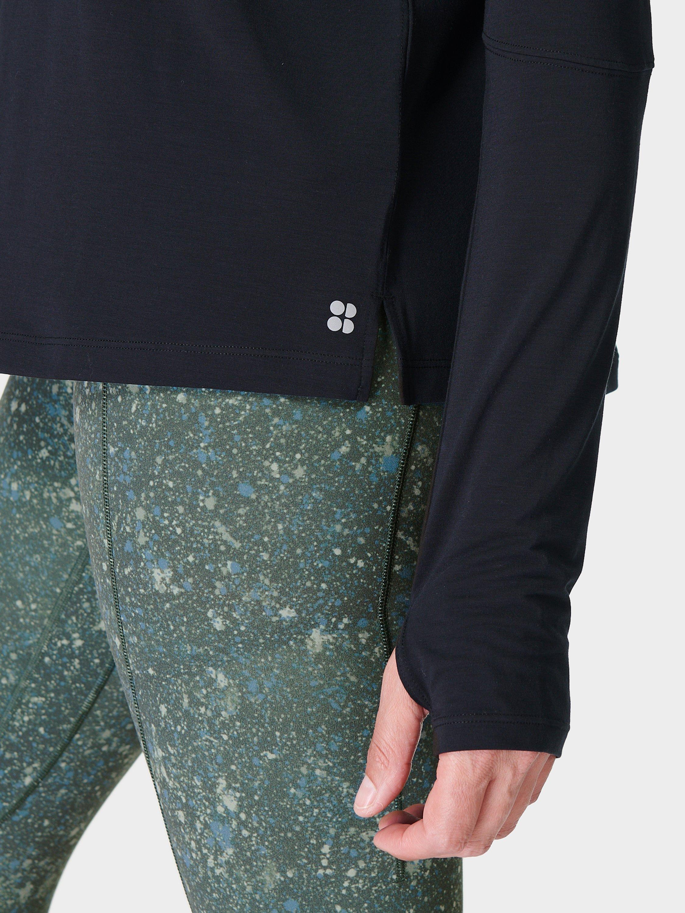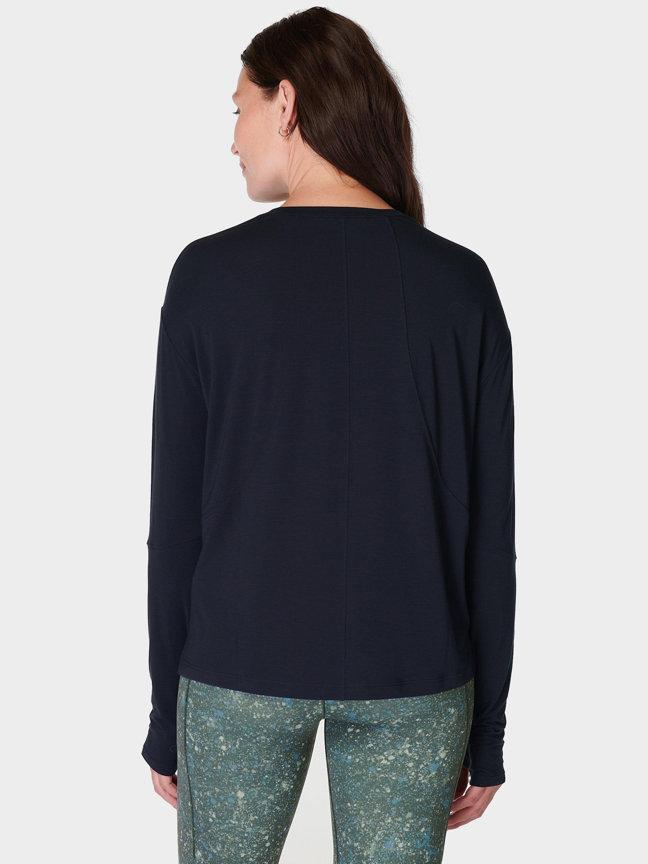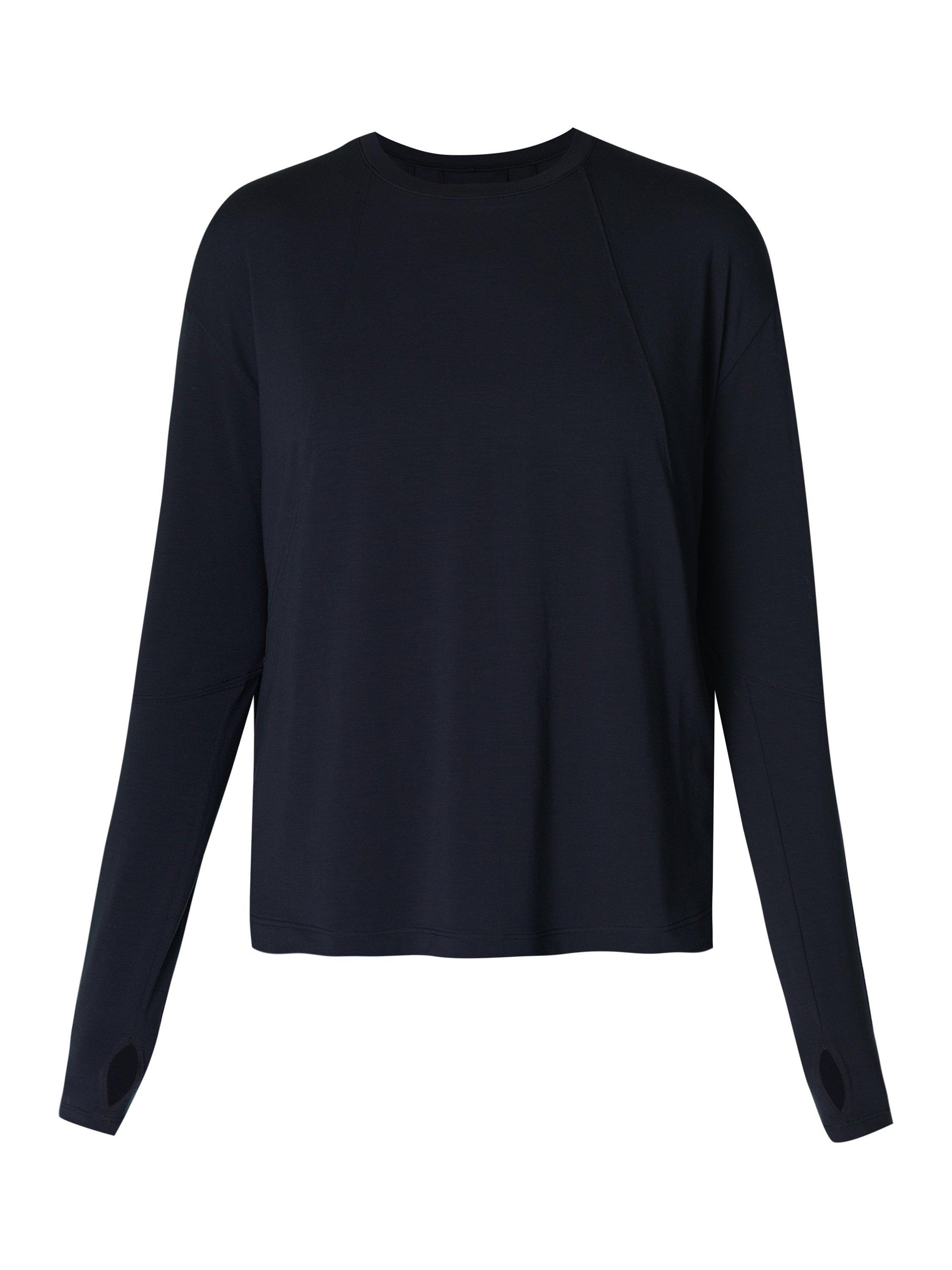 A new, long-sleeved addition to our popular studio workout collection. Soft, flowy fabric made from 72% recycled polyester. Easy, relaxed fit with a long sleeves and a classic crew neck. Thumbholes at the cuffs for colder days. Reflective logo detailing.