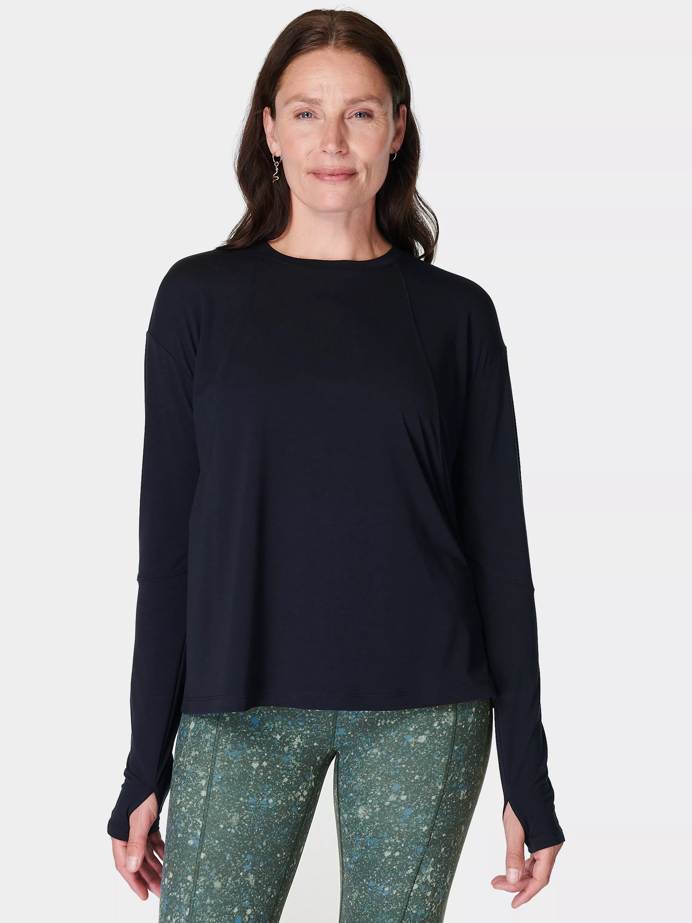 A new, long-sleeved addition to our popular studio workout collection. Soft, flowy fabric made from 72% recycled polyester. Easy, relaxed fit with a long sleeves and a classic crew neck. Thumbholes at the cuffs for colder days. Reflective logo detailing.