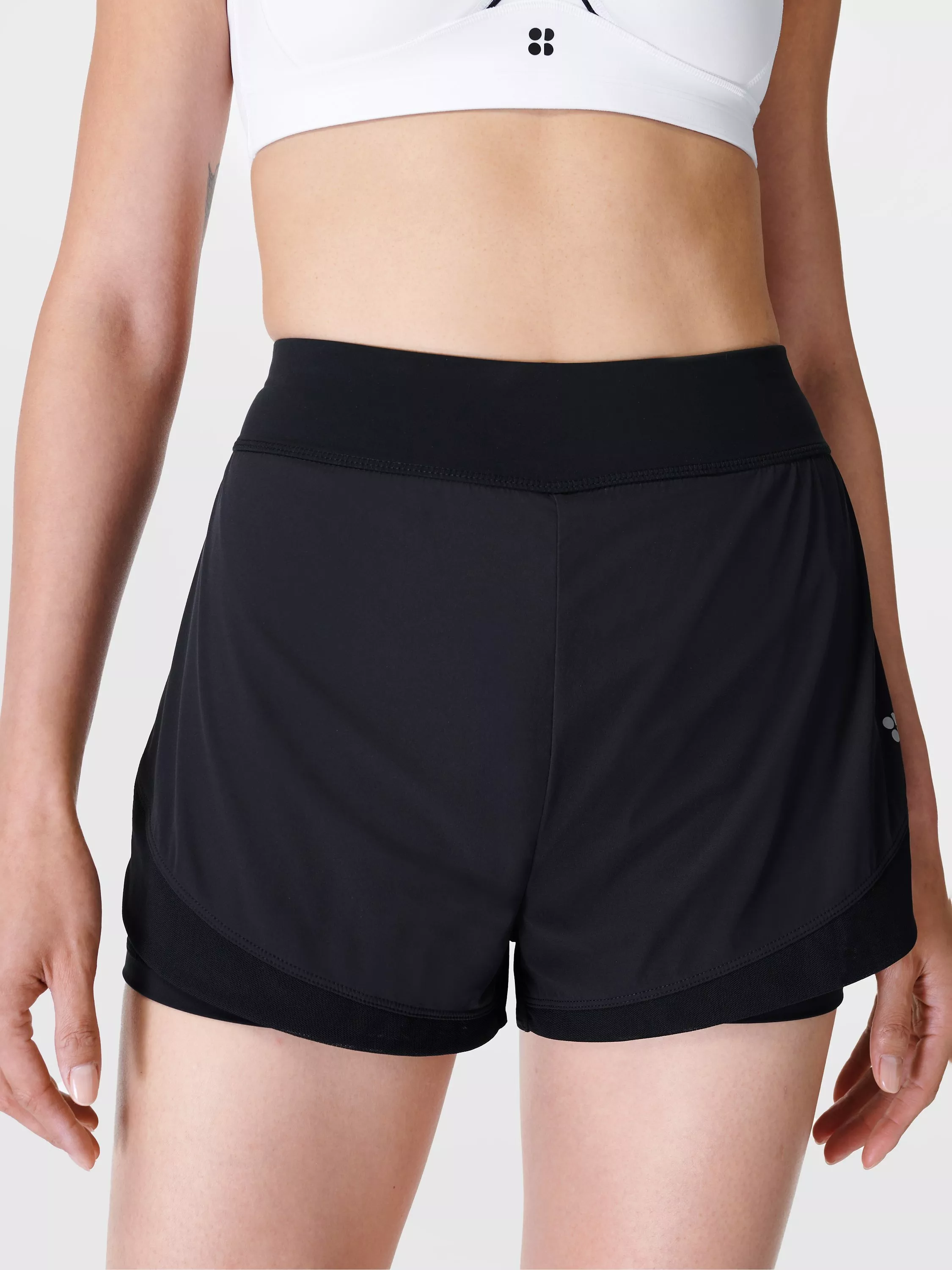 Sweaty Betty's two-in-one running shorts. Made from quick-drying, sweat-wicking fabric, the outer layer comes with mesh detailing and a high hem for freedom of movement. Inner Power Shorts with silicone grippers and phone pocket.