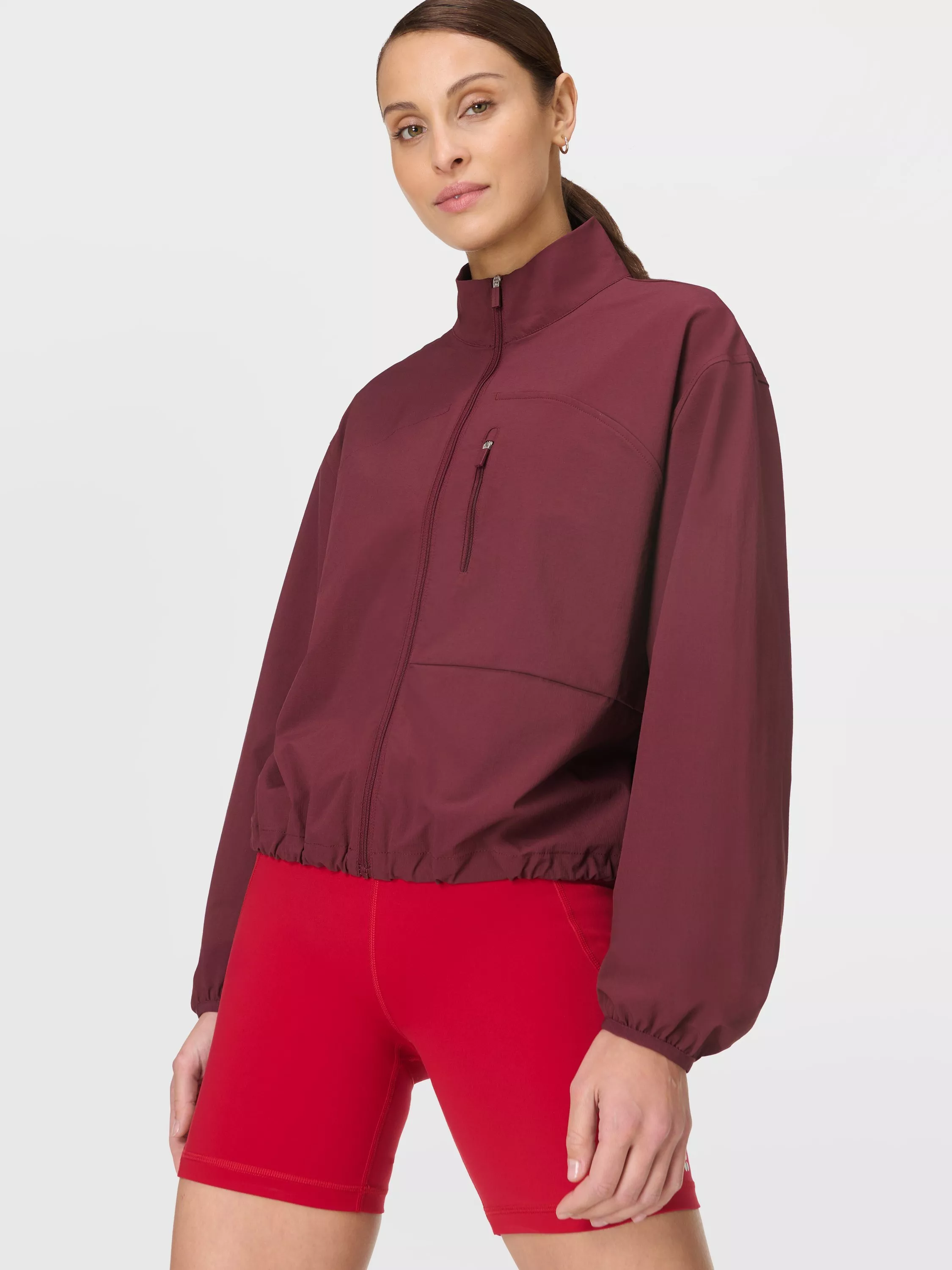 A water-resistant jacket for training and outdoor workouts. Sweat-wicking, water-resistant fabric with feminine stitch detailing. Relaxed fit with elasticated cuffs and adjustable hem with toggles. Zip pocket on the chest.