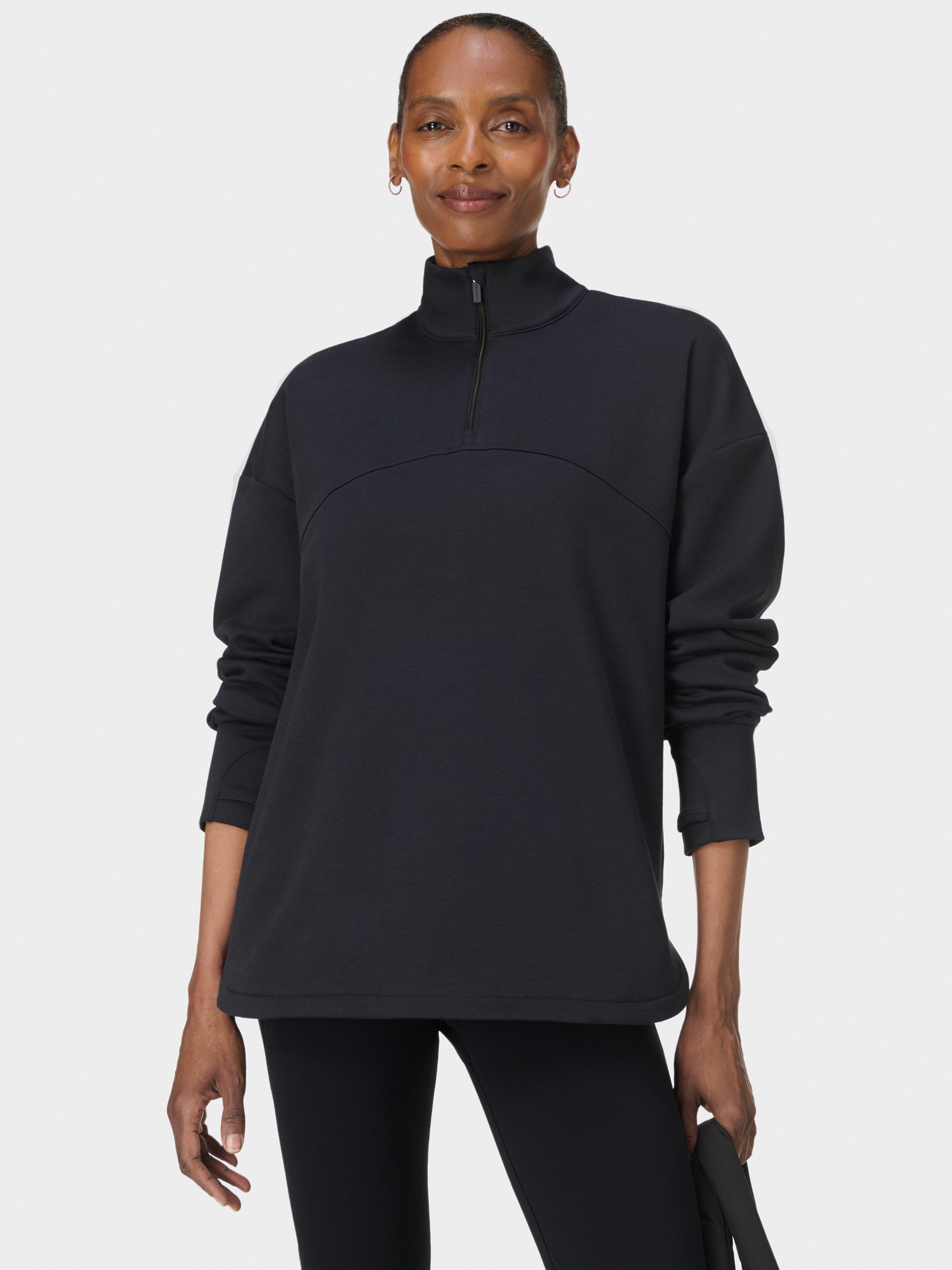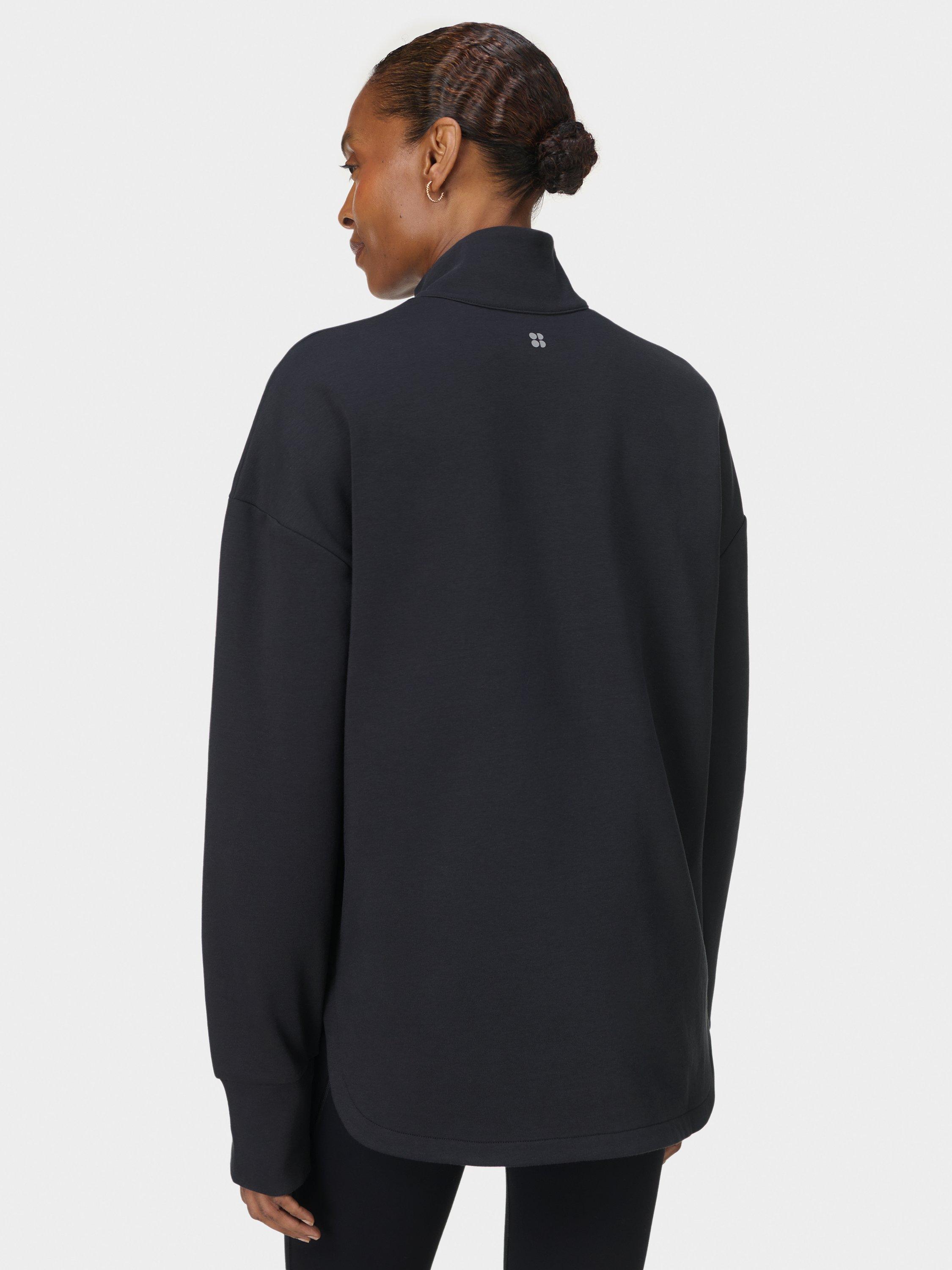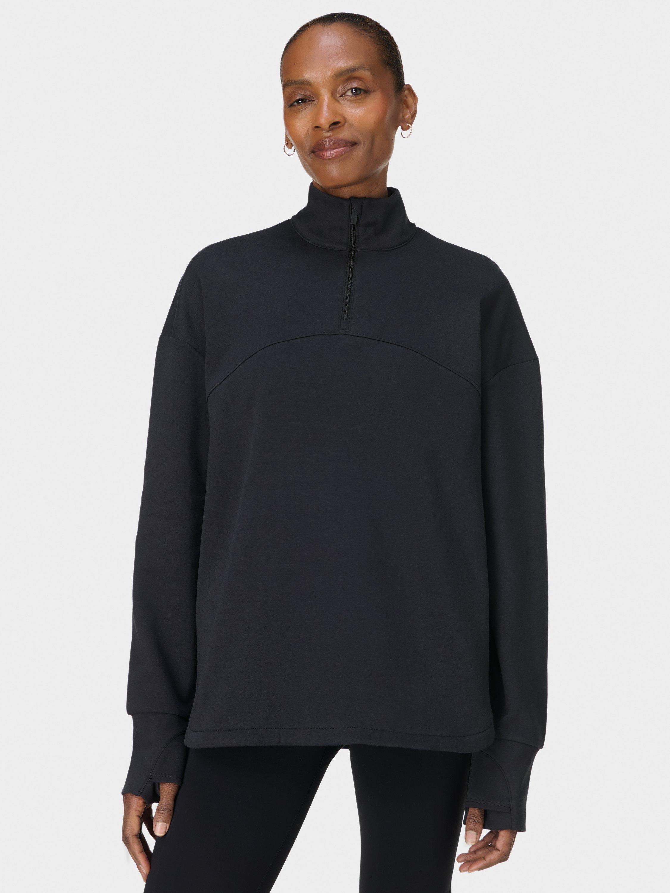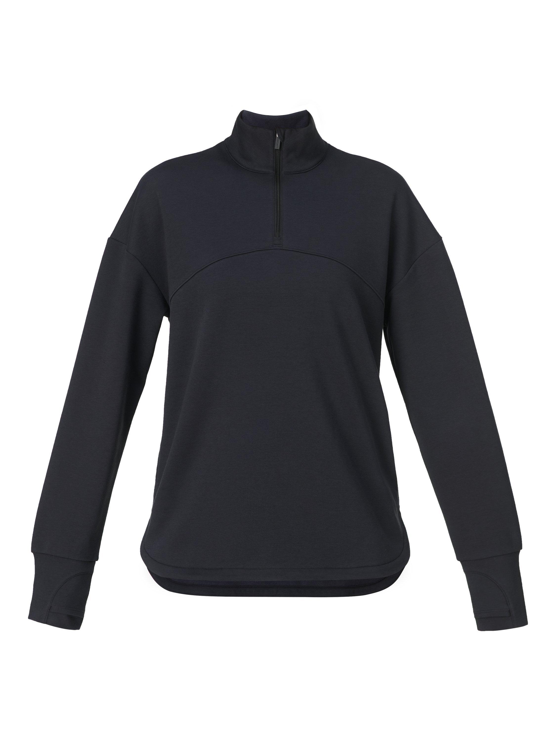 A half zip for studio workouts and everyday layering. Fabric is sweat-wicking, quick-drying and lined with soft fleece. Relaxed, longline fit with curved hem. Two concealed slip pockets and thumbholes for extra coverage. Reflective logo on the back.