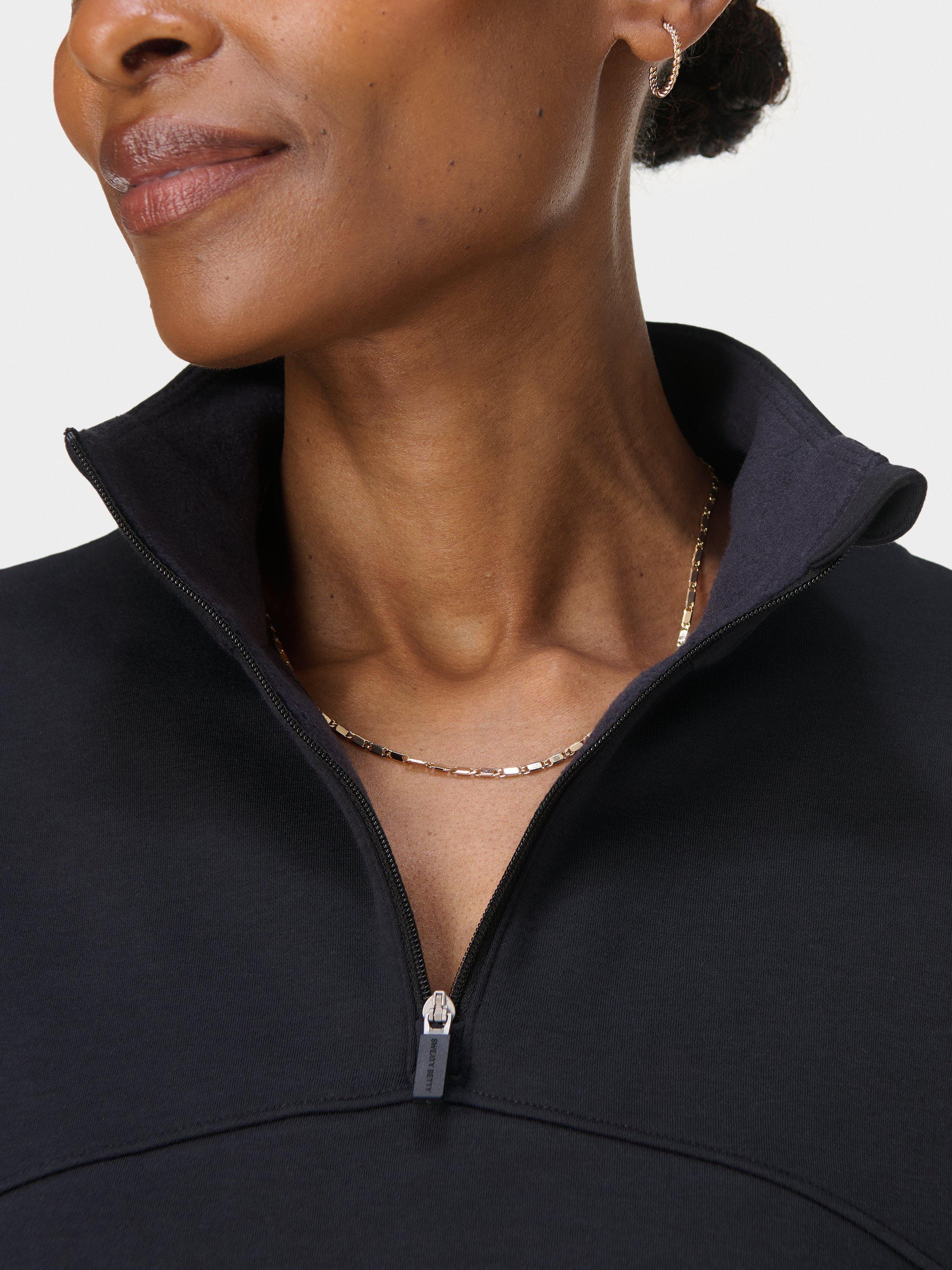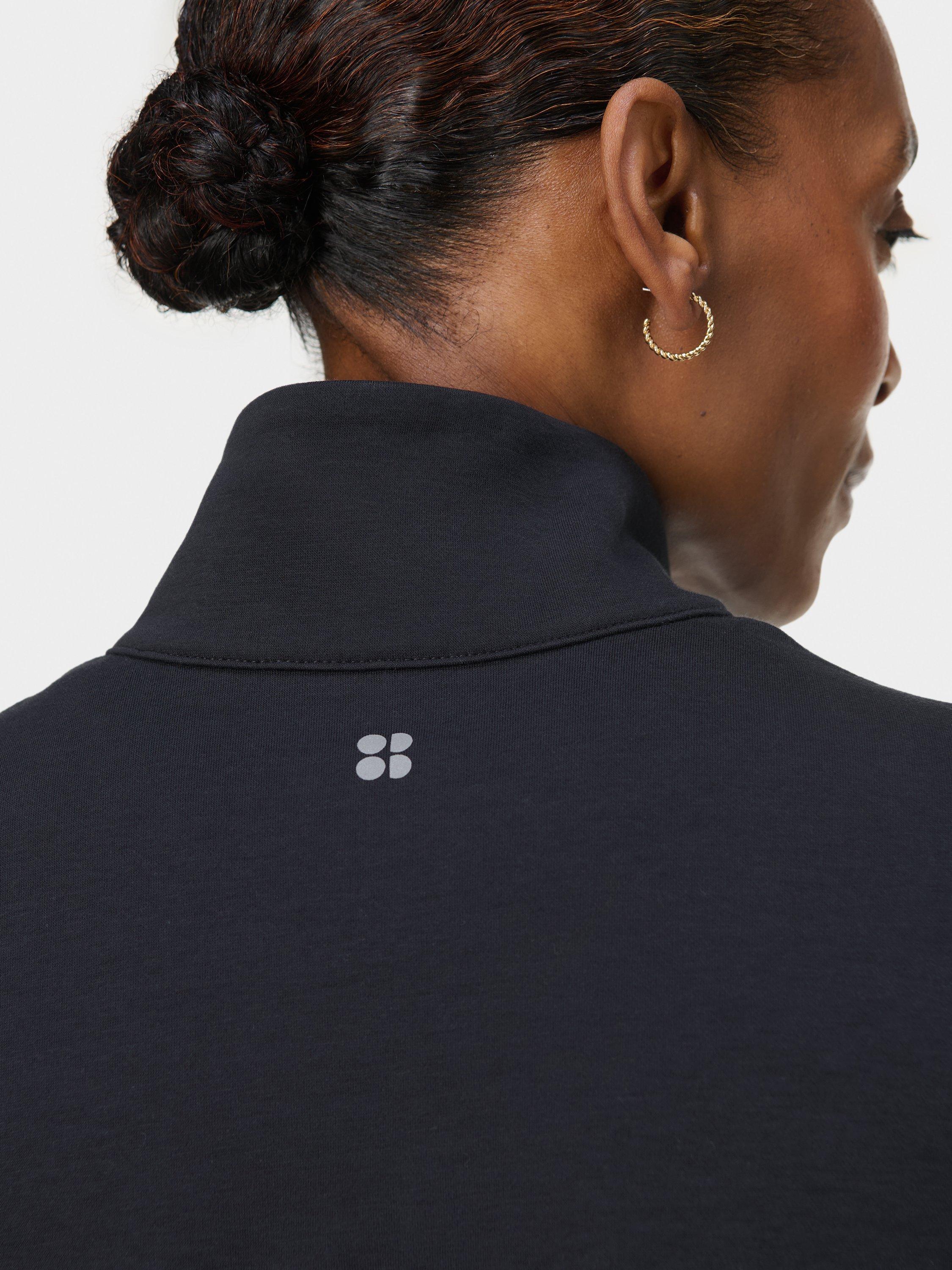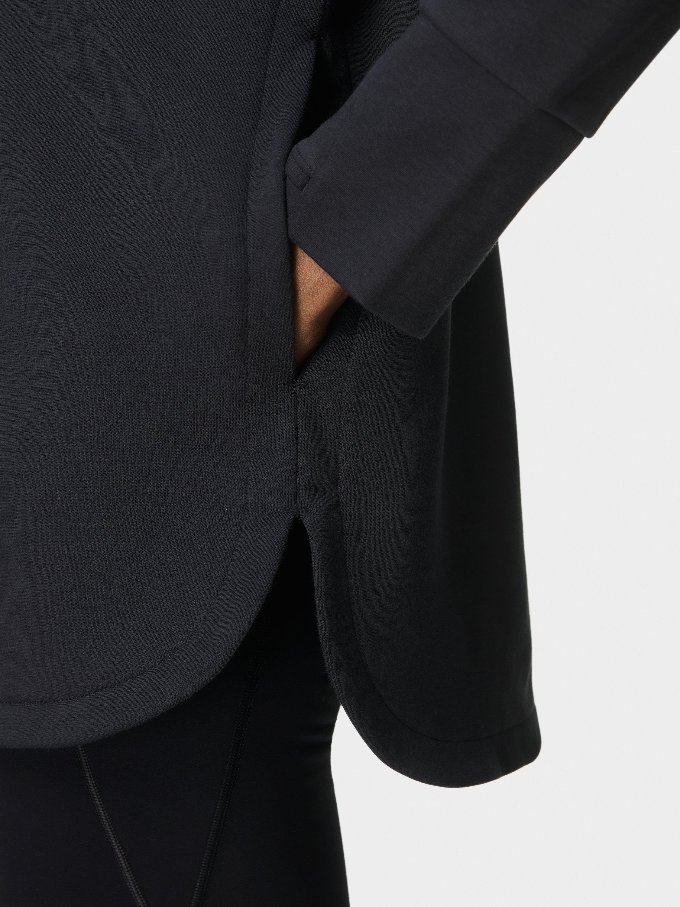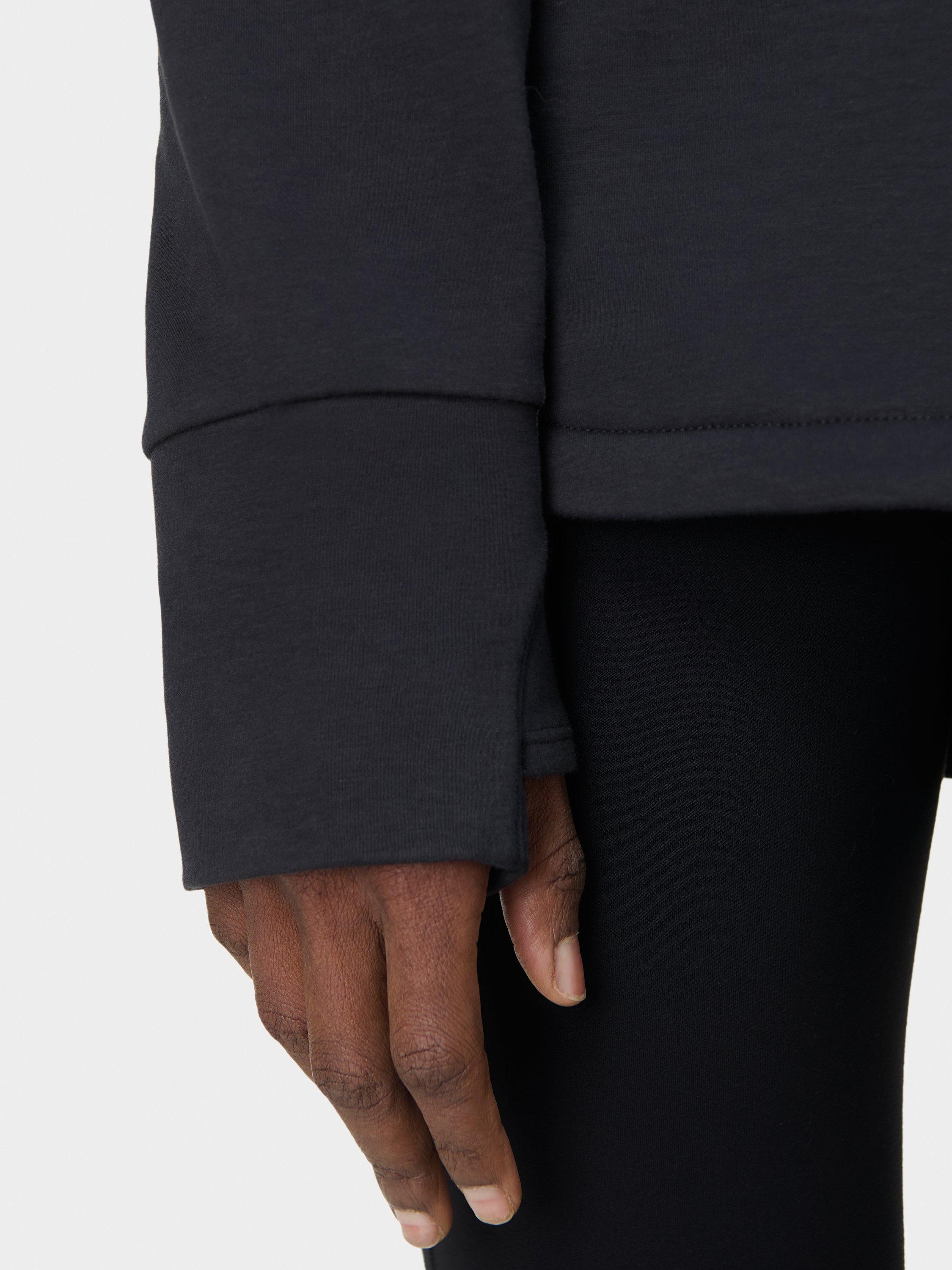 A half zip for studio workouts and everyday layering. Fabric is sweat-wicking, quick-drying and lined with soft fleece. Relaxed, longline fit with curved hem. Two concealed slip pockets and thumbholes for extra coverage. Reflective logo on the back.