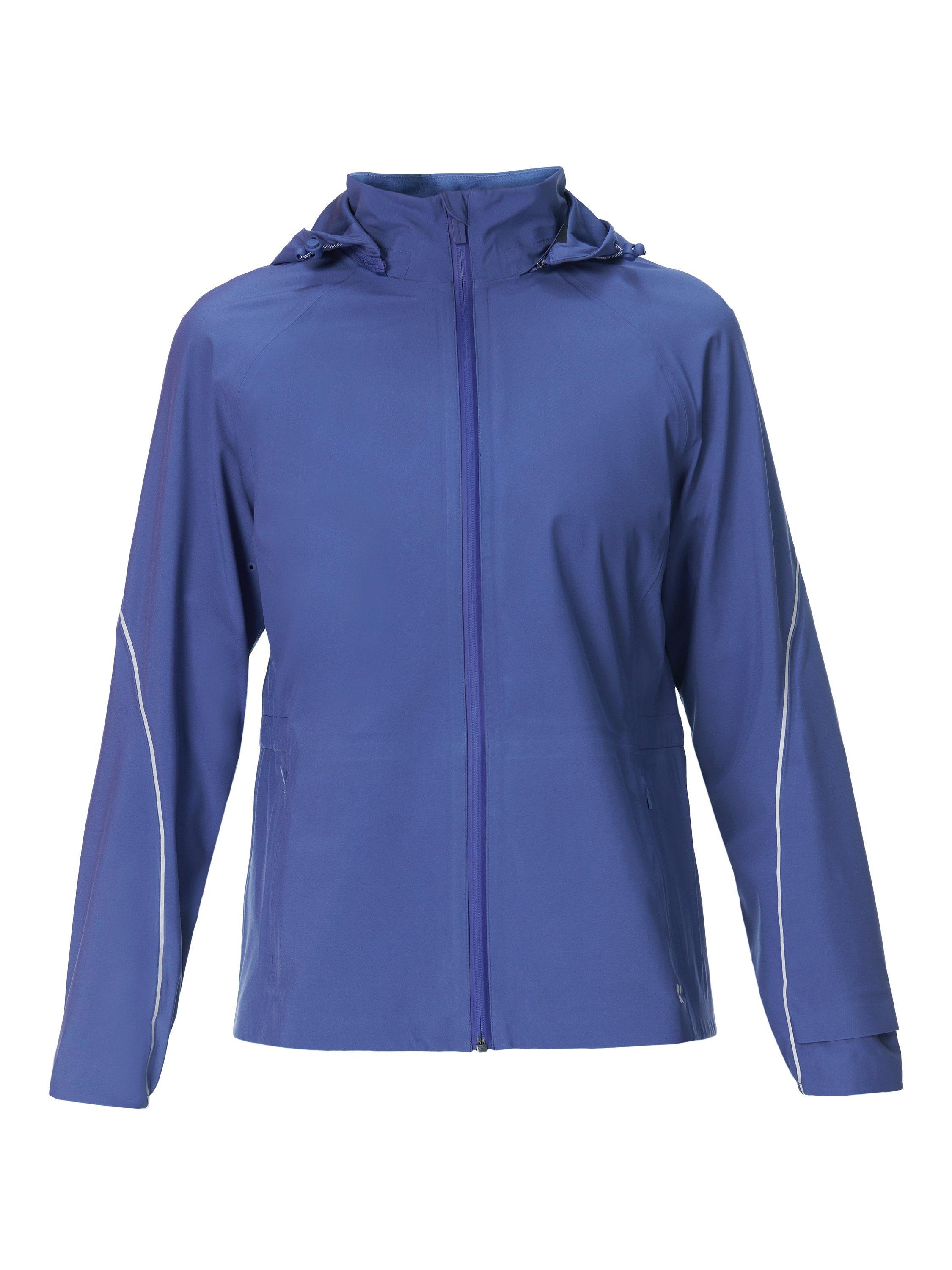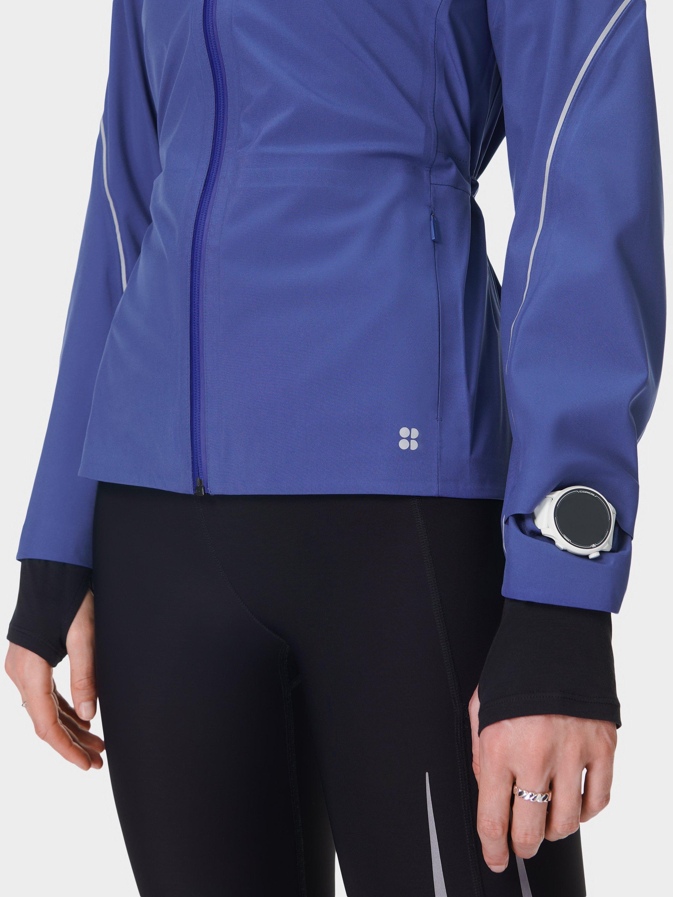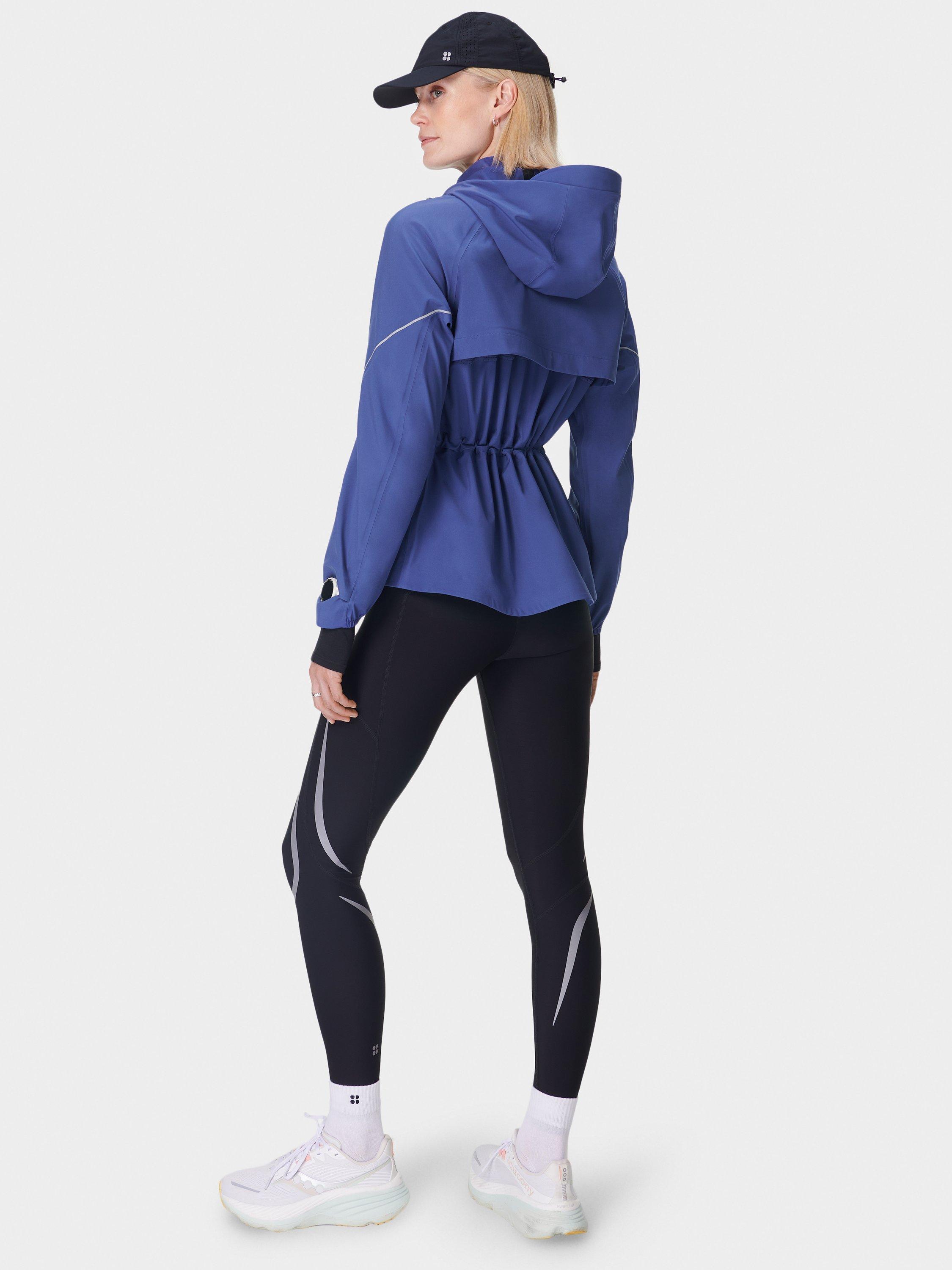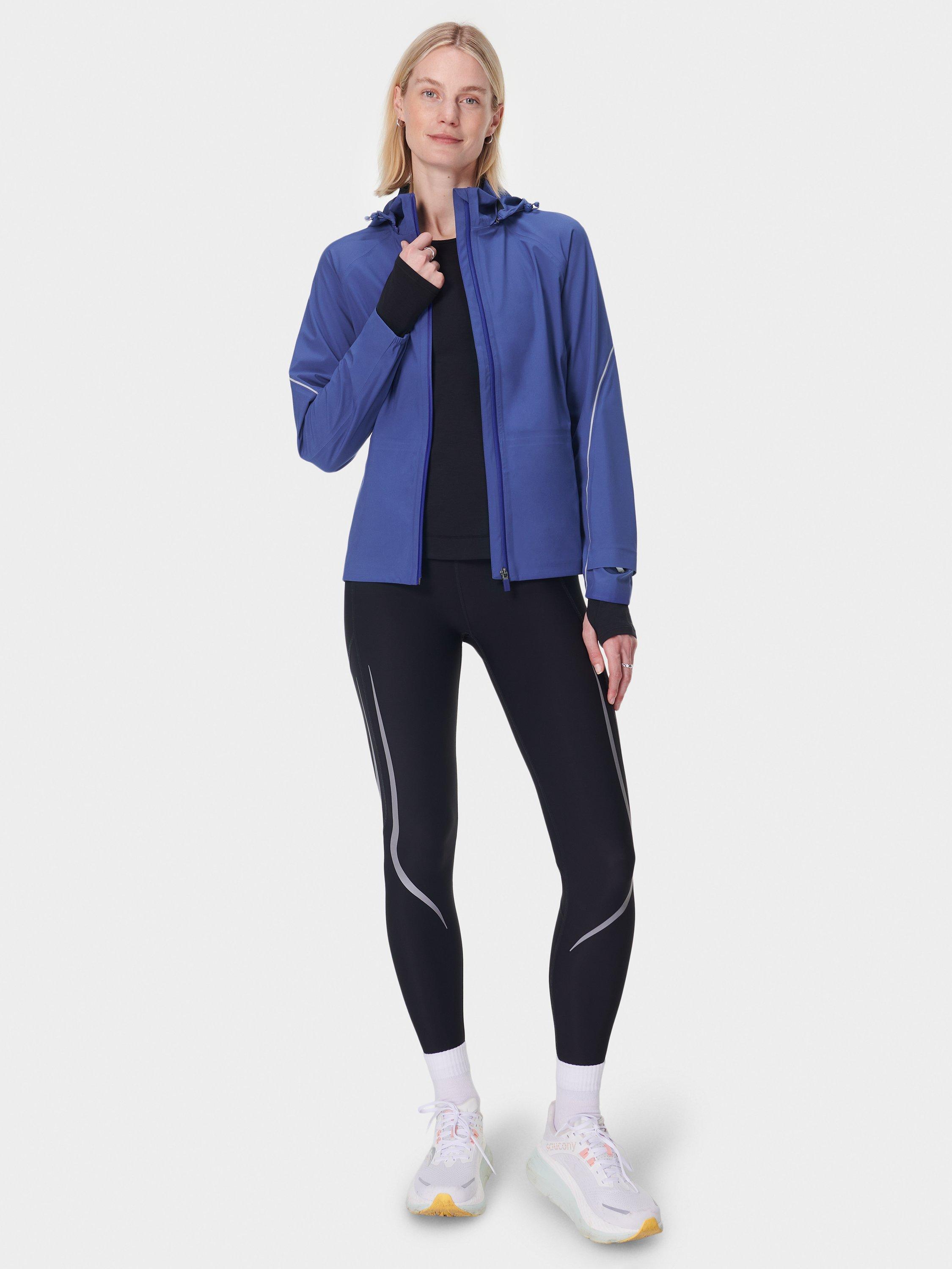 A water resistant jacket designed for post-workout activities. Made from breathable, 100% recycled material .Slim fit with Sweaty Betty wordmark on brushed fabric lined collar. Features reflective strips along seamlines and logo detailing. Elasticated waist with a concealed bungee, zip off hood and watch opening at cuffs.