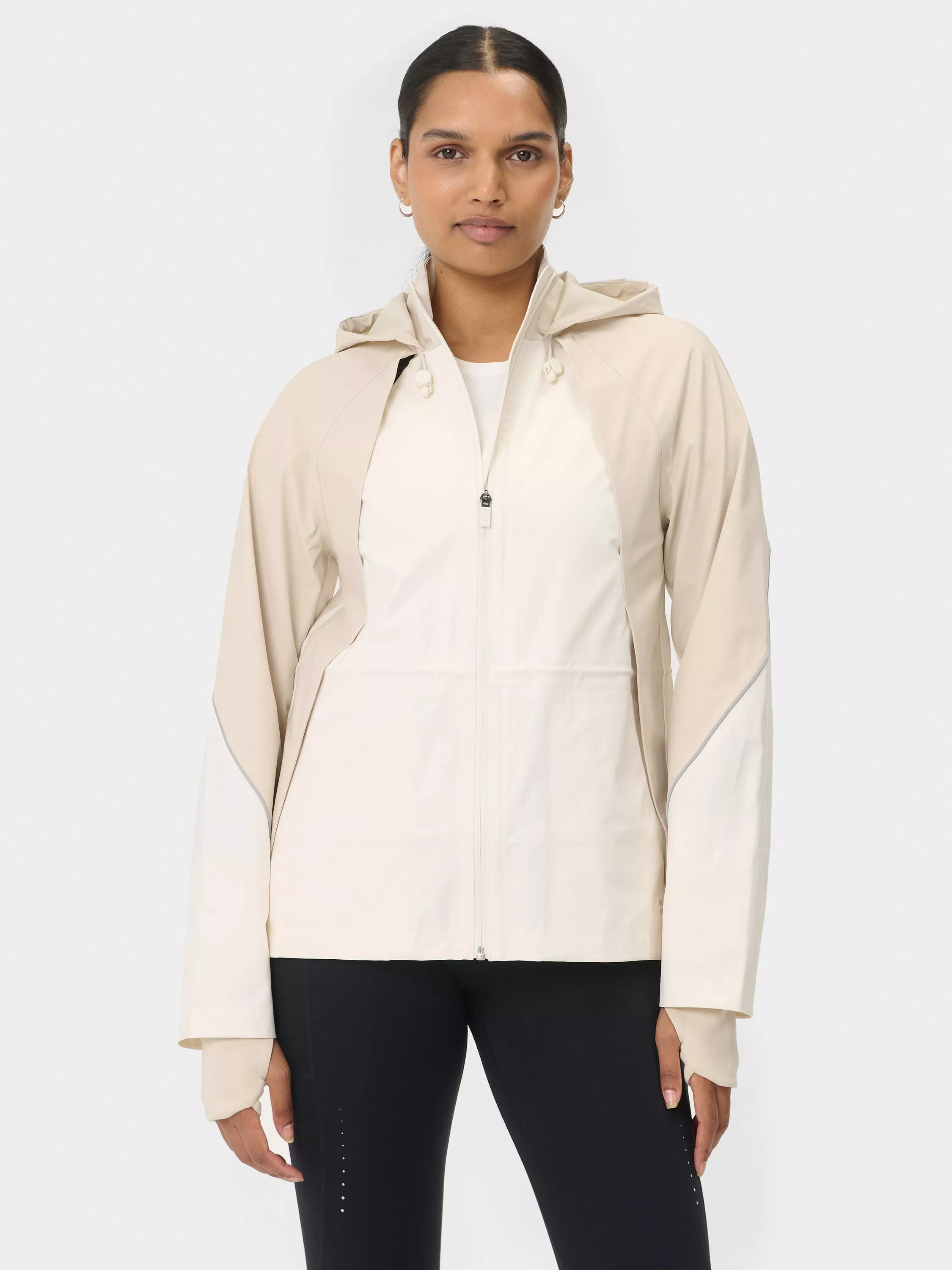 A waterproof running jacket. Designed with a breathable vent at the back, plus a fold-away hood and adjustable drawcord at the waist. Two front zip pockets and watch opening at the wrist. Waterproof AquaGuard zip with reflective details for extra visibility after dark.