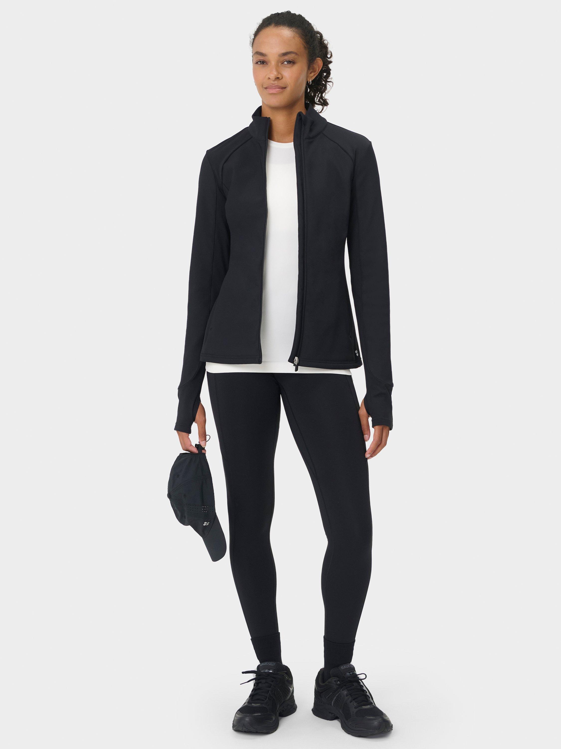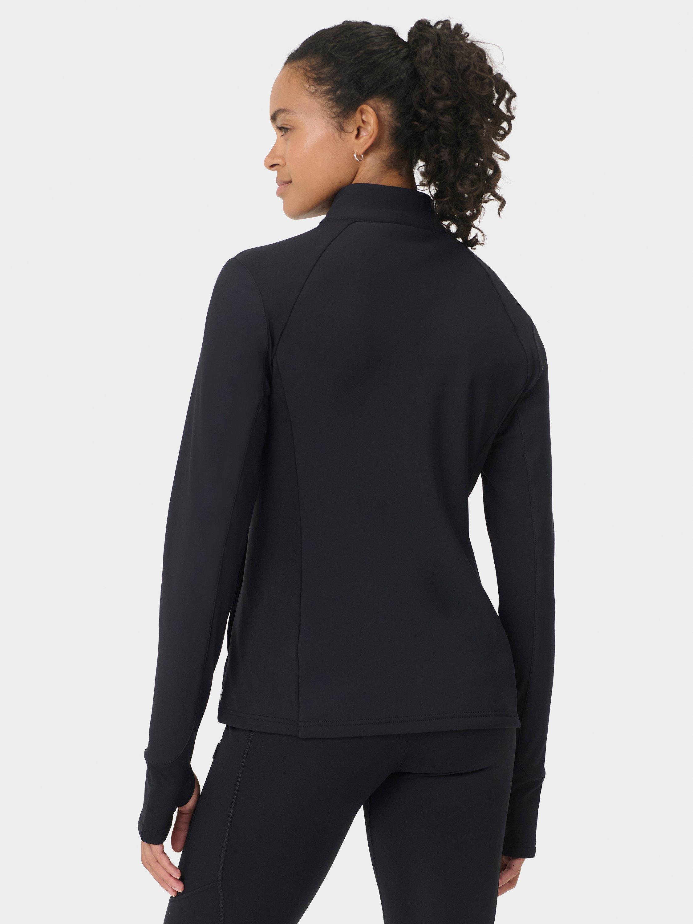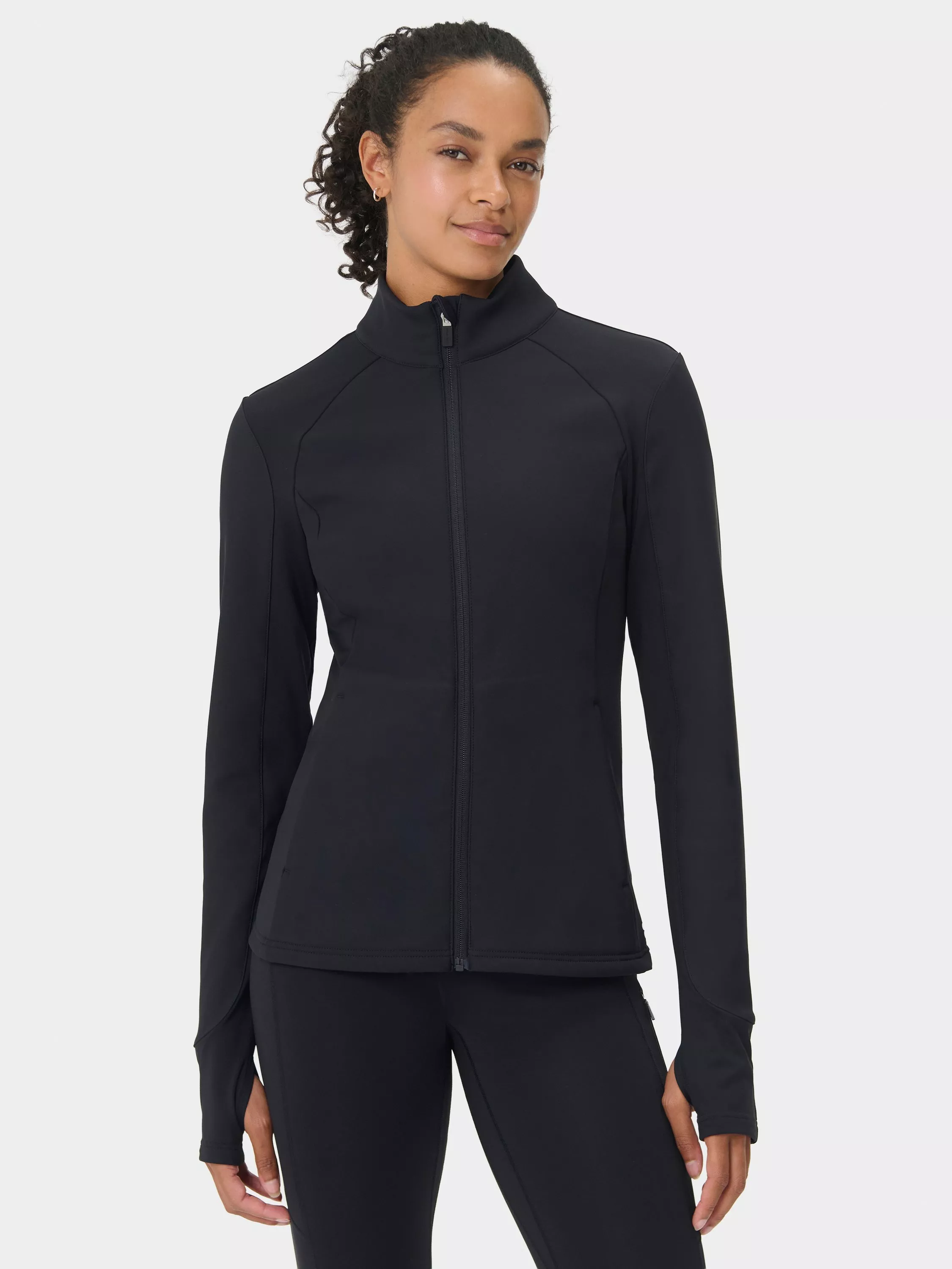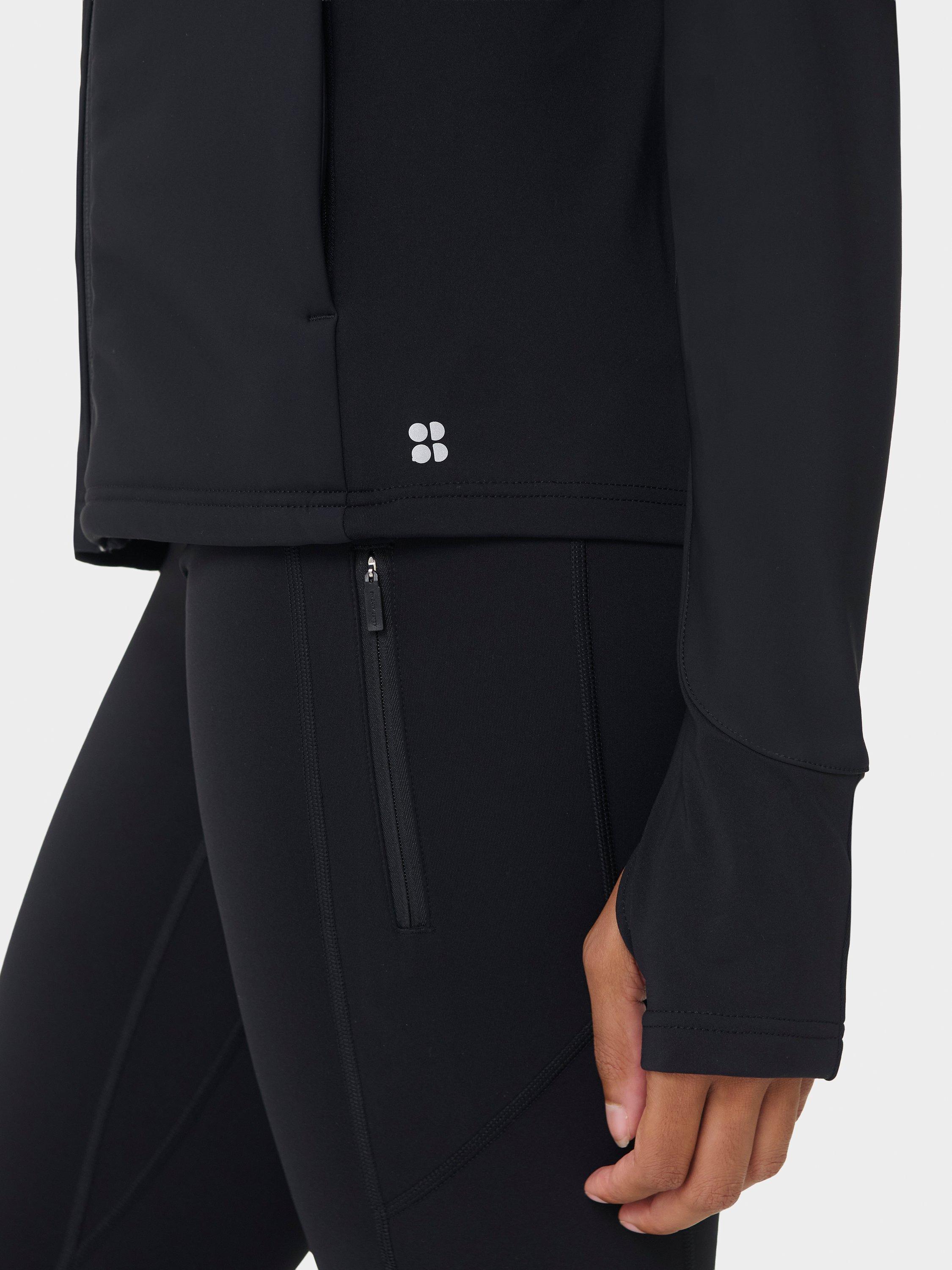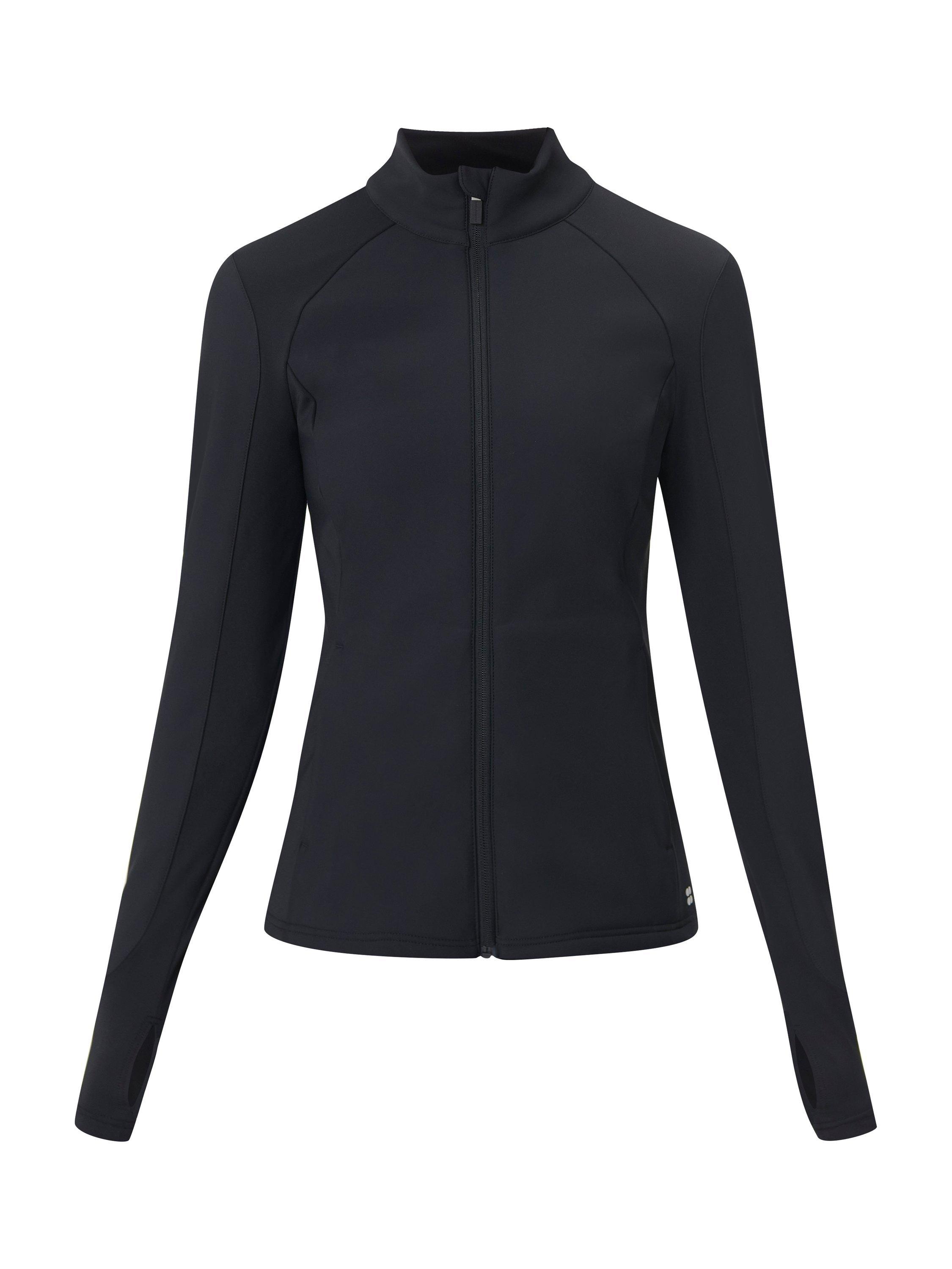 A water-resistant jacket for outdoor training. Softshell water-resistant fabric with a warm fleece lining and sweat-wicking panels under the arms. Slim fit with high neck and thumbholes for extra coverage. Two front zipped pockets.