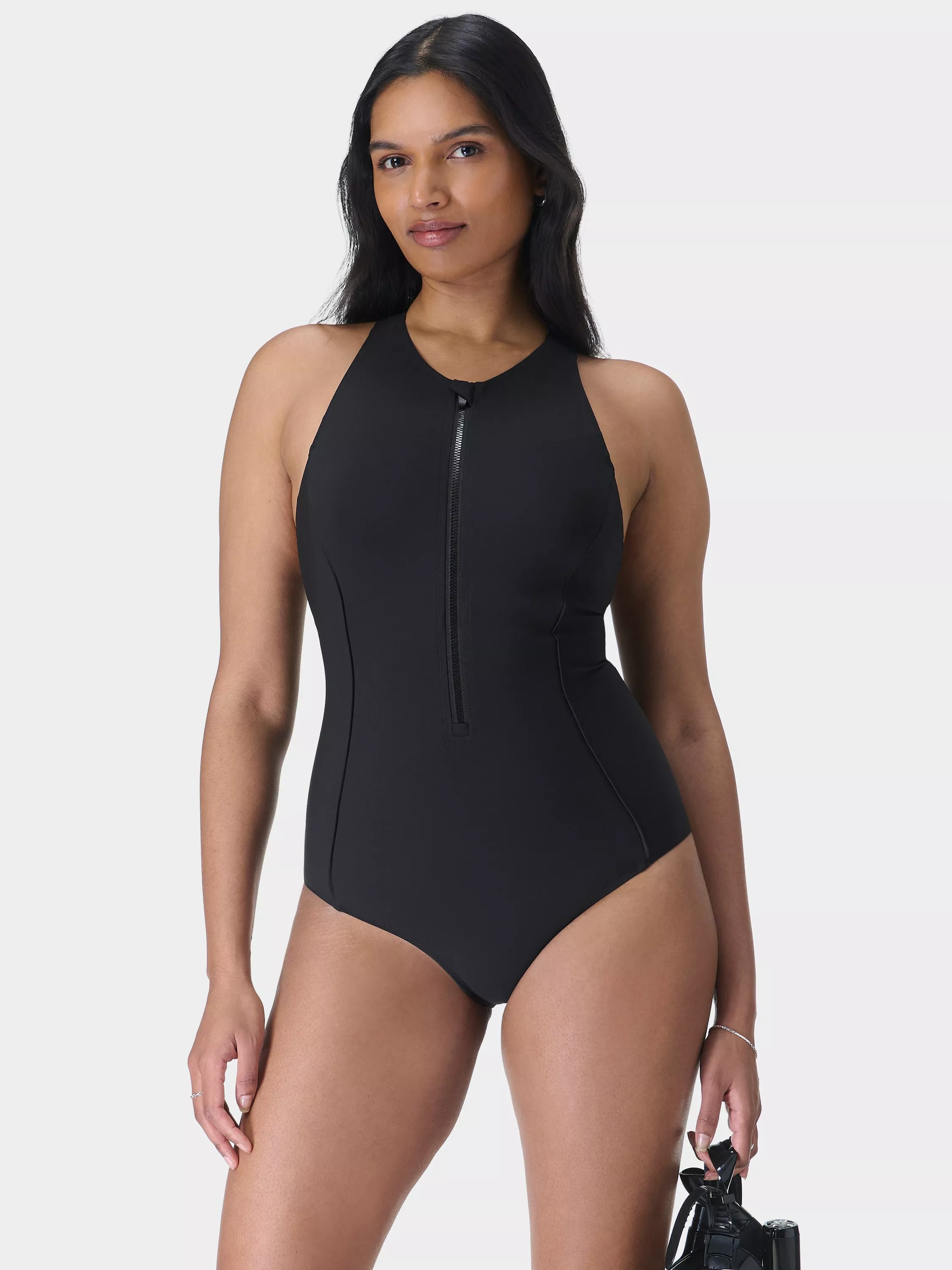 An elegant, round-neck swimsuit from Sweaty Betty boasting a sporty silhouette with a zip front and action-ready racer back. Made with part-recycled Xtra Life Lycra which resists chlorine damage up to 10x more than normal elastane. Protects against UV50+ rays. Features removable pads.