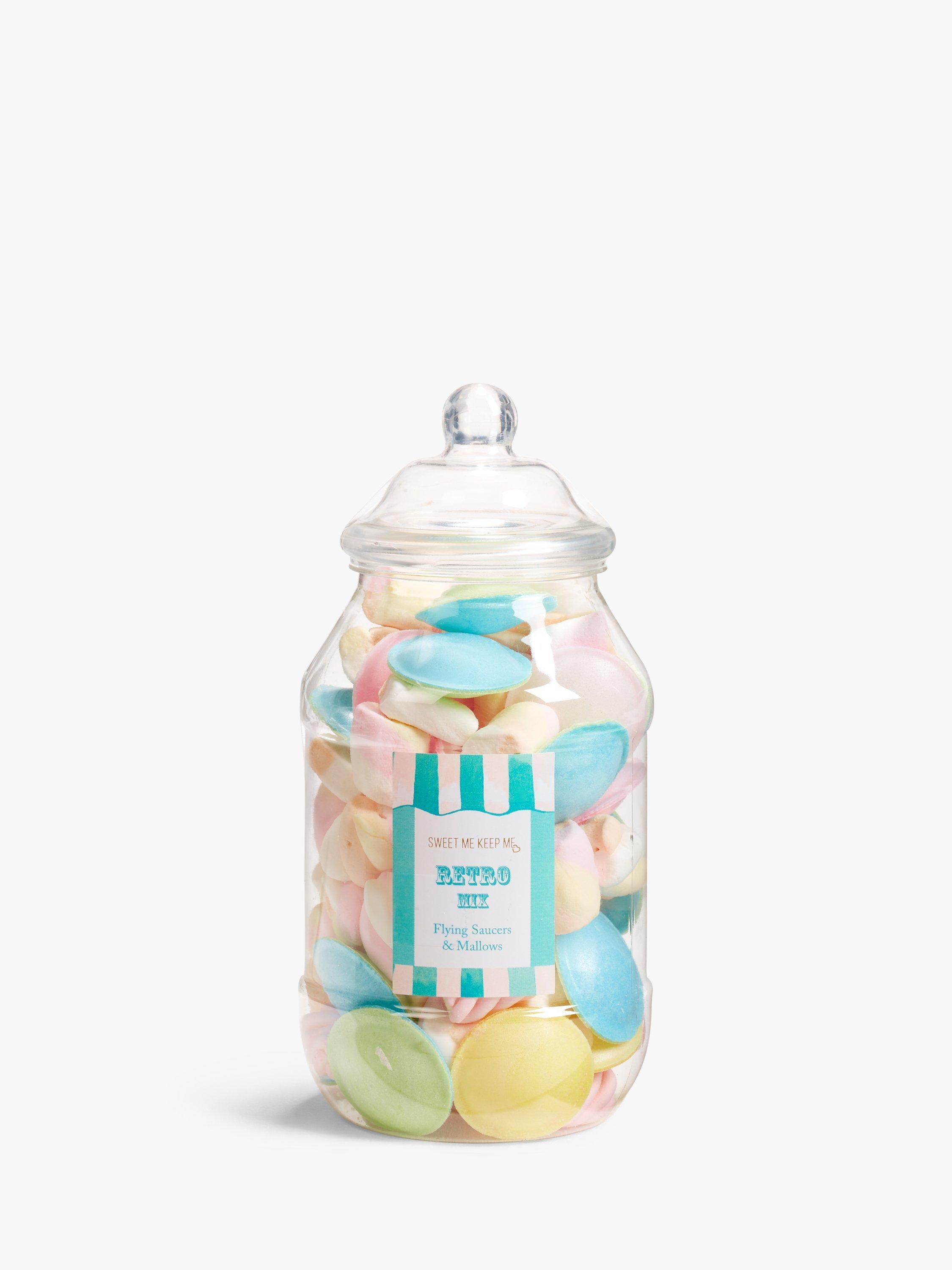 This fun retro mix sweet jar contains an assortment of fizzy flying saucers and soft mallows.