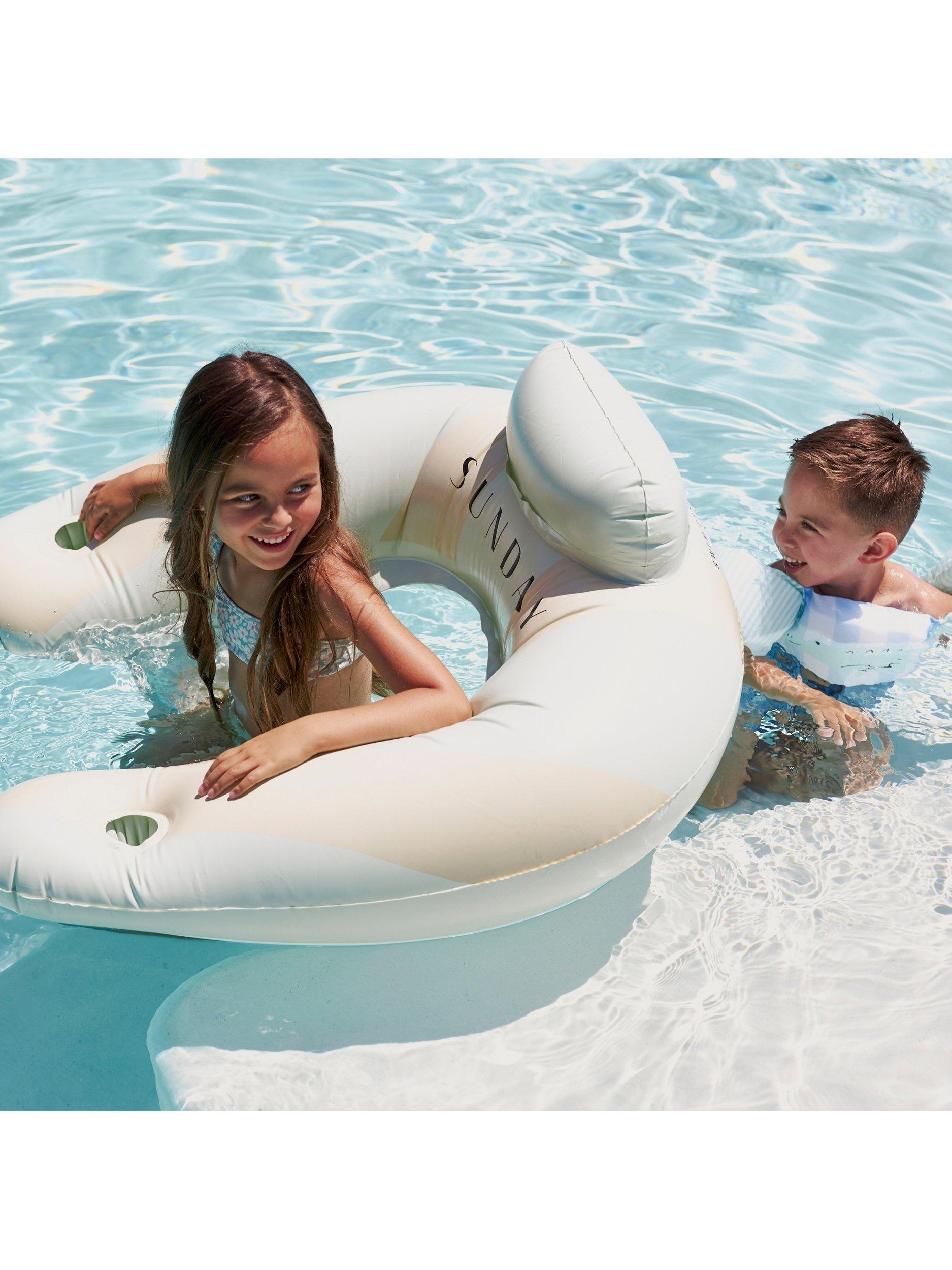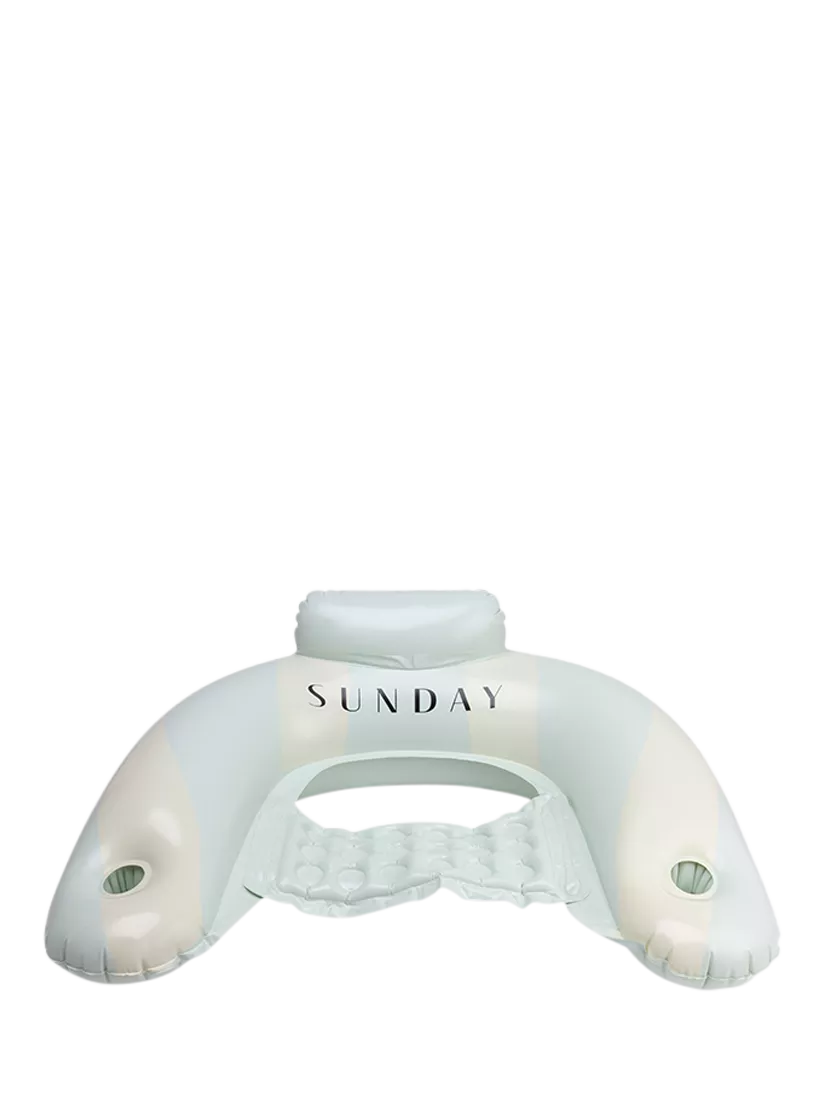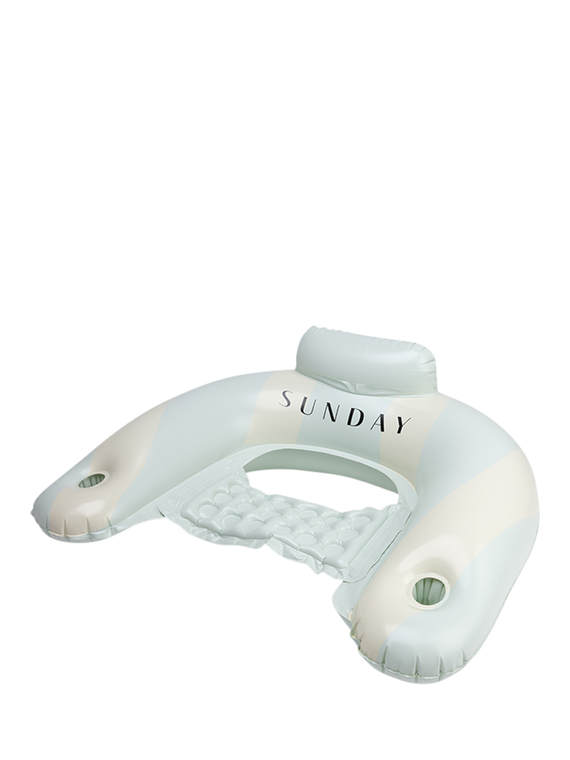 The Resort Stripe Water Lounge Float offers stylish comfort with a soft headrest and convenient cupholders. Its trendy green and white stripes make it an ideal, lightweight inflatable for relaxing by the pool or beach.
