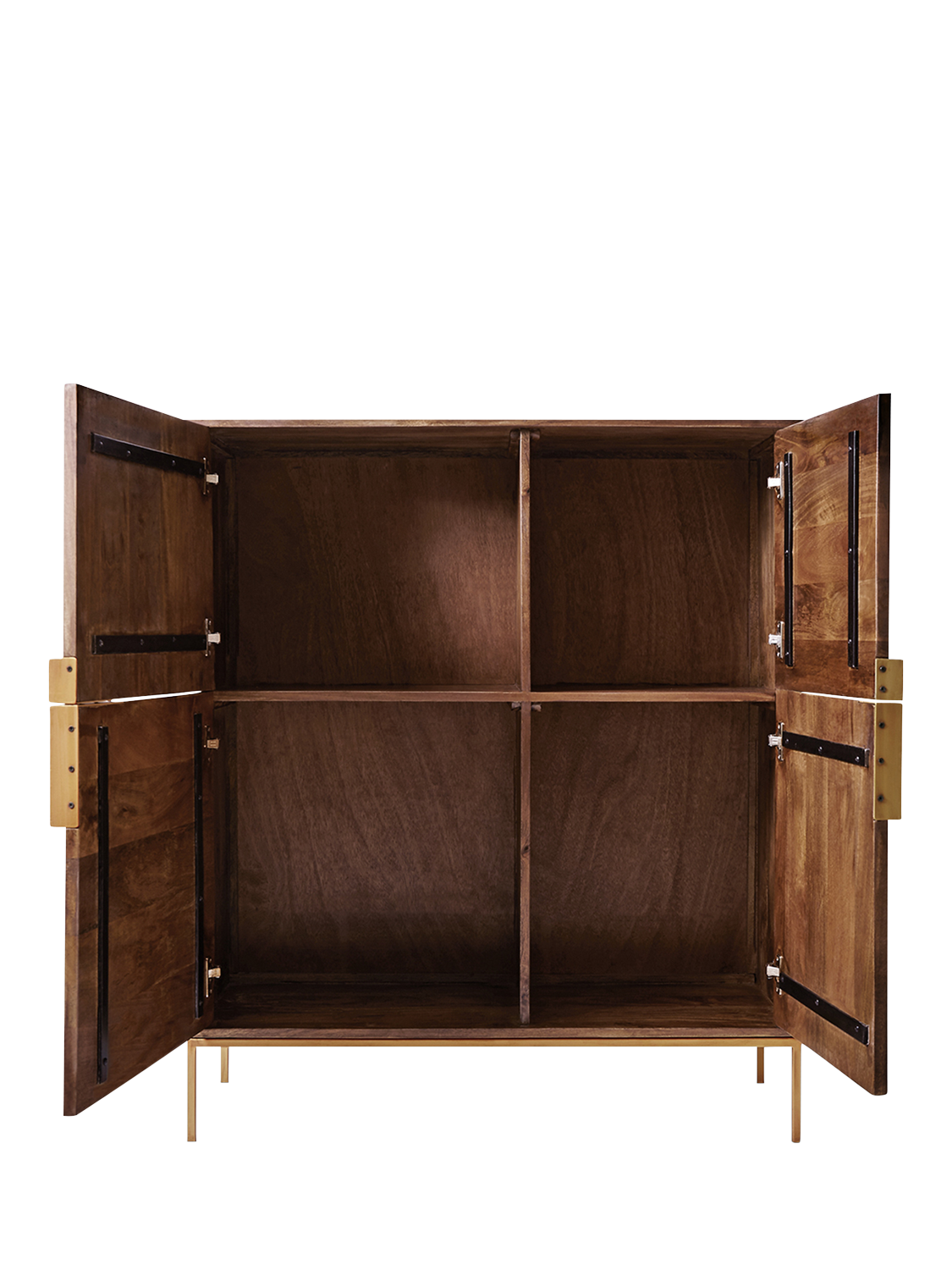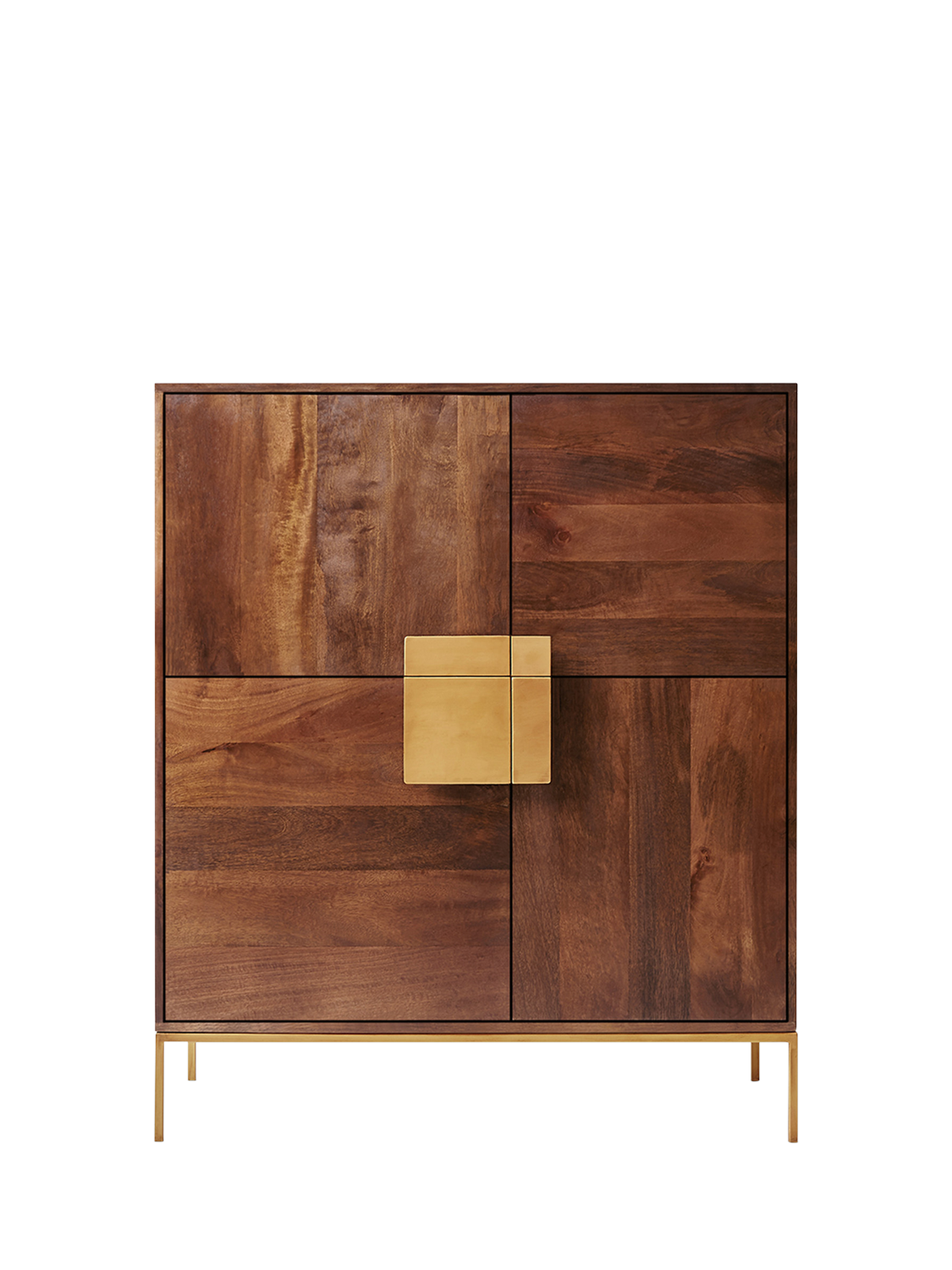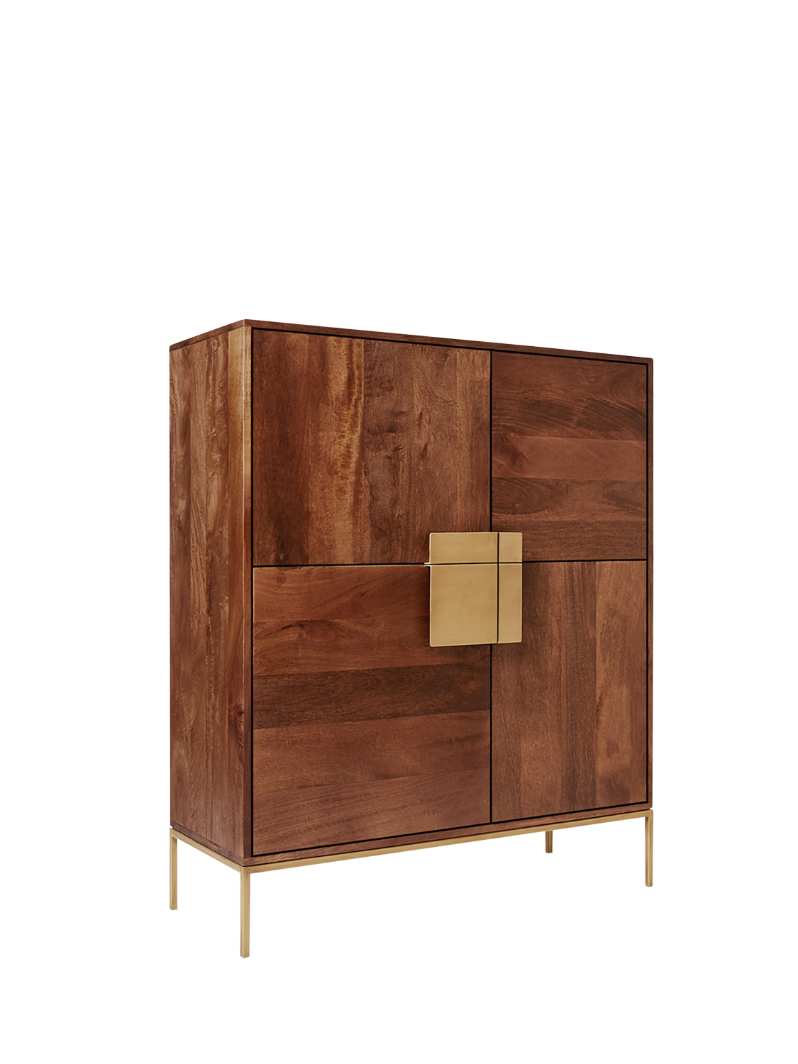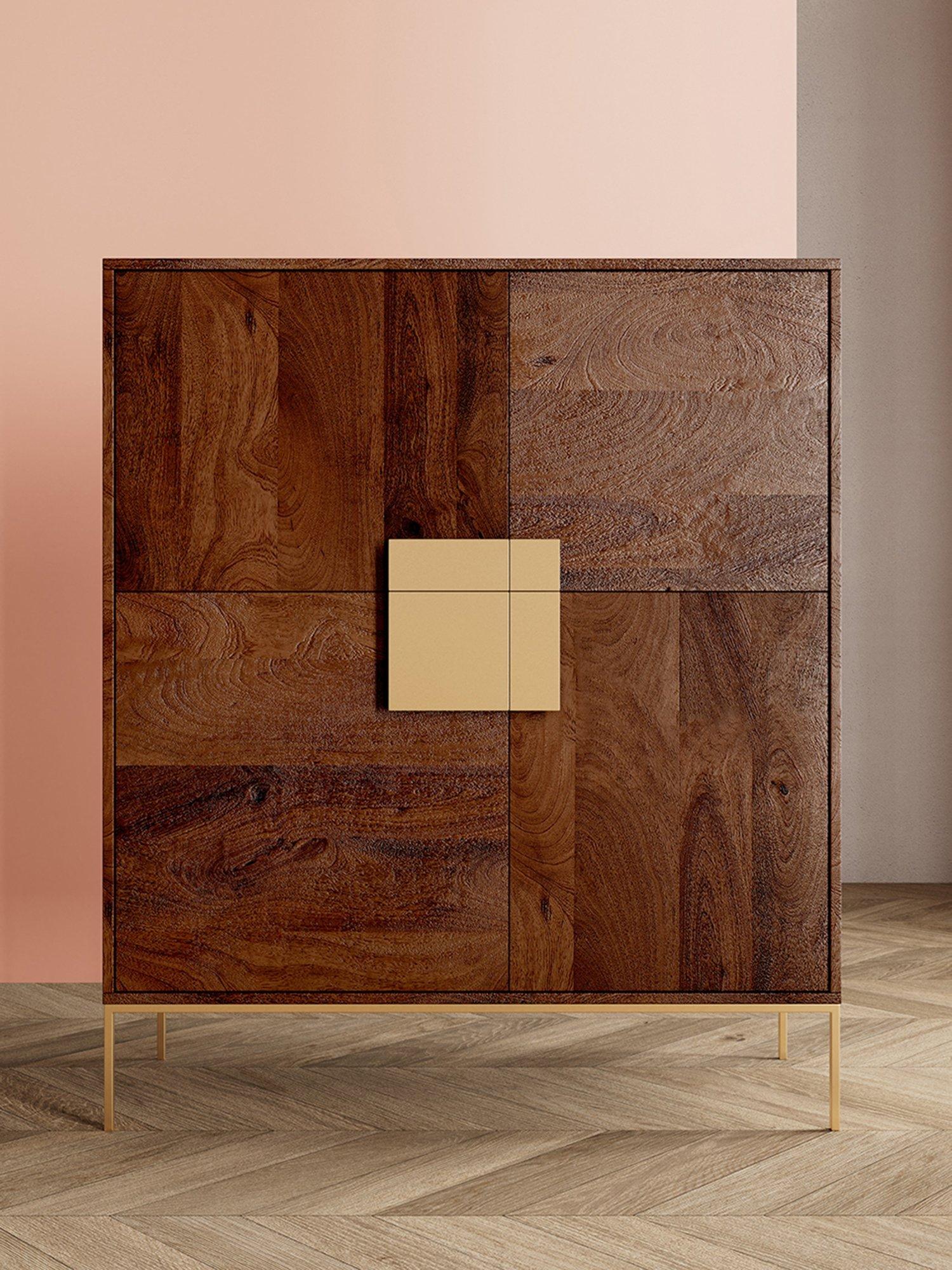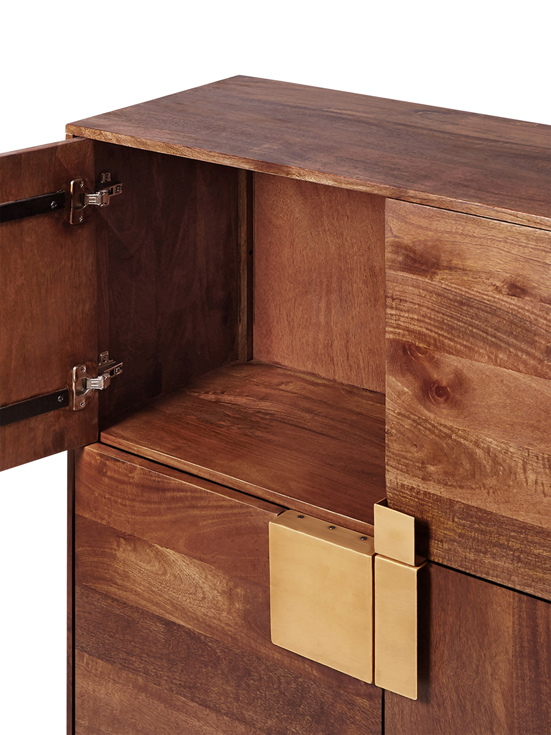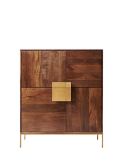 Richly coloured mango wood with a flash of antique brass, this mid-century styled Deco cabinet will add a bold dose of depth to your room. There are four cupboards with three opening asymmetrical doors in total. The right sided door opens as one unit.