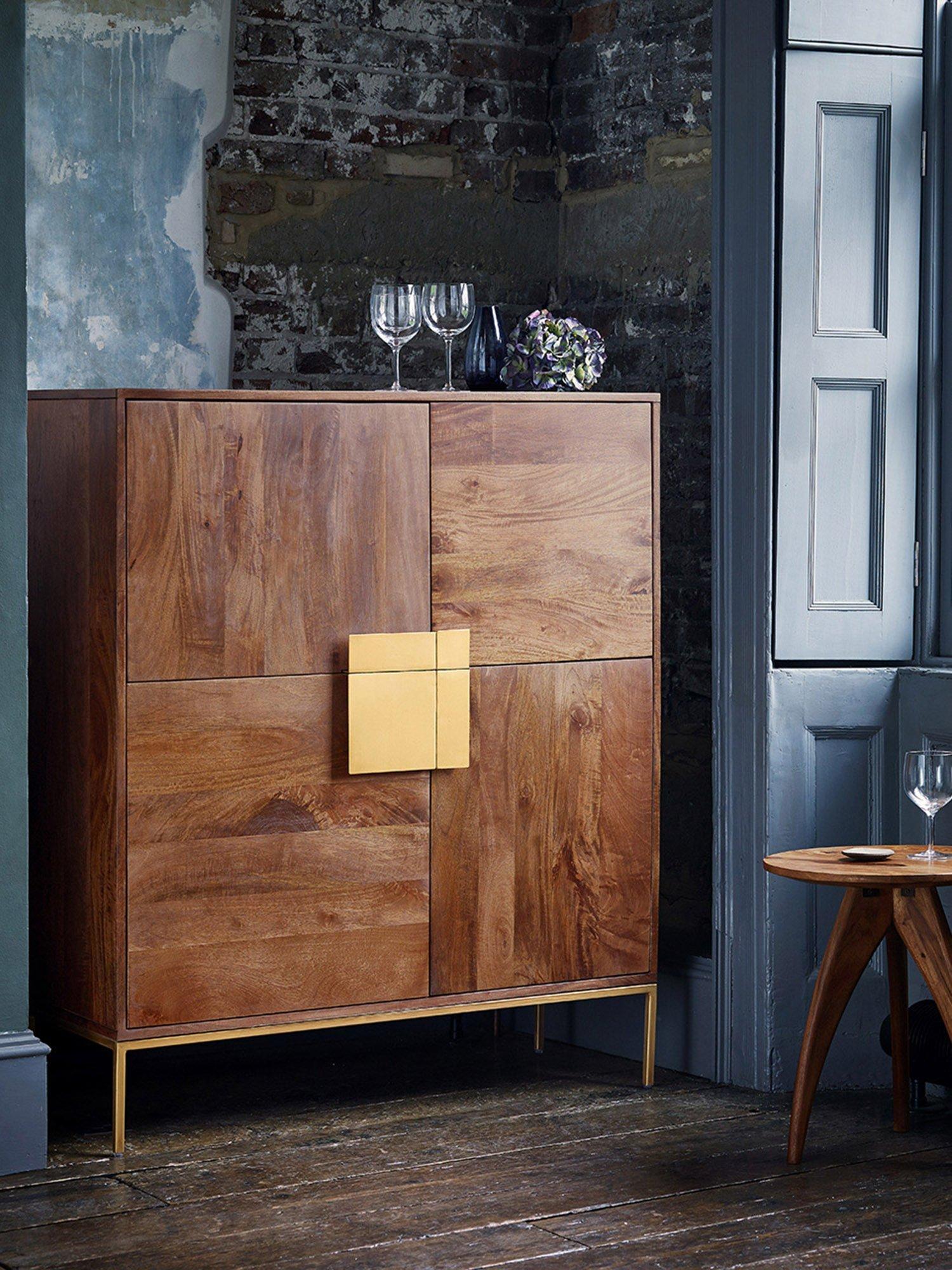 - Mango wood body and shelves, antique brass finished steel legs, handles and underframe, engineered back panel