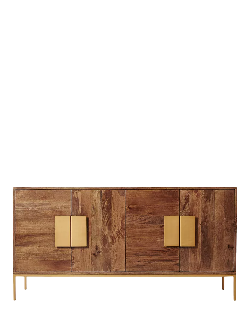 - Materials: mango wood body and shelves, steel legs, underframe and handles, engineered back panel.Finish: wood stained and sealed in light brown, metal powder coated Brass, back panel stained to match body.