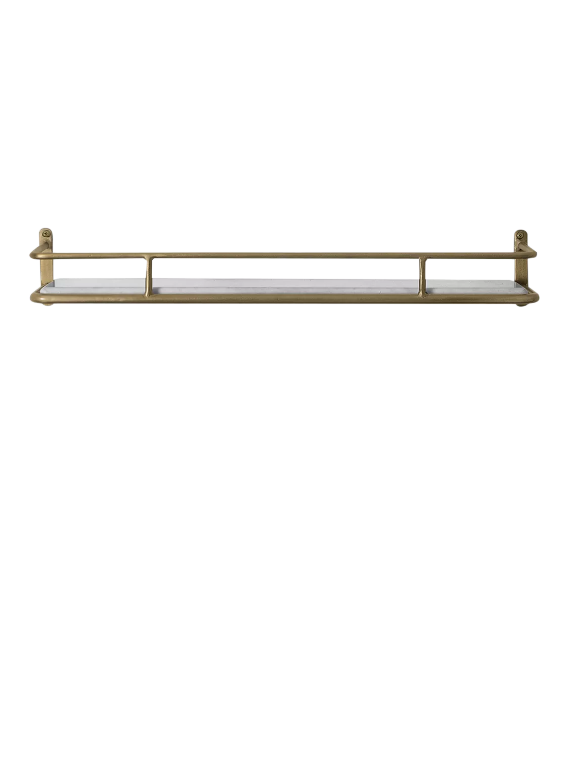 - Materials: steel framework, white marble shelf.Finish: brass-plated steel, polished white marble.
