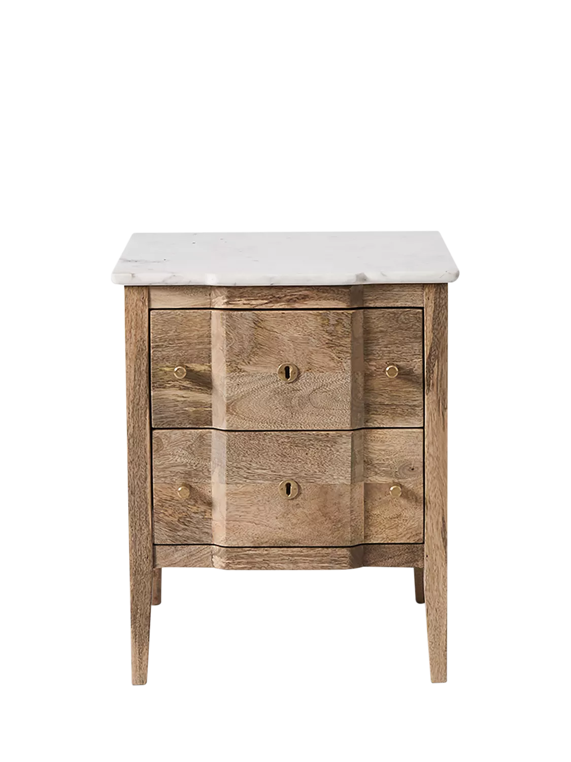 Introduce a touch of refined vintage charm to your bedroom with the Duval Bedside Table. Expertly crafted from sandblasted mango wood, its soft tones and unique texture create a rustic yet sophisticated look that complements both classic and contemporary interiors. The beautifully curved front and antique-inspired brass ring pulls bring a timeless elegance, while two roomy drawers provide practical storage for your bedtime essentials. Durable, distinctive and full of character, the Duval is the perfect finishing touch to elevate your sleep sanctuary.