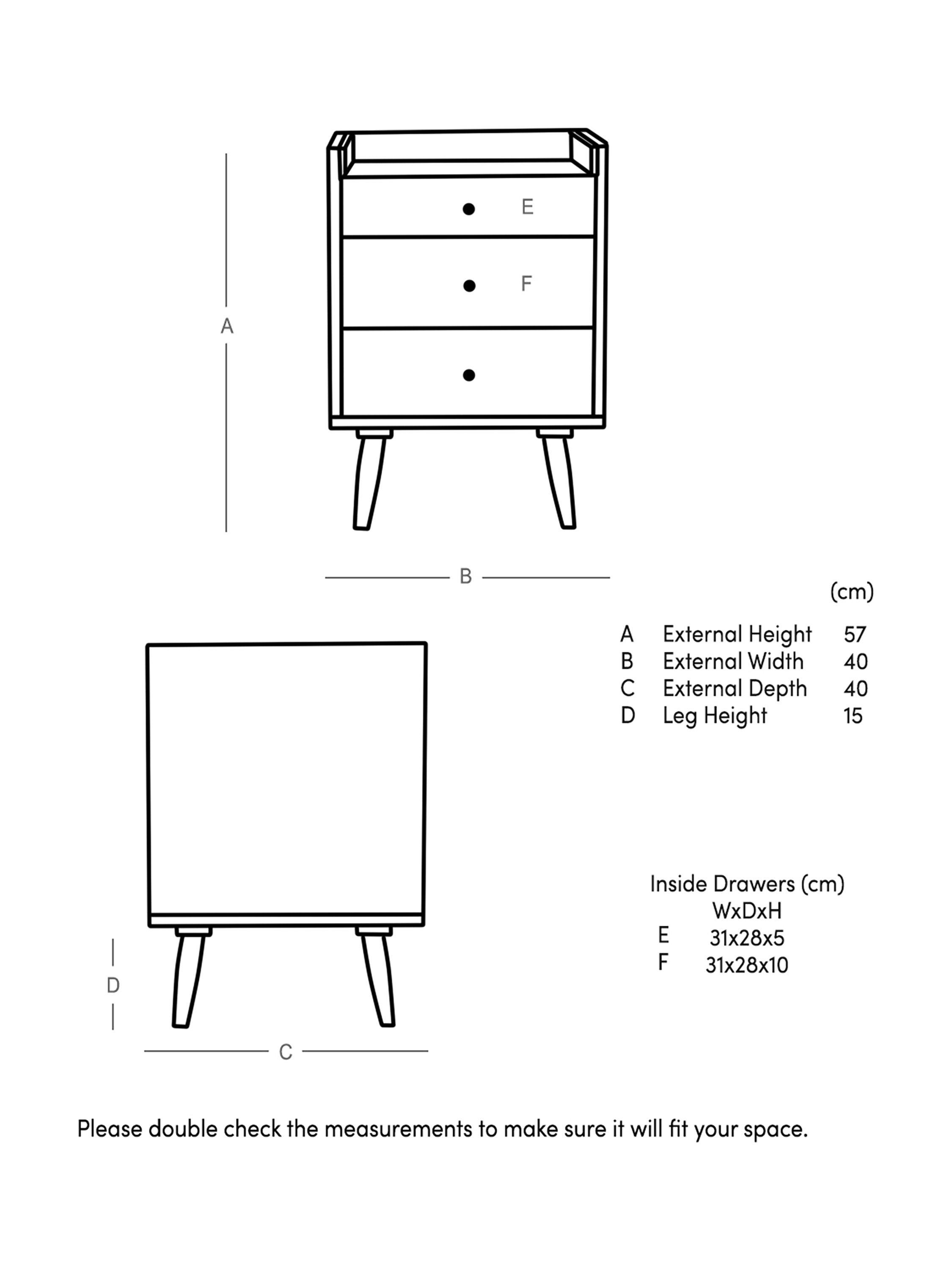 - Top drawer: H5cm x W31cm x D28cm. Middle and bottom drawers: H10cm x W31cm x D28cm.