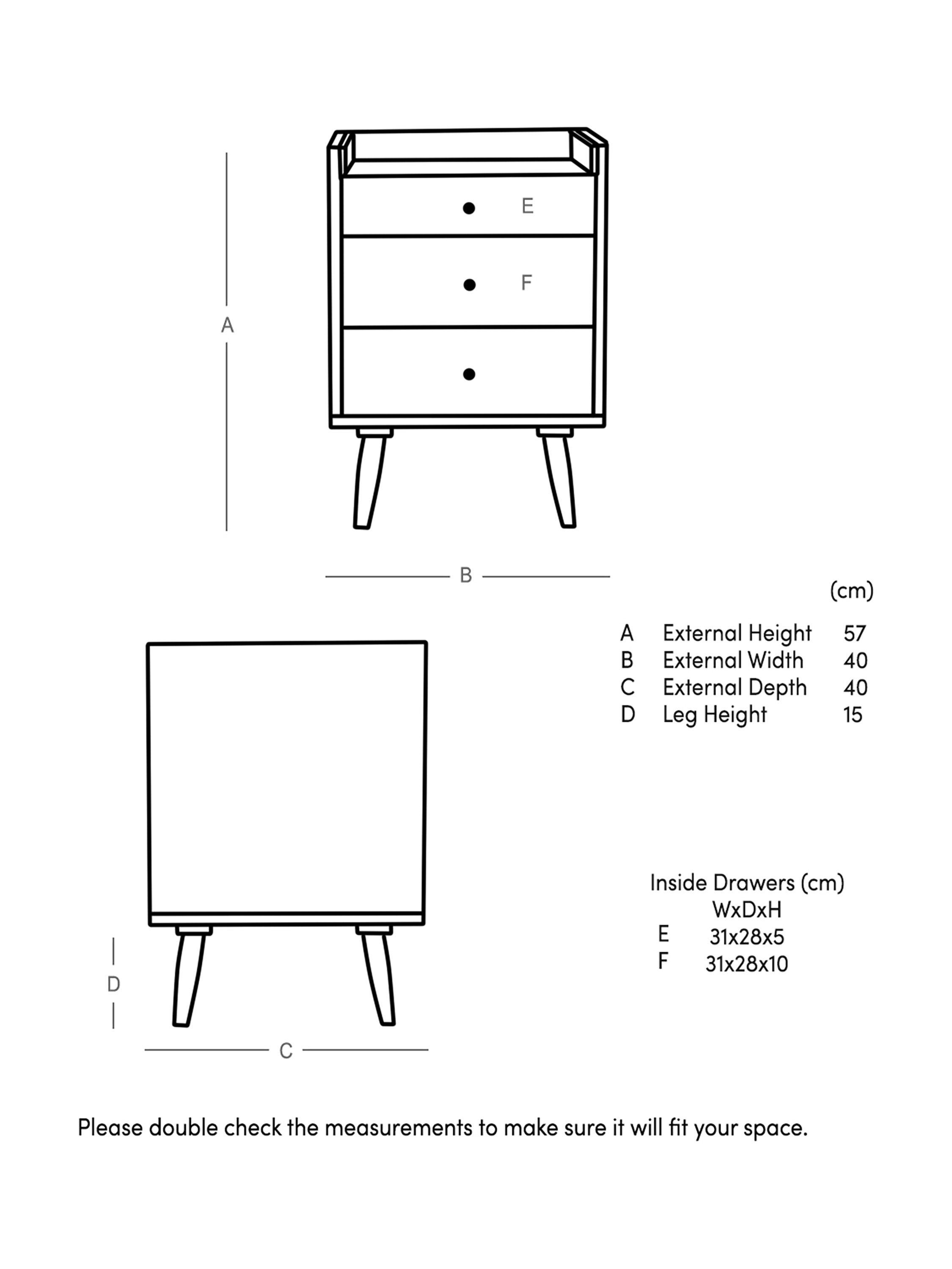- Top drawer: H5cm x W31cm x D28cm. Middle and bottom drawers: H10cm x W31cm x D28cm.