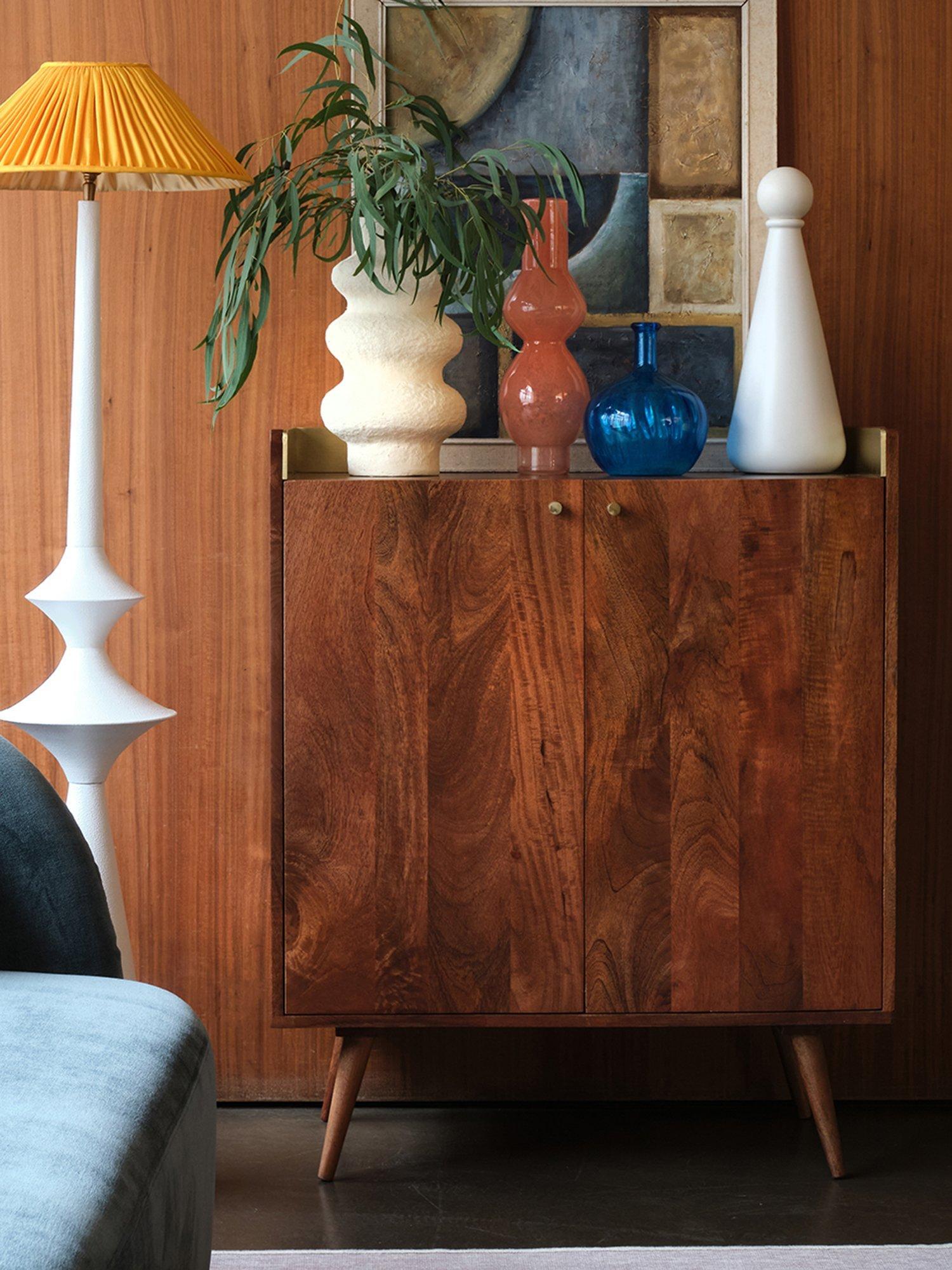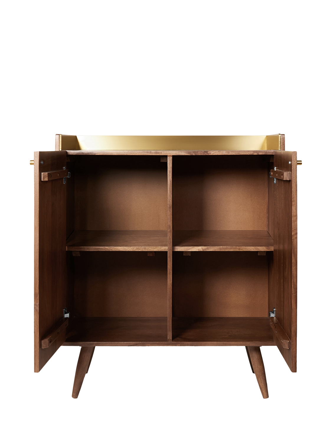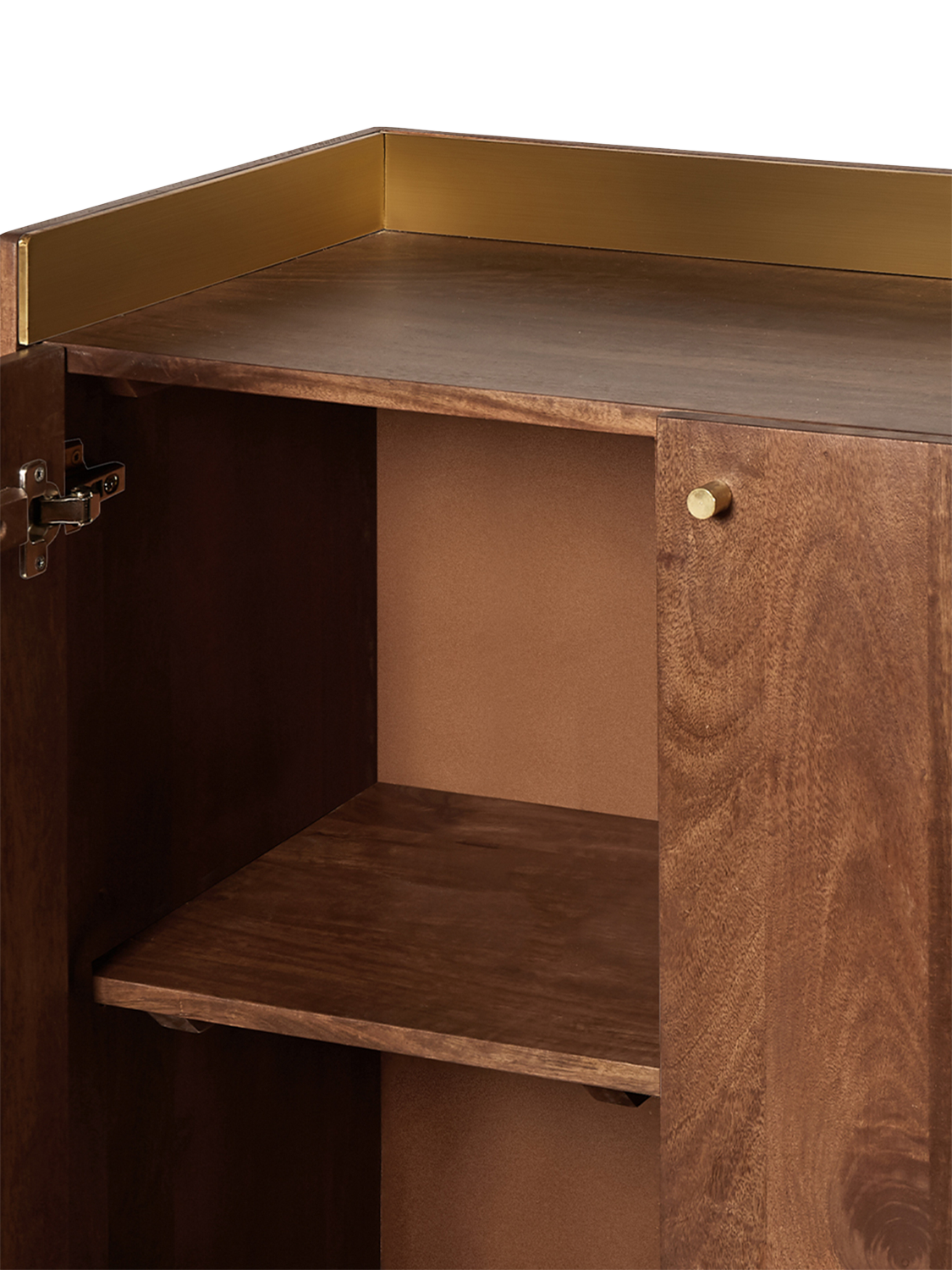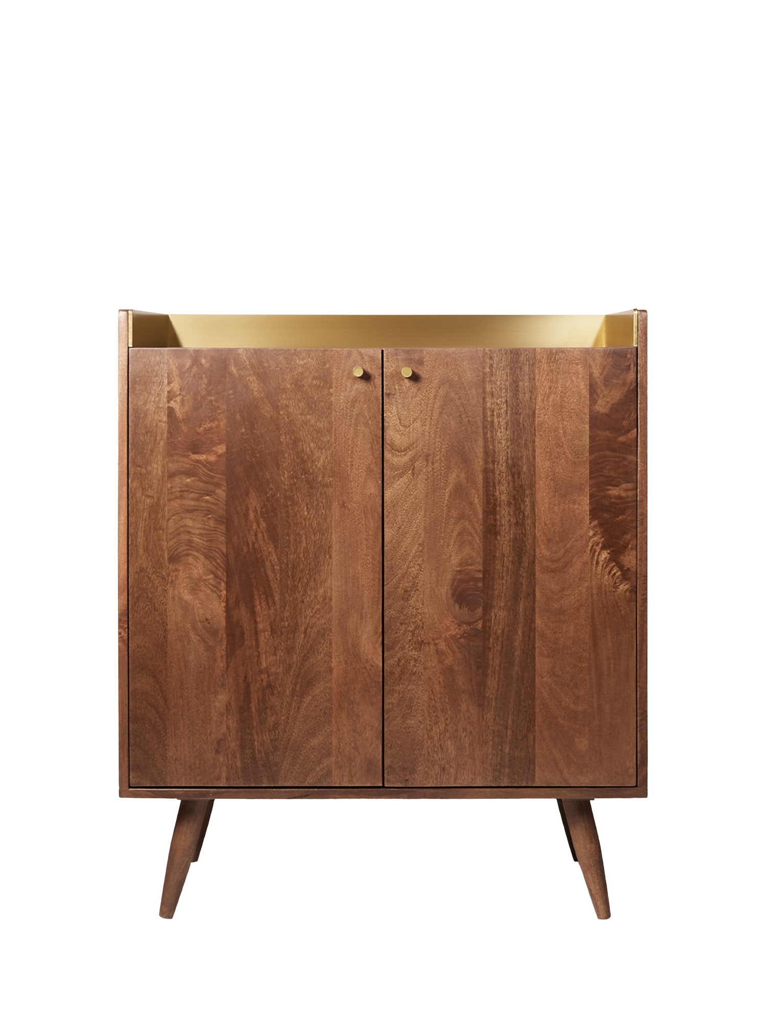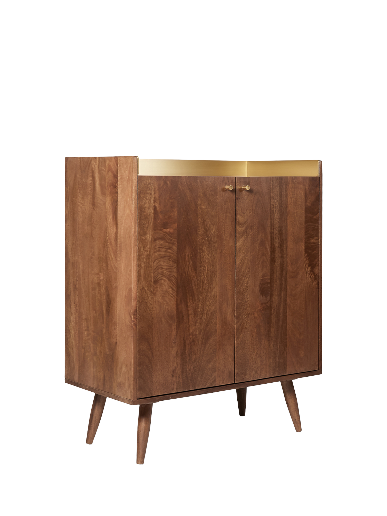 - Materials: mango wood body, doors, shelves, legs, engineered upstand, solid brass handles. Finish: wood stained in light brown, brass-foiled upstand, polished brass handles