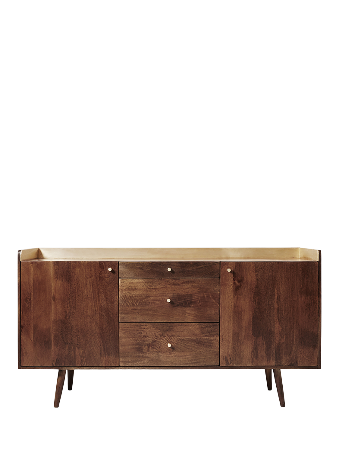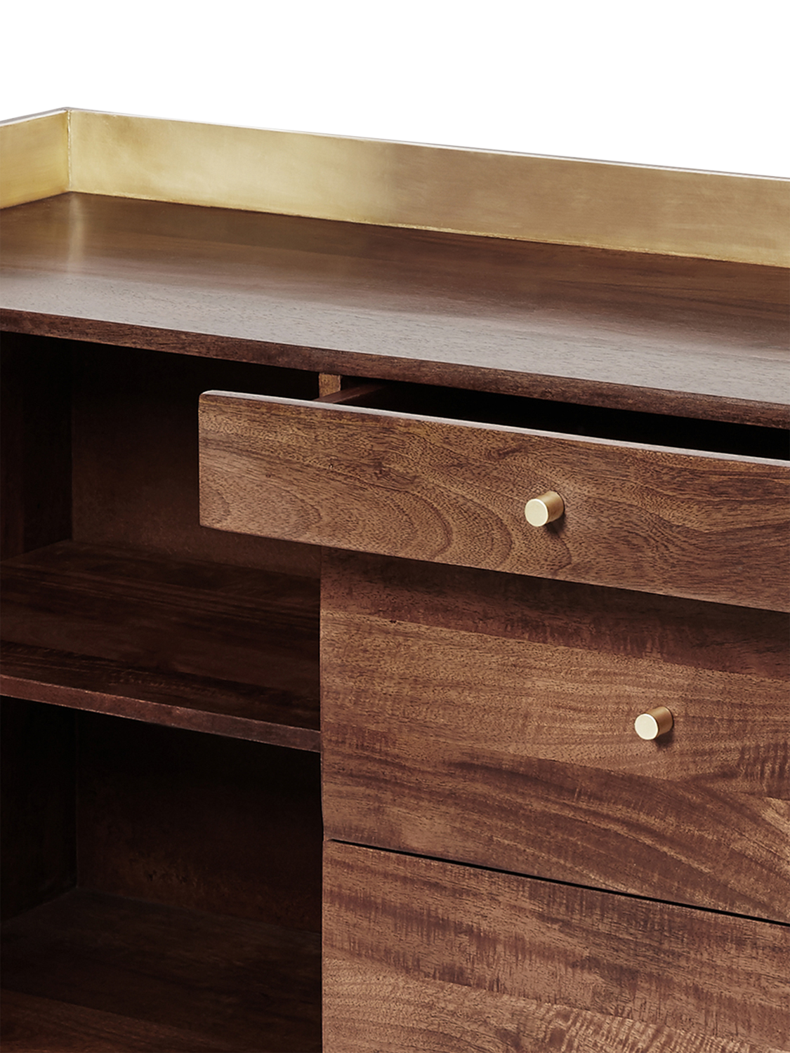 - Carcase, Doors, Shelves, Drawers, Drawer Boxes & Legs Assemblies: Mango, Light Brown. Contrast Upstand: .38ga Brass Foiled MDF, PU Lacquer: Pull Handles: Solid Brass, Polished: Carcass, Back Panel & Drawer Base: MDF, Stained to match timber