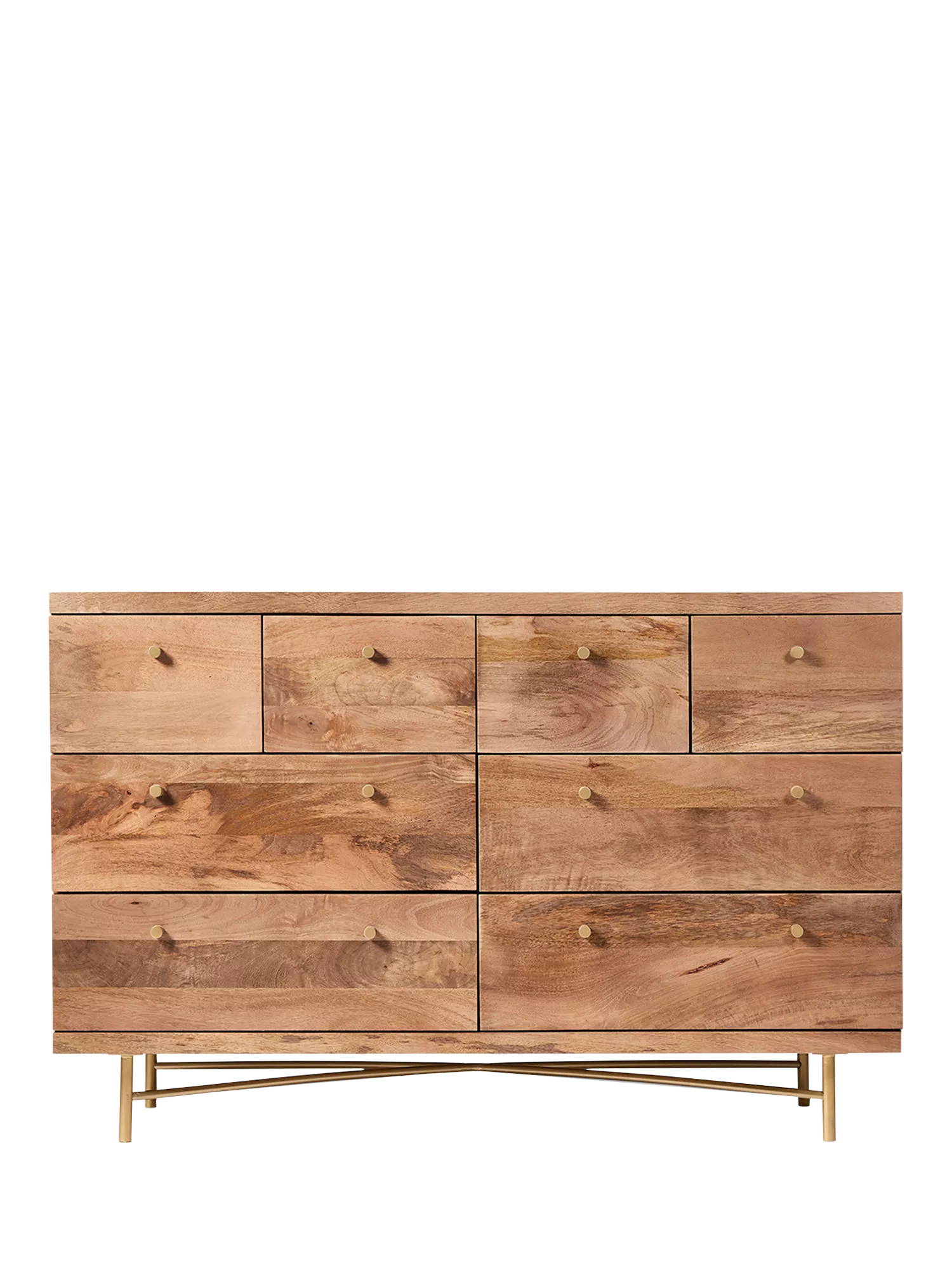 - Mango wood body, drawer fronts and boxes, steel framework and legs, brass handles, engineered body back panel