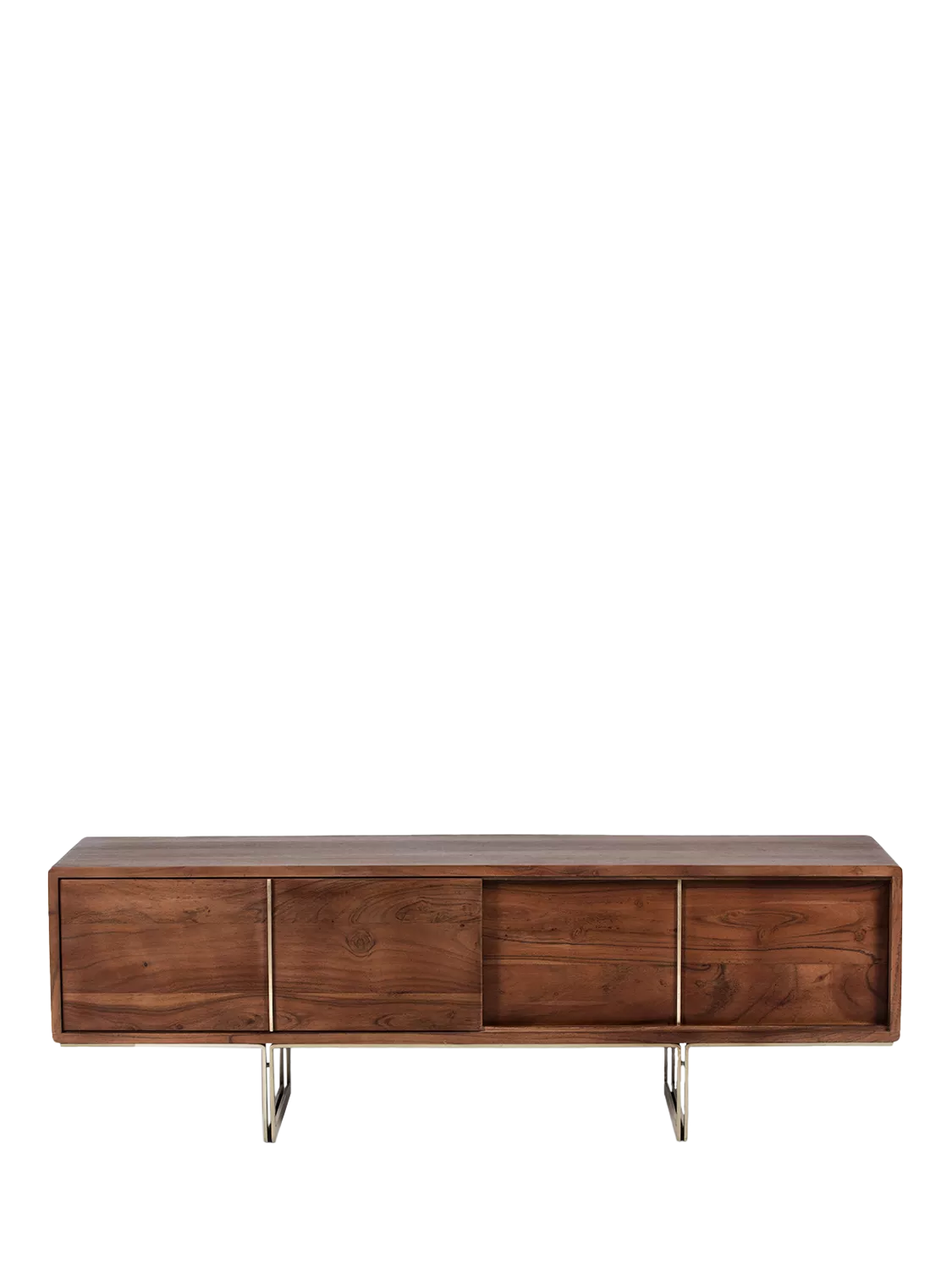 This media unit makes a centrepiece without taking over the whole living room, an effect achieved by combining rich acacia with fine brass lines.