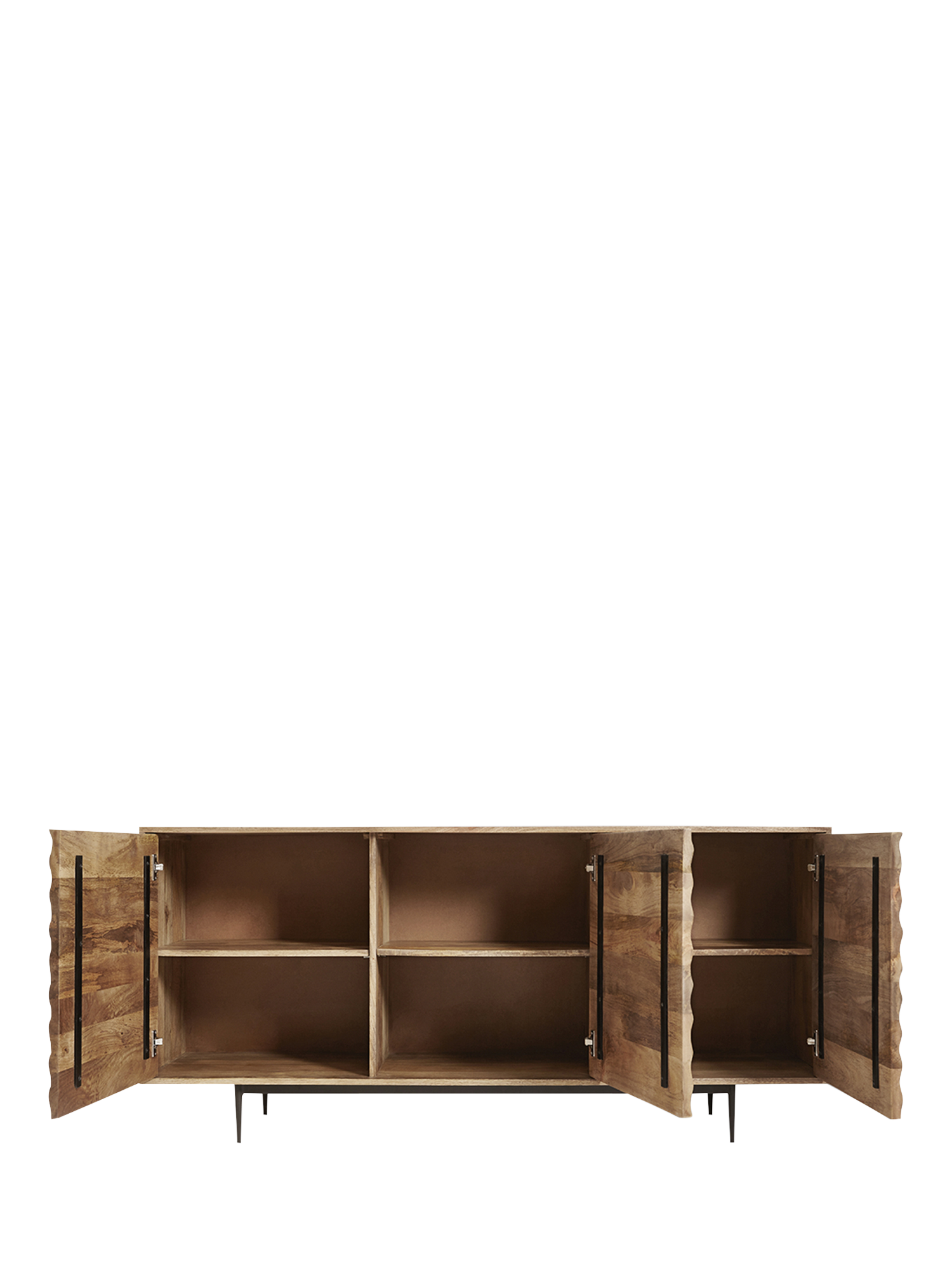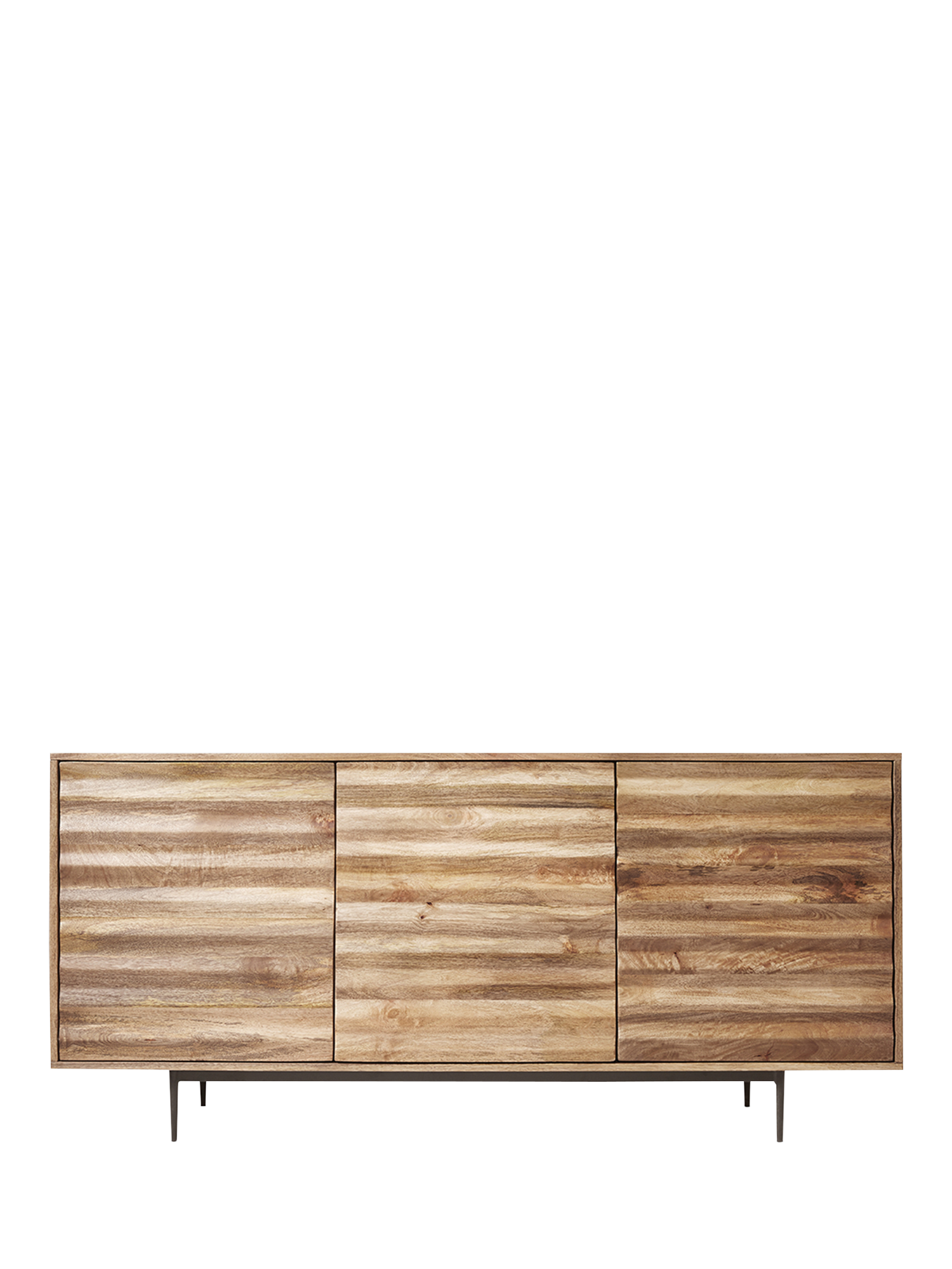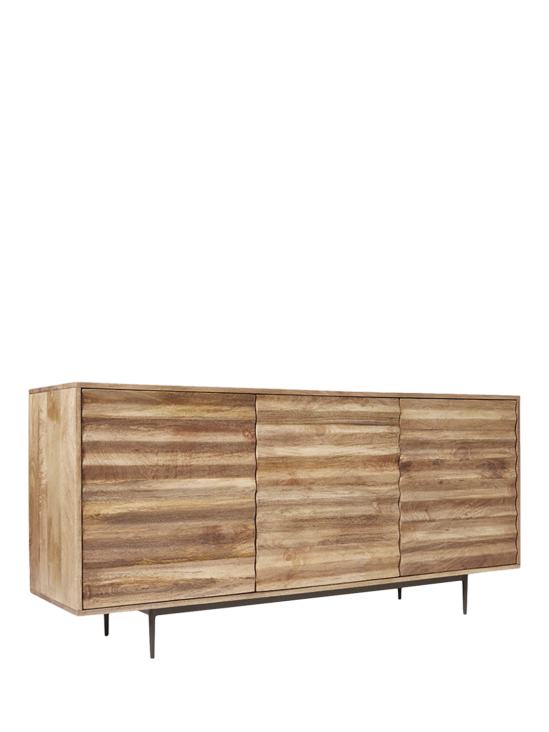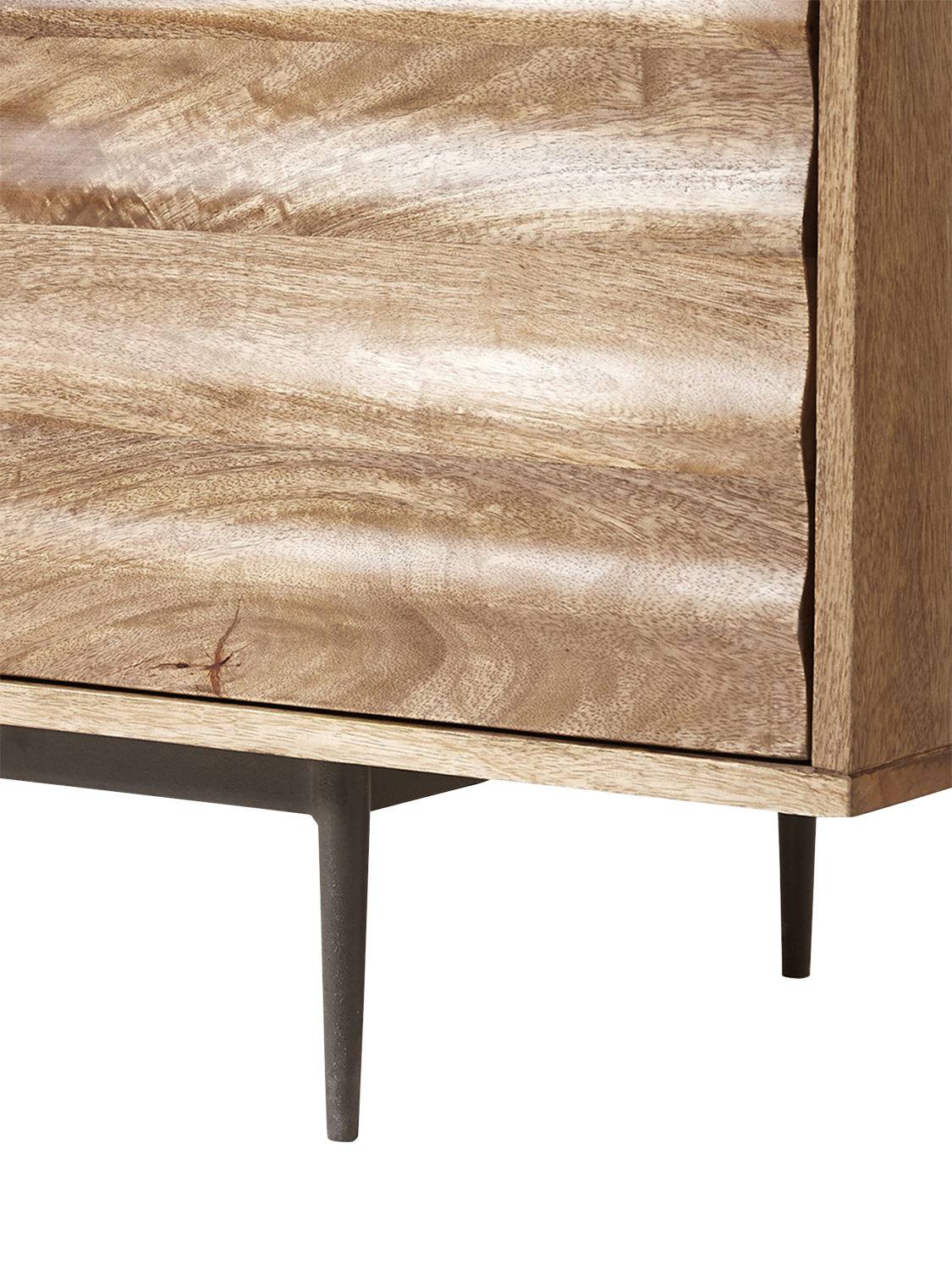 - Materials: mango wood body and doors, engineered back panel, steel legs. Finish: natural wood sealed with back panel stained to match, steel powder coated in matt Charcoal.